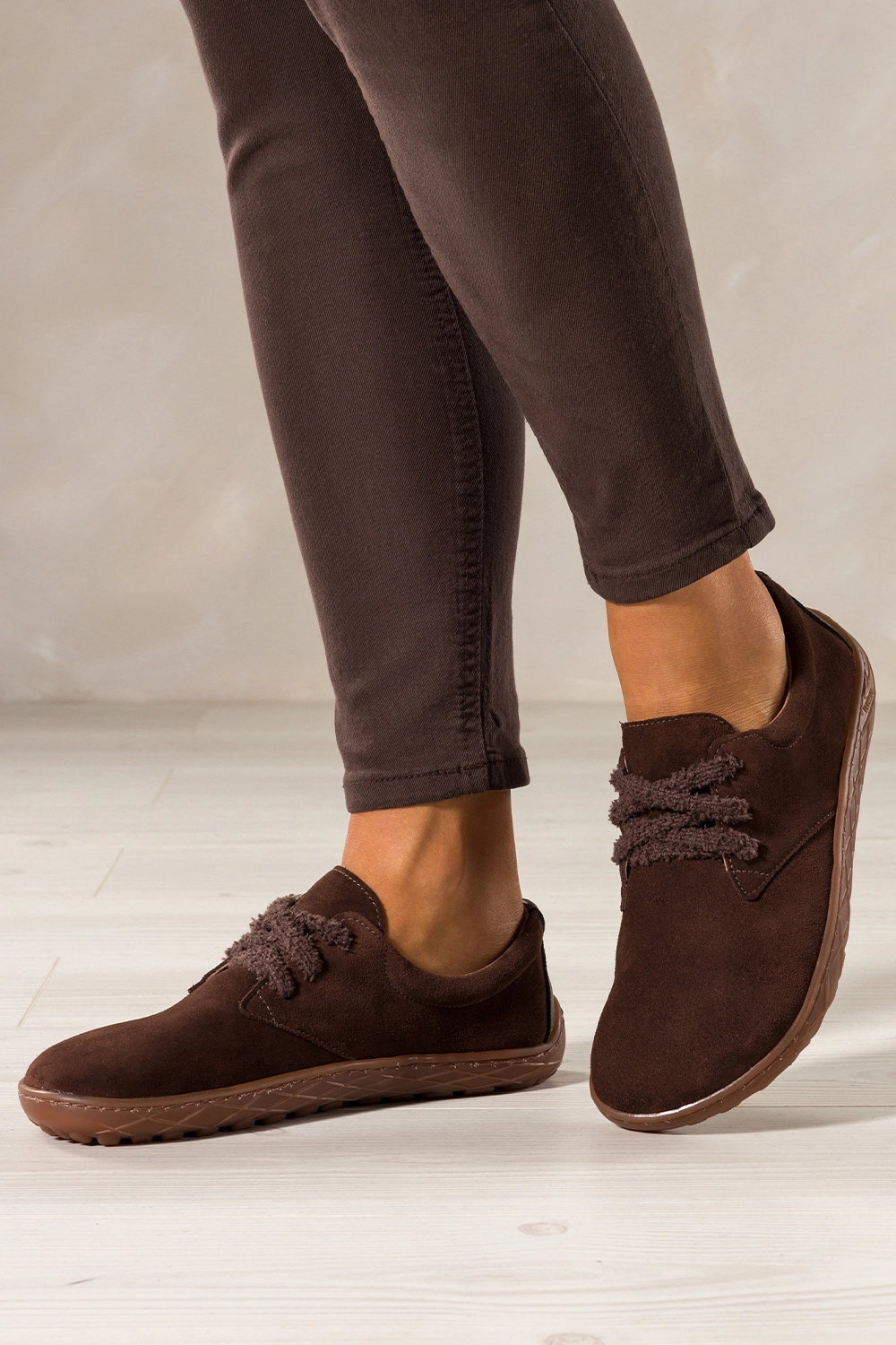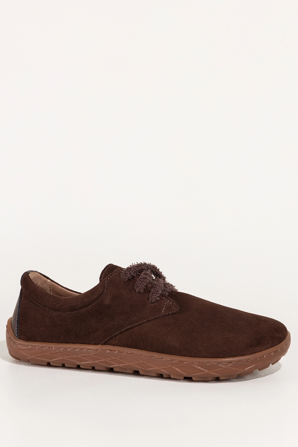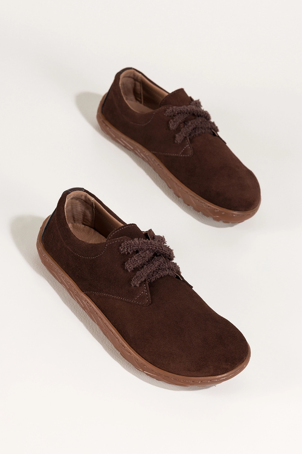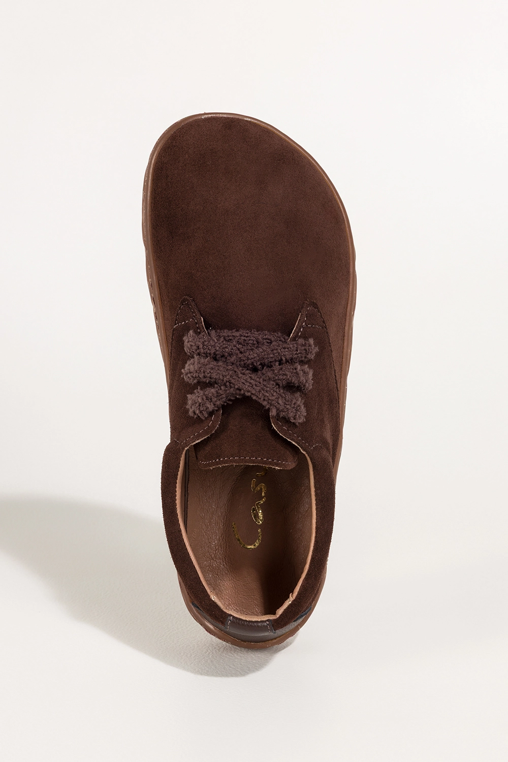 Czekoladowe buty barefoot skórzane zamszowe damskie szerokie na elastycznej płaskiej podeszwie puszyste sznurówki PRODUKT POLSKI Casu model 89811, połączenie wysokogatunkowej skóry zamszowej z precyzją polskiego rzemiosła. Miękka, oddychająca skórzana wkładka oraz szeroki, zaokrąglony nosek zapewniają stopom pełną swobodę ruchu i komfort nawet podczas całodziennego noszenia. Płaska, elastyczna podeszwa wspiera naturalne ułożenie stopy, dzięki czemu każdy krok staje się lekki i zdrowy.