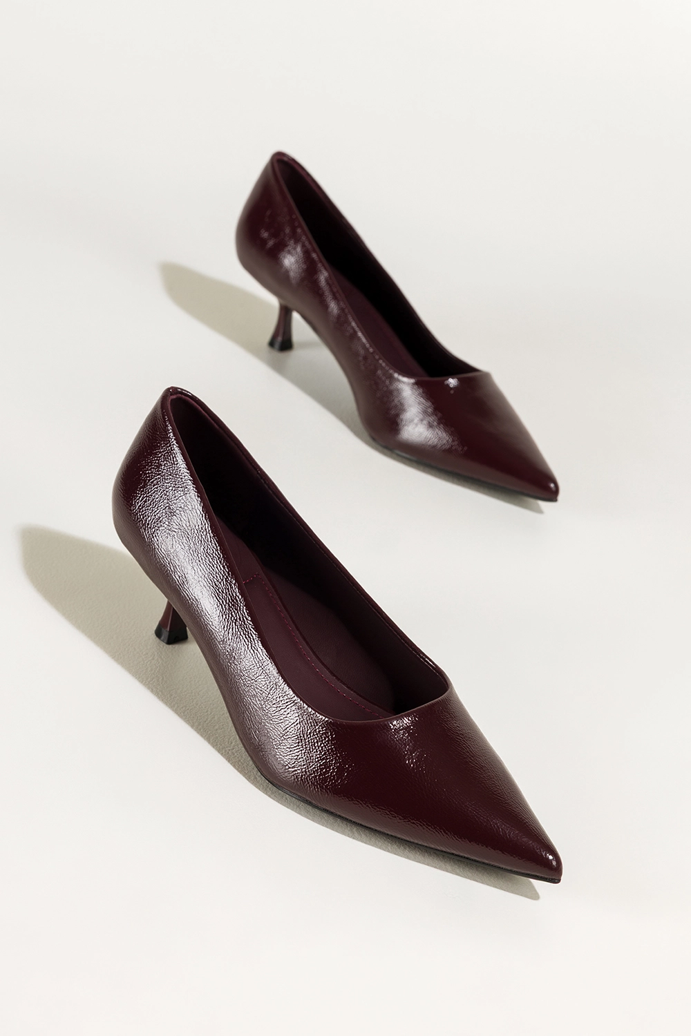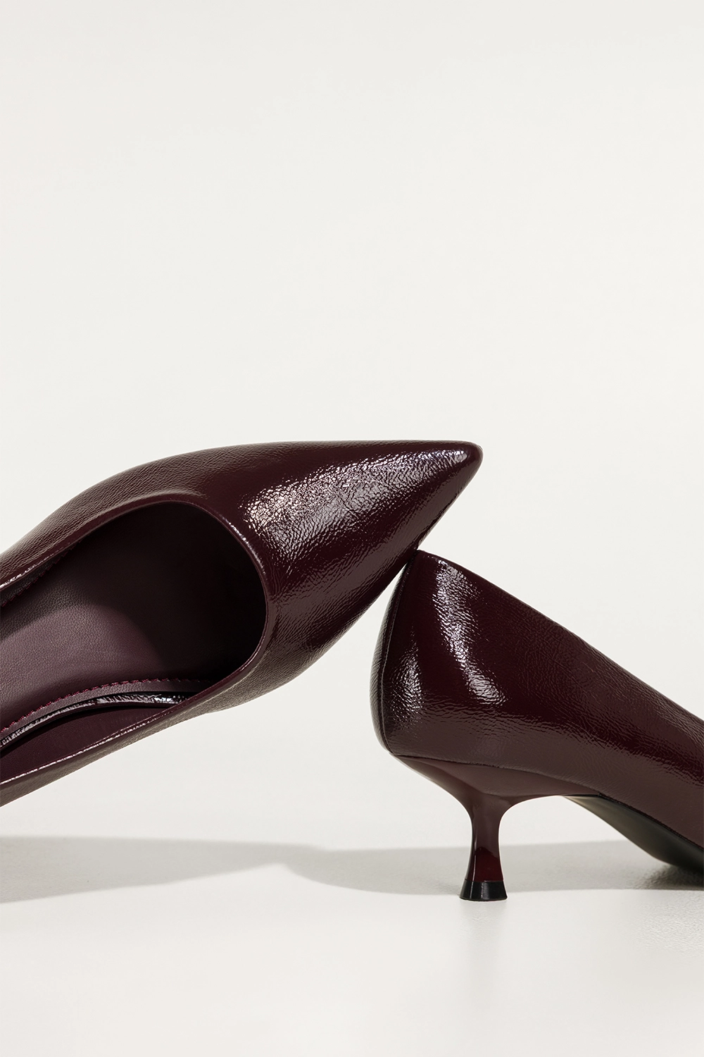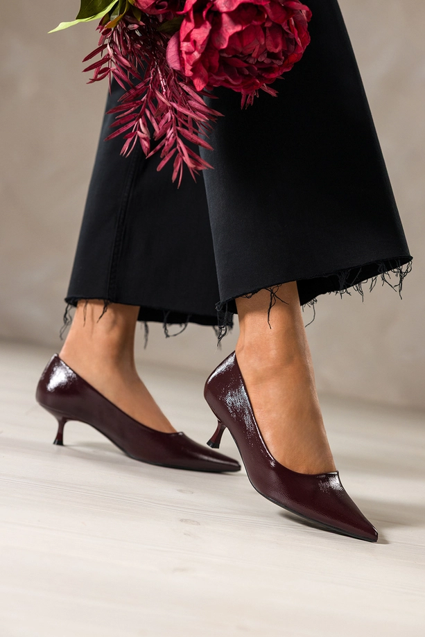 Obcas typu kieliszek nadaje sylwetce smukłości, a jednocześnie zapewnia stabilność i wygodę. Szpiczasty nosek optycznie wydłuża nogi, dodając subtelnej zmysłowości. Lakierowana powierzchnia w głębokim, bordowym odcieniu sprawia, że buty przyciągają spojrzenia i świetnie komponują się zarówno z klasyczną sukienką, jak i nowoczesnym garniturem. To doskonały wybór na wesele, spotkanie biznesowe czy wieczorne wyjście, uniwersalność, która nigdy nie wychodzi z mody.