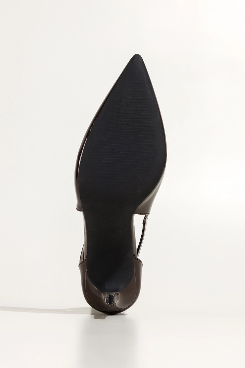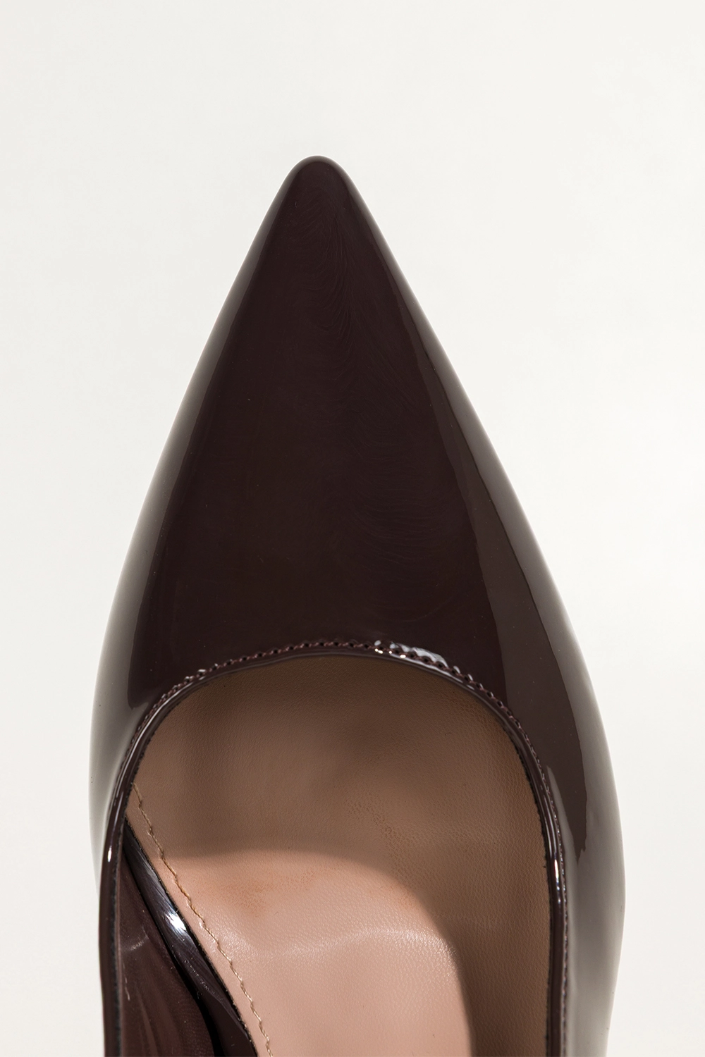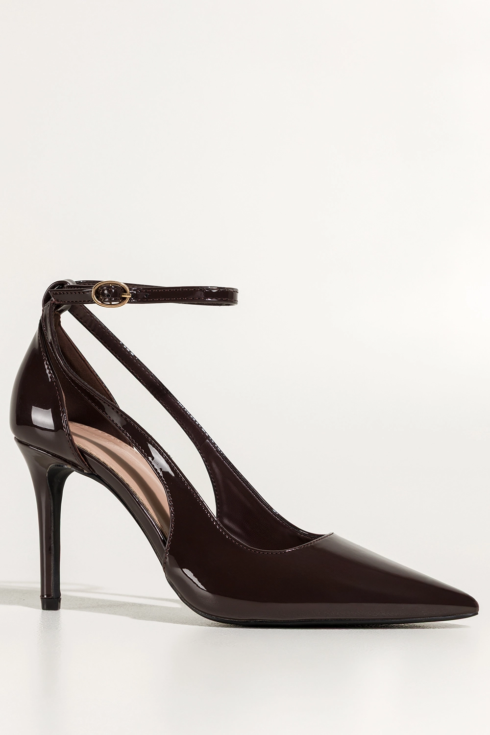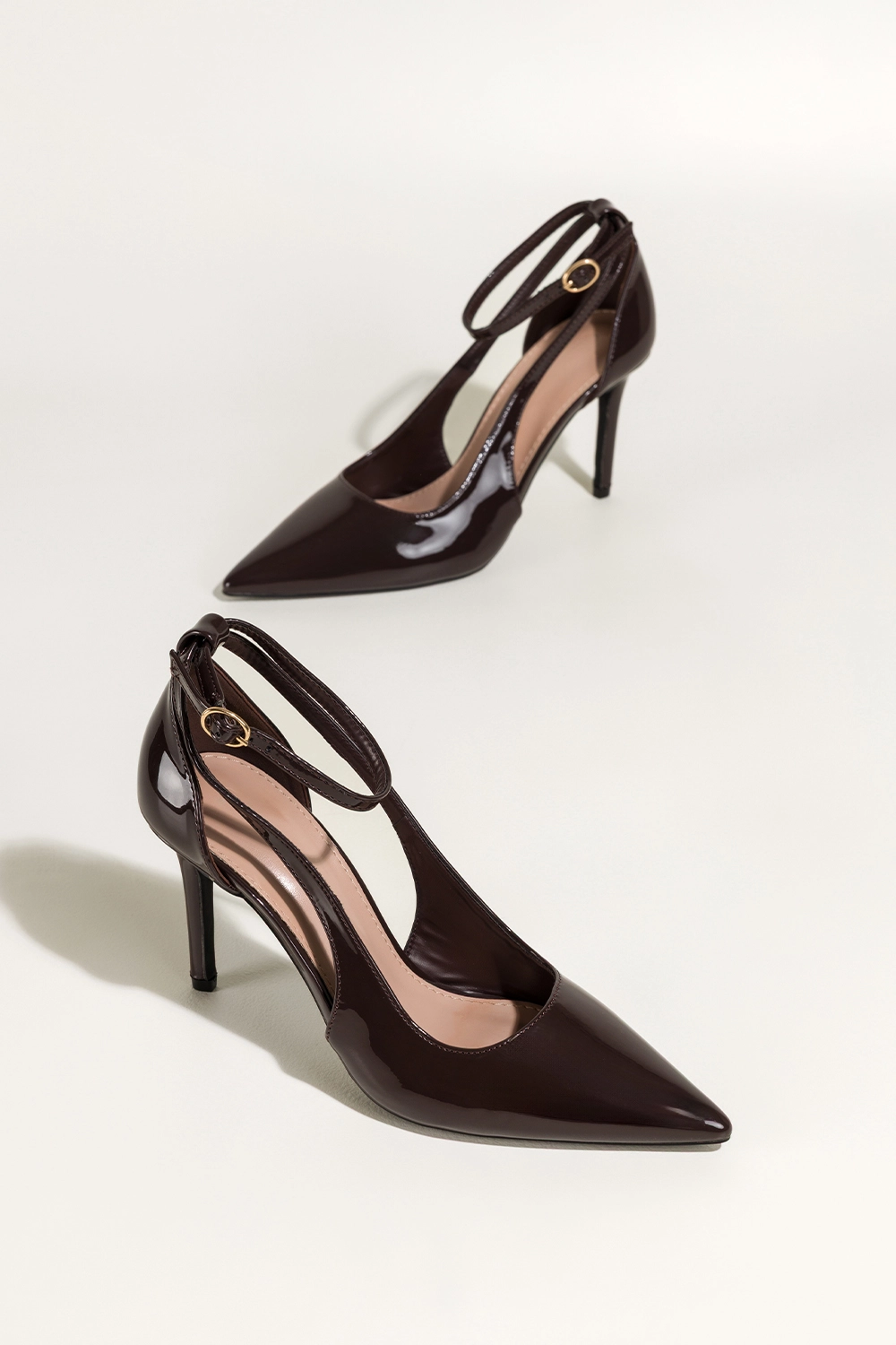 Czekoladowe czółenka damskie lakierowane szpilki wycięcia na cholewce pasek wokół kostki Carla model 641-8. Wykonane z wysokogatunkowej, lakierowanej skóry ekologicznej o głębokim, czekoladowym połysku, zachwycają luksusowym wyglądem i perfekcyjnym wykończeniem. Miękka wkładka ze skóry ekologicznej zapewnia wygodę przez cały dzień, a smukły obcas typu szpilka pokryty tym samym materiałem co cholewka nadaje sylwetce zmysłowej lekkości i szyku.