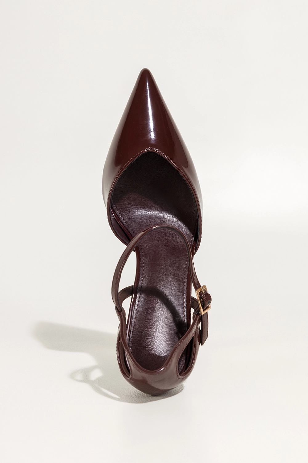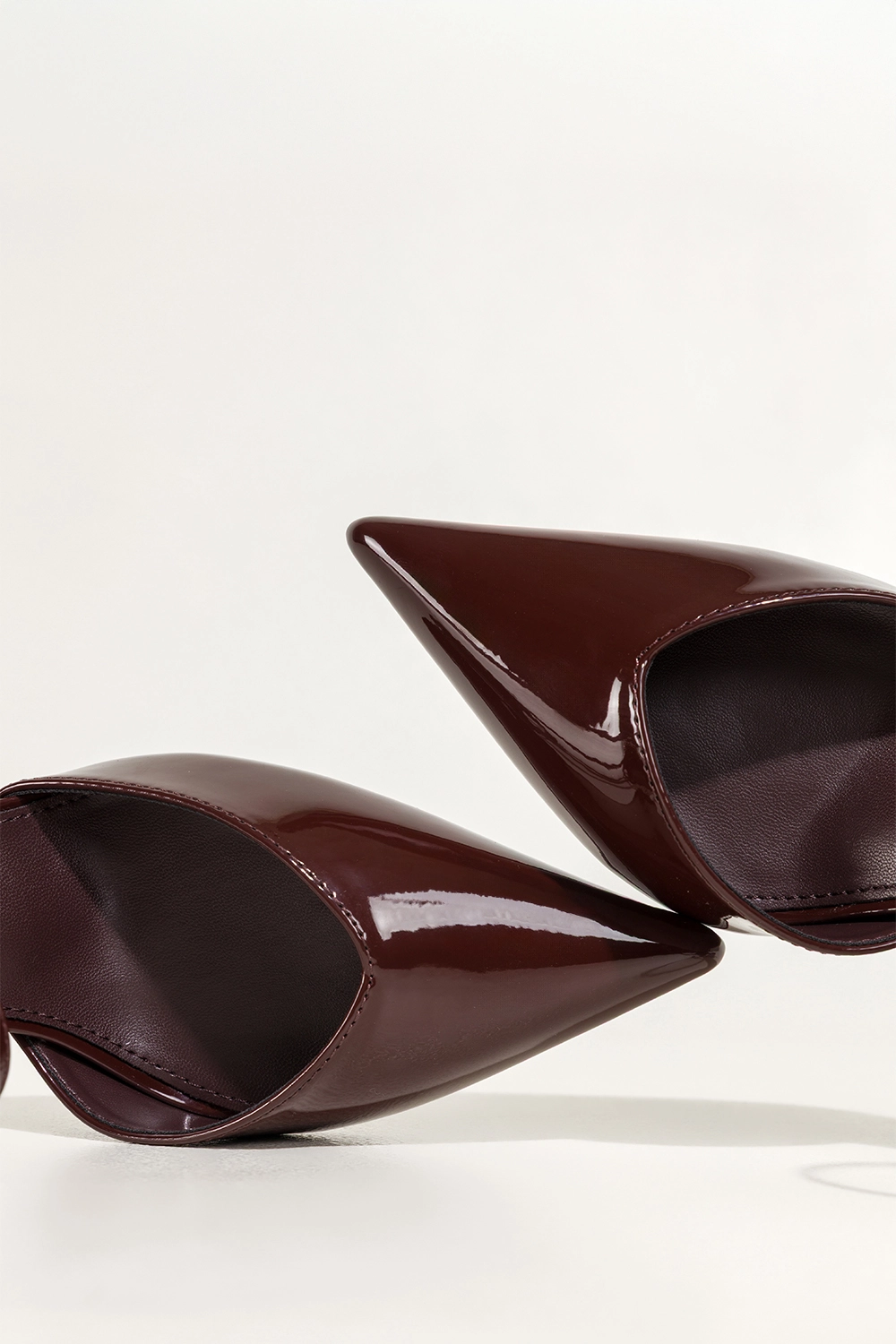 Czekoladowe czółenka damskie szpilki lakierowane z paskiem wycięcia na cholewce Carla model OV849. Połyskująca, lakierowana powierzchnia w głębokim odcieniu czekolady przyciąga wzrok, a szpiczasty nosek i ozdobnie wycięta cholewka dodają im lekkości. Delikatny pasek ze złotą klamerką subtelnie podkreśla linię stopy, tworząc zmysłową i harmonijną całość.