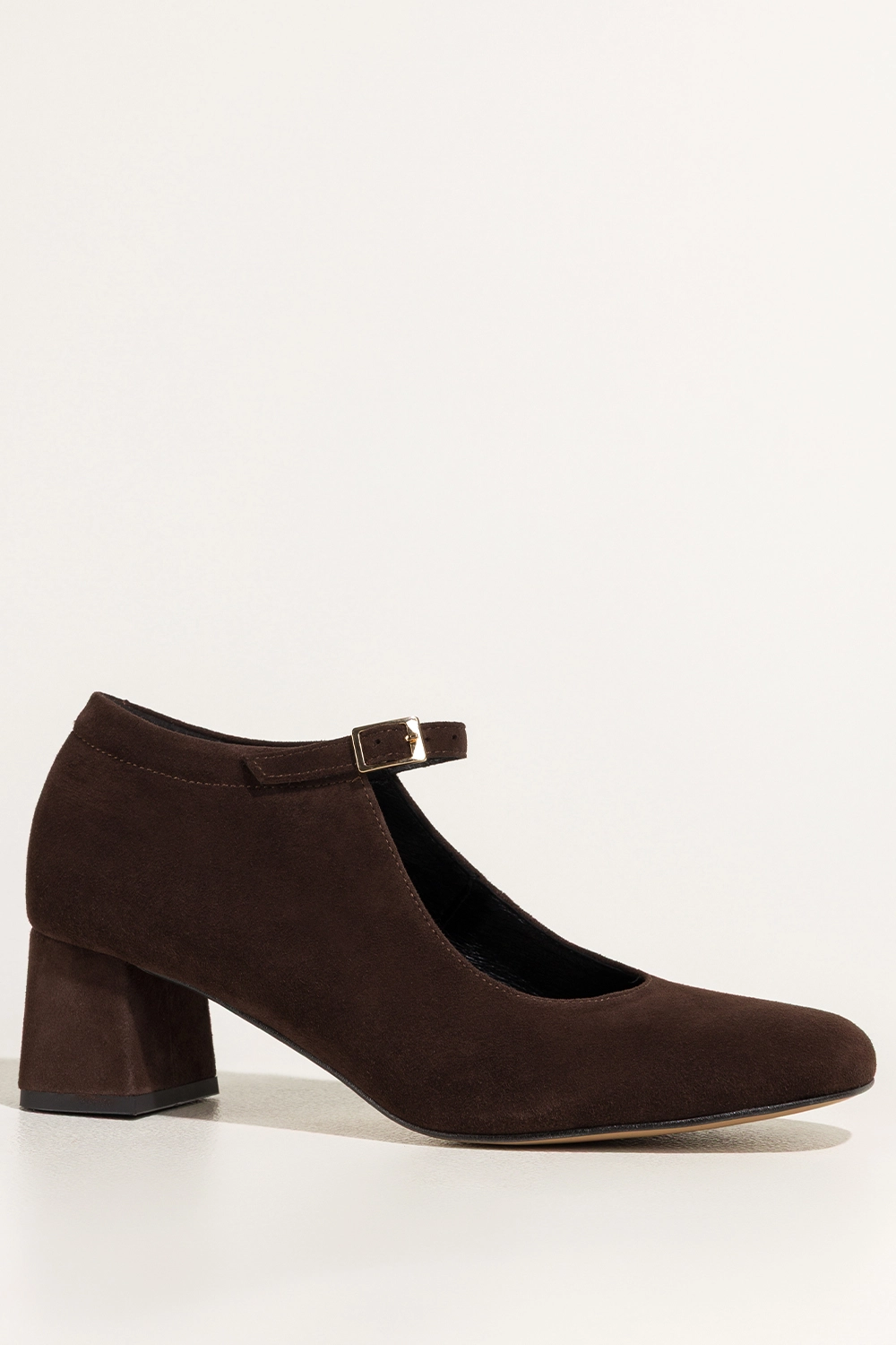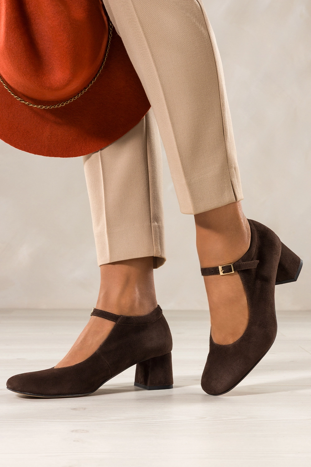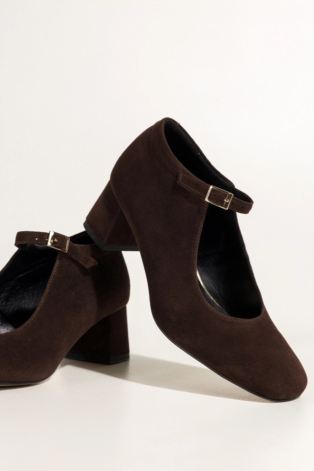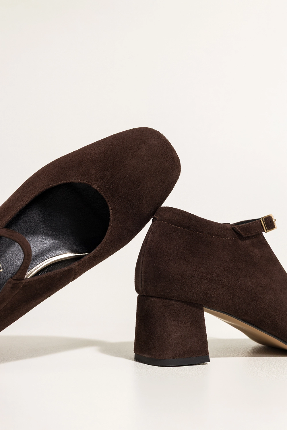 Kwadratowy nosek oraz fason Mary Jane z paskiem i elegancką złotą klamerką nadają czółenkom ponadczasowego uroku. Głęboki czekoladowy odcień skóry zamszowej doskonale współgra zarówno z jesiennymi płaszczami, jak i letnimi sukienkami. Buty idealnie komponują się z garderobą biurową, stylizacjami smart casual i eleganckimi wieczorowymi zestawami. Szeroki obcas typu klocek pokryty tą samą zamszową skórą gwarantuje stabilność i podkreśla wyrafinowany styl.