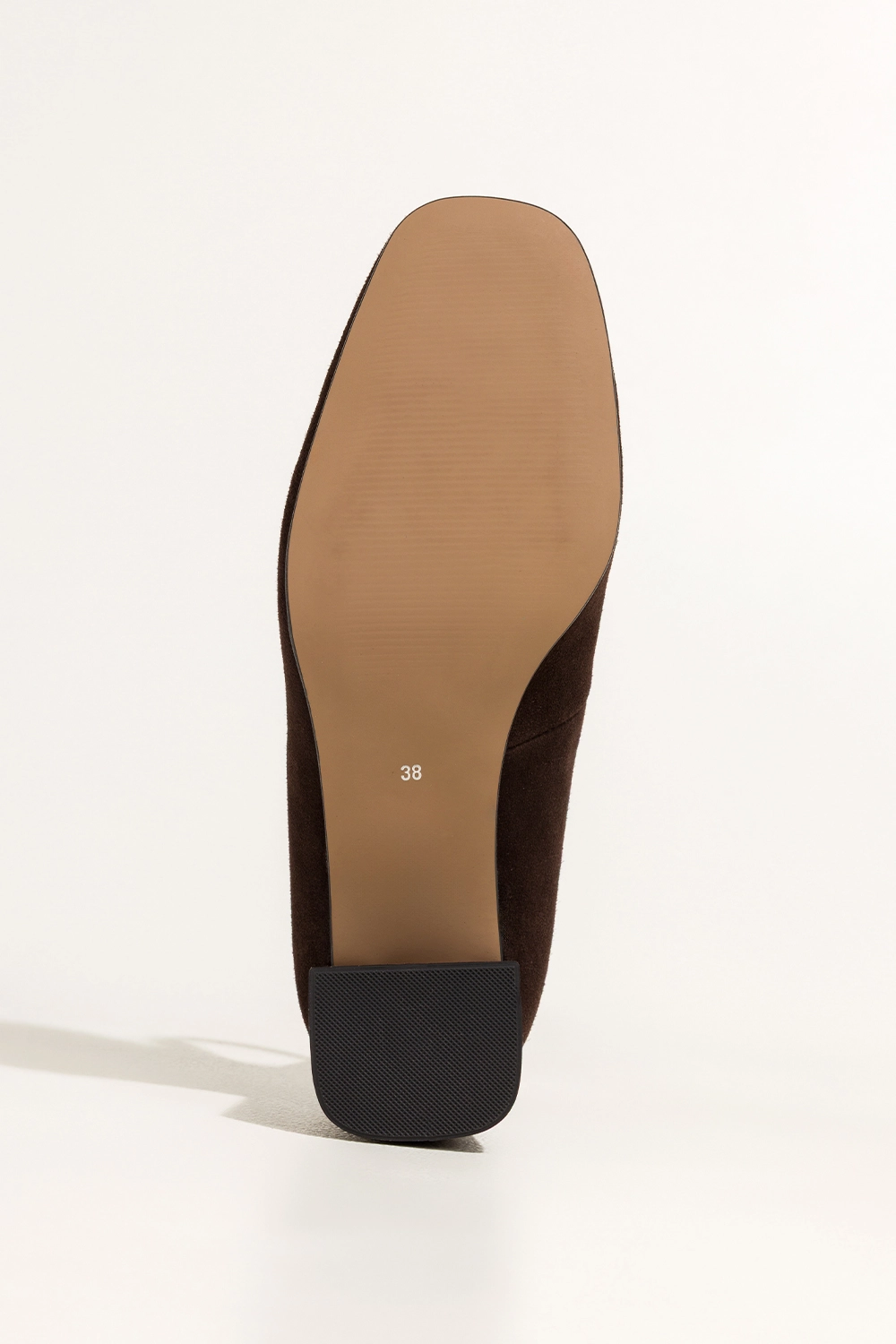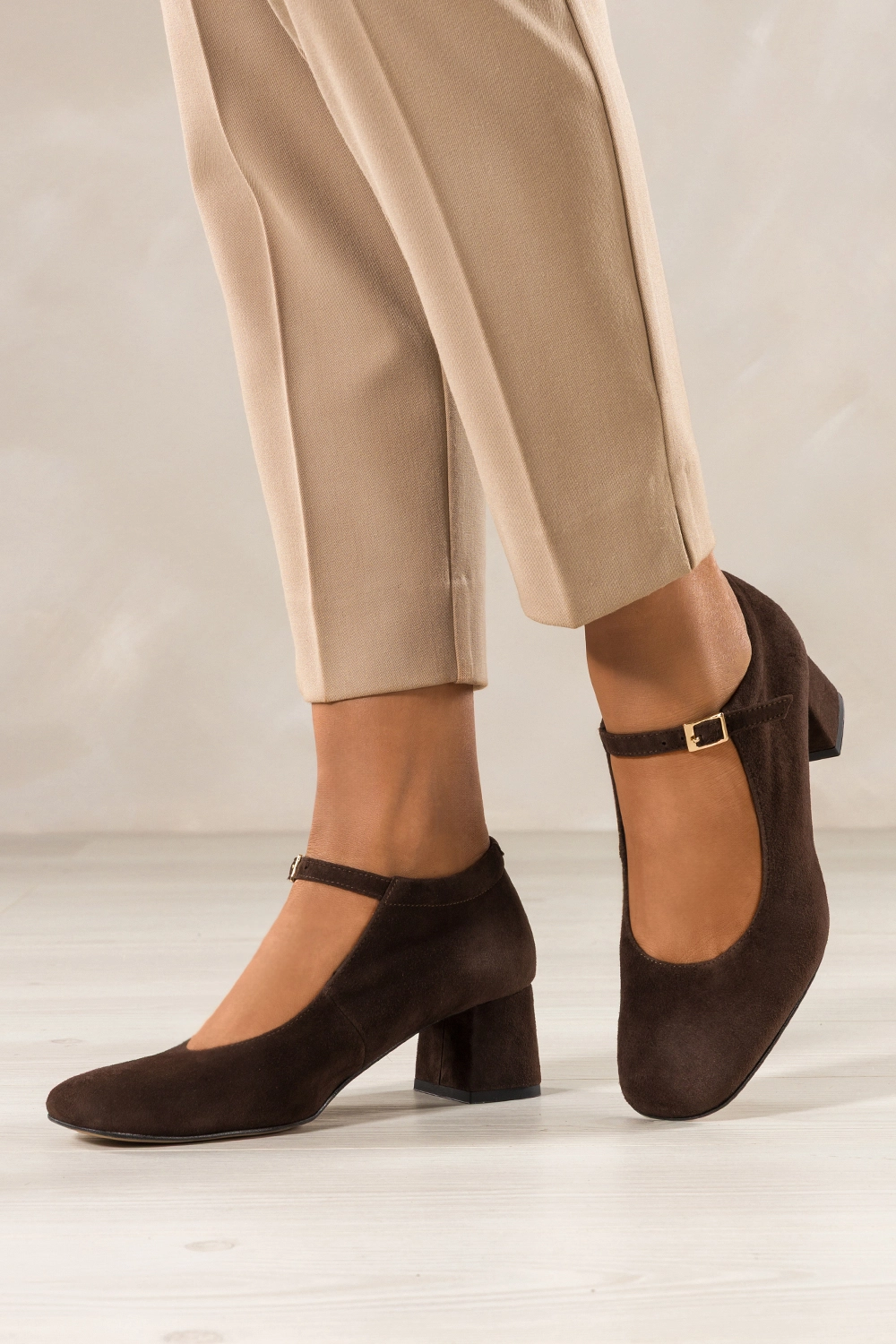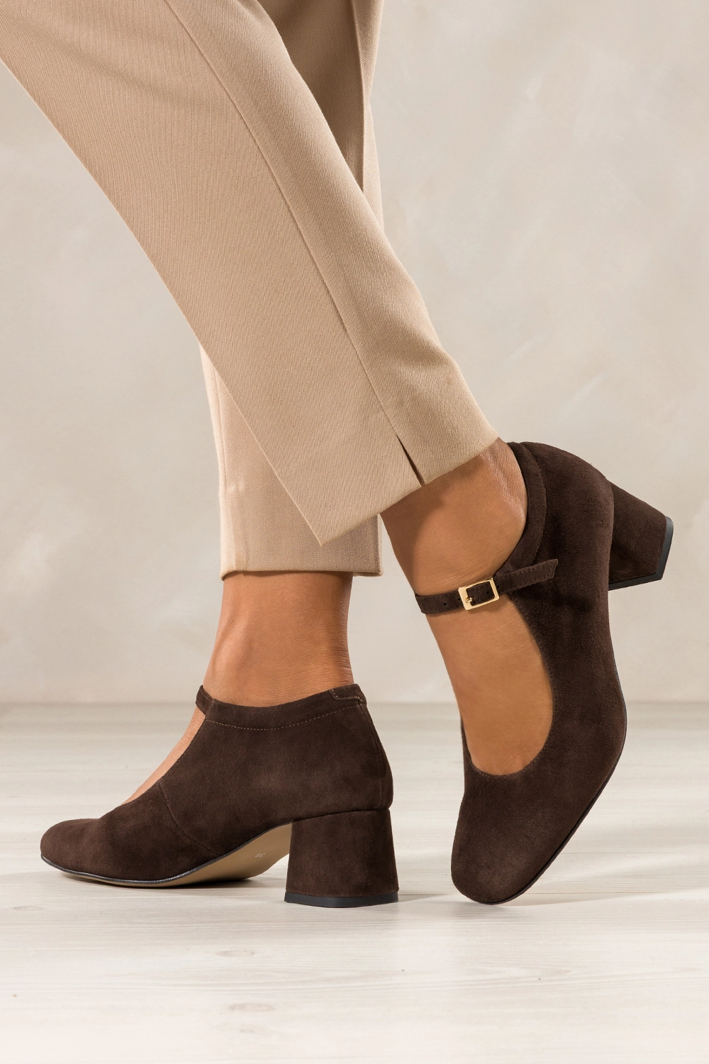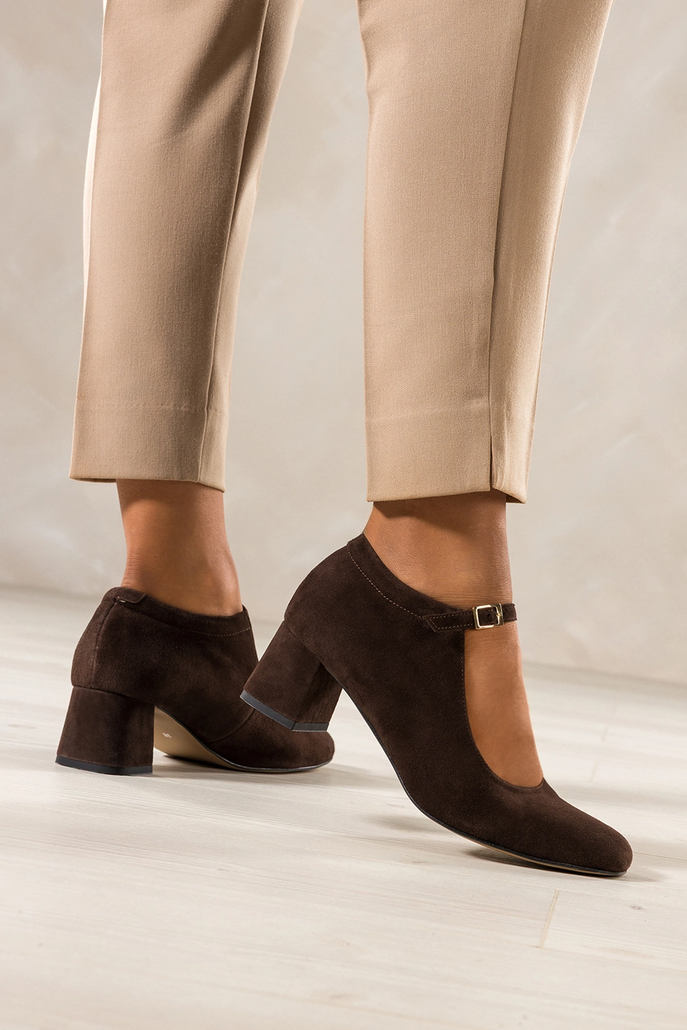 Kwadratowy nosek oraz fason Mary Jane z paskiem i elegancką złotą klamerką nadają czółenkom ponadczasowego uroku. Głęboki czekoladowy odcień skóry zamszowej doskonale współgra zarówno z jesiennymi płaszczami, jak i letnimi sukienkami. Buty idealnie komponują się z garderobą biurową, stylizacjami smart casual i eleganckimi wieczorowymi zestawami. Szeroki obcas typu klocek pokryty tą samą zamszową skórą gwarantuje stabilność i podkreśla wyrafinowany styl.