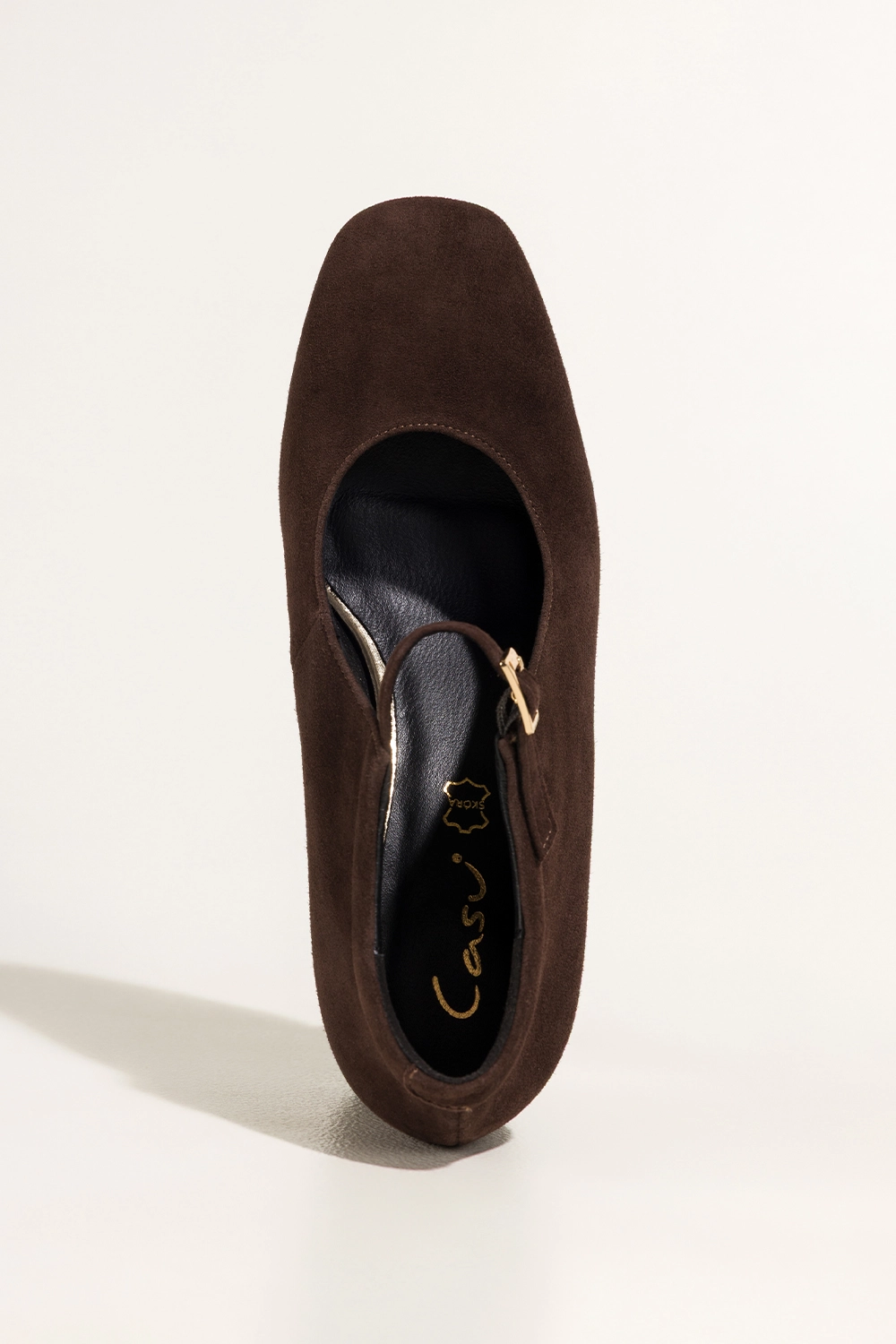 Czekoladowe czółenka skórzane damskie Mary Jane z paskiem na szerokim słupku PRODUKT POLSKI Casu model 7063-648. Wykonane z luksusowej, wysokogatunkowej zamszowej skóry, oferują miękkość i trwałość, której możesz zaufać. Naturalna skórzana wkładka dopasowuje się do stopy, zapewniając komfort noszenia nawet przez wiele godzin.