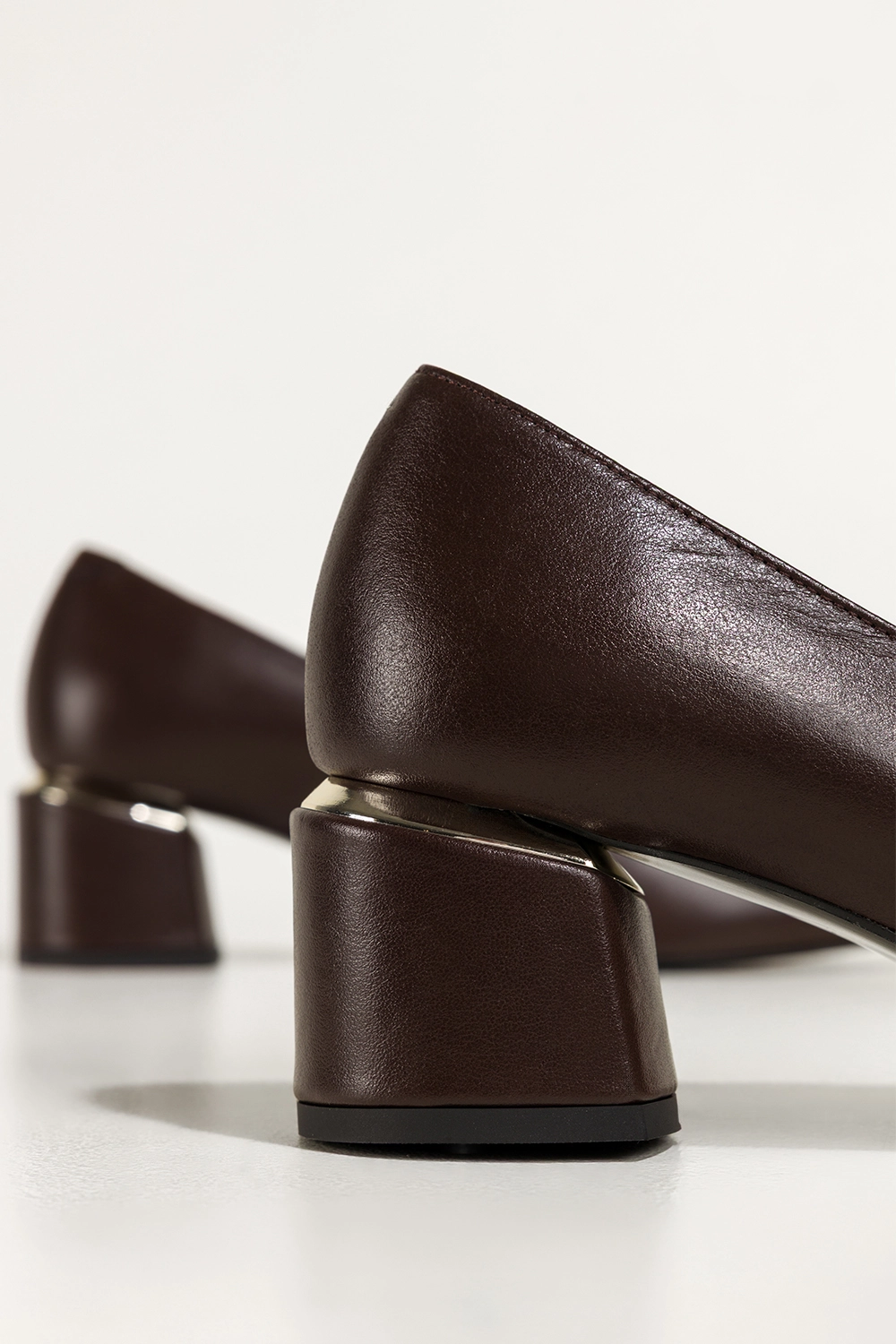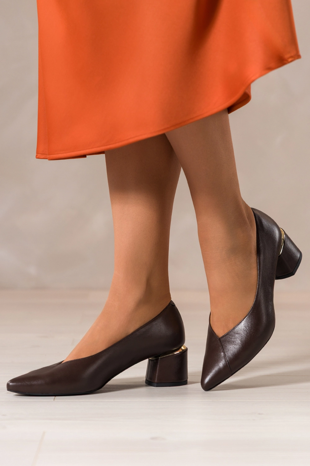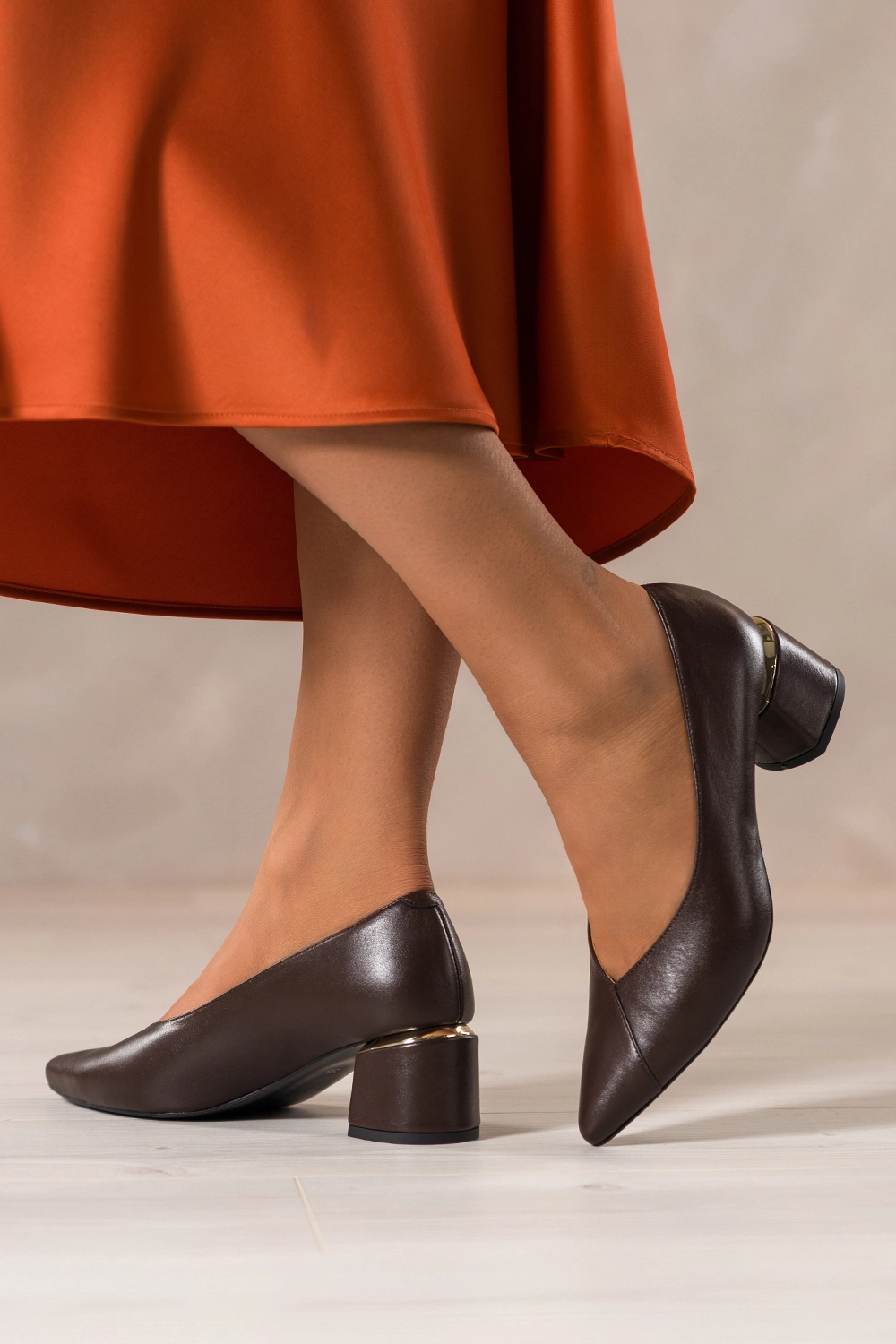 Czekoladowe czółenka skórzane damskie na szerokim ozdobnym obcasie PRODUKT POLSKI Casu model 7979-704, to idealne połączenie klasyki i nowoczesności. Wykonane z wysokogatunkowej skóry naturalnej, gwarantują wyjątkowy komfort noszenia i trwałość. Miękka, skórzana wkładka dopasowuje się do kształtu stopy, zapewniając wygodę nawet podczas wielogodzinnego użytkowania. Solidny obcas typu klocek, pokryty skórą i ozdobiony eleganckim, srebrnym akcentem, dodaje szyku i stabilności.