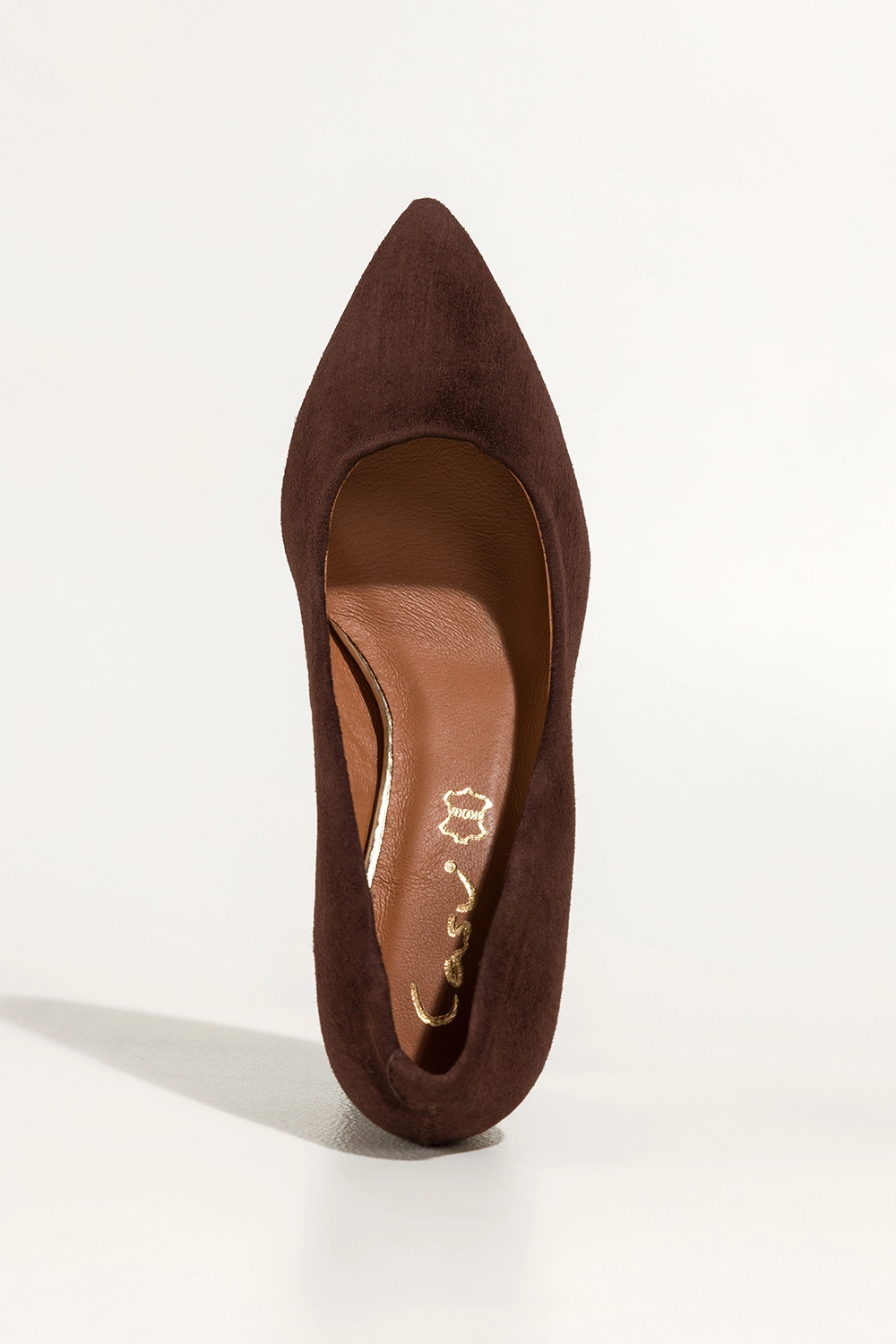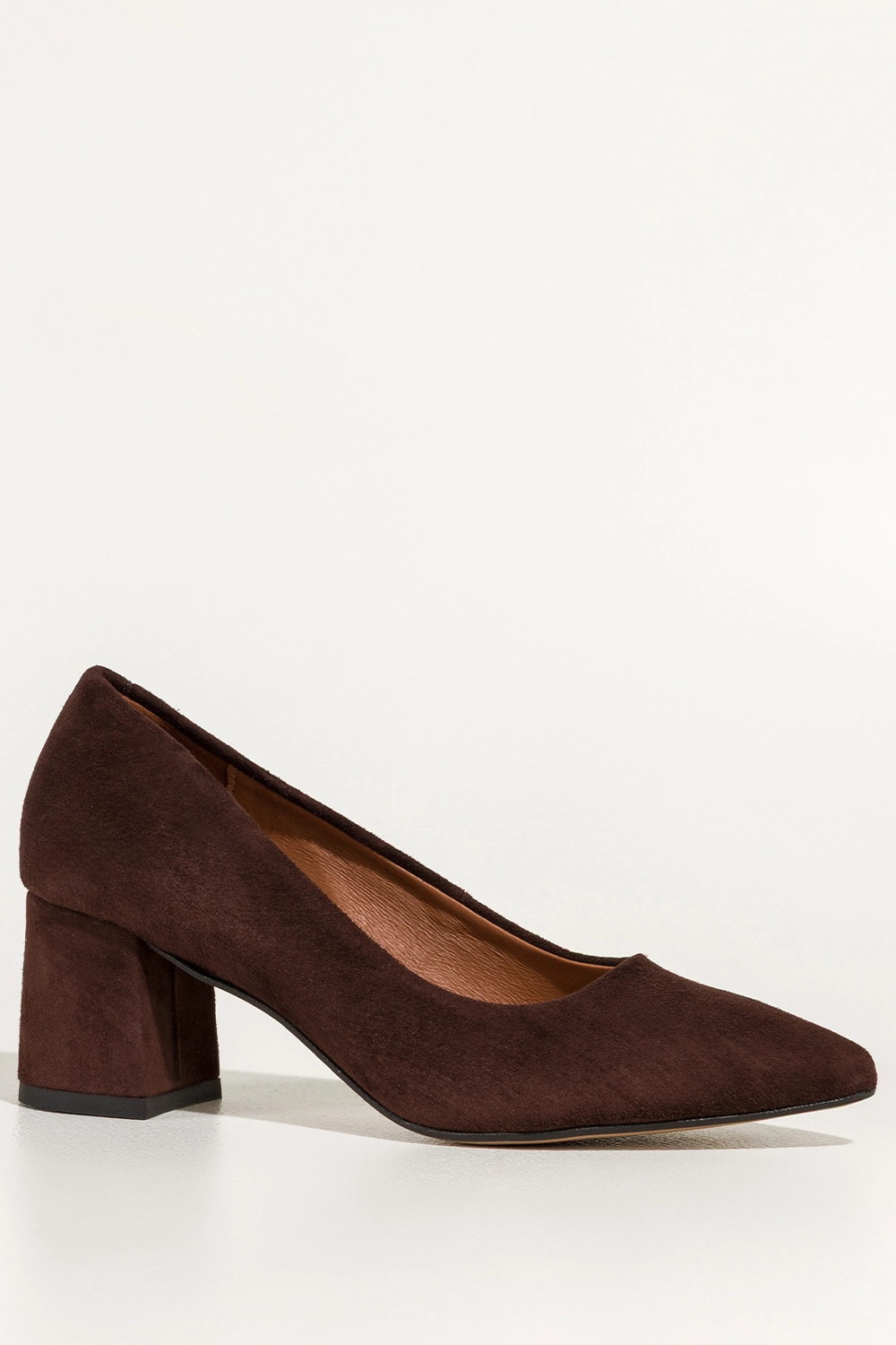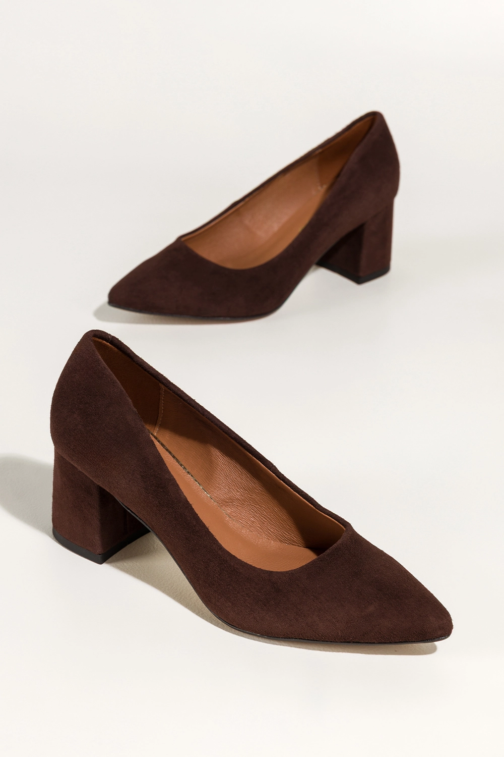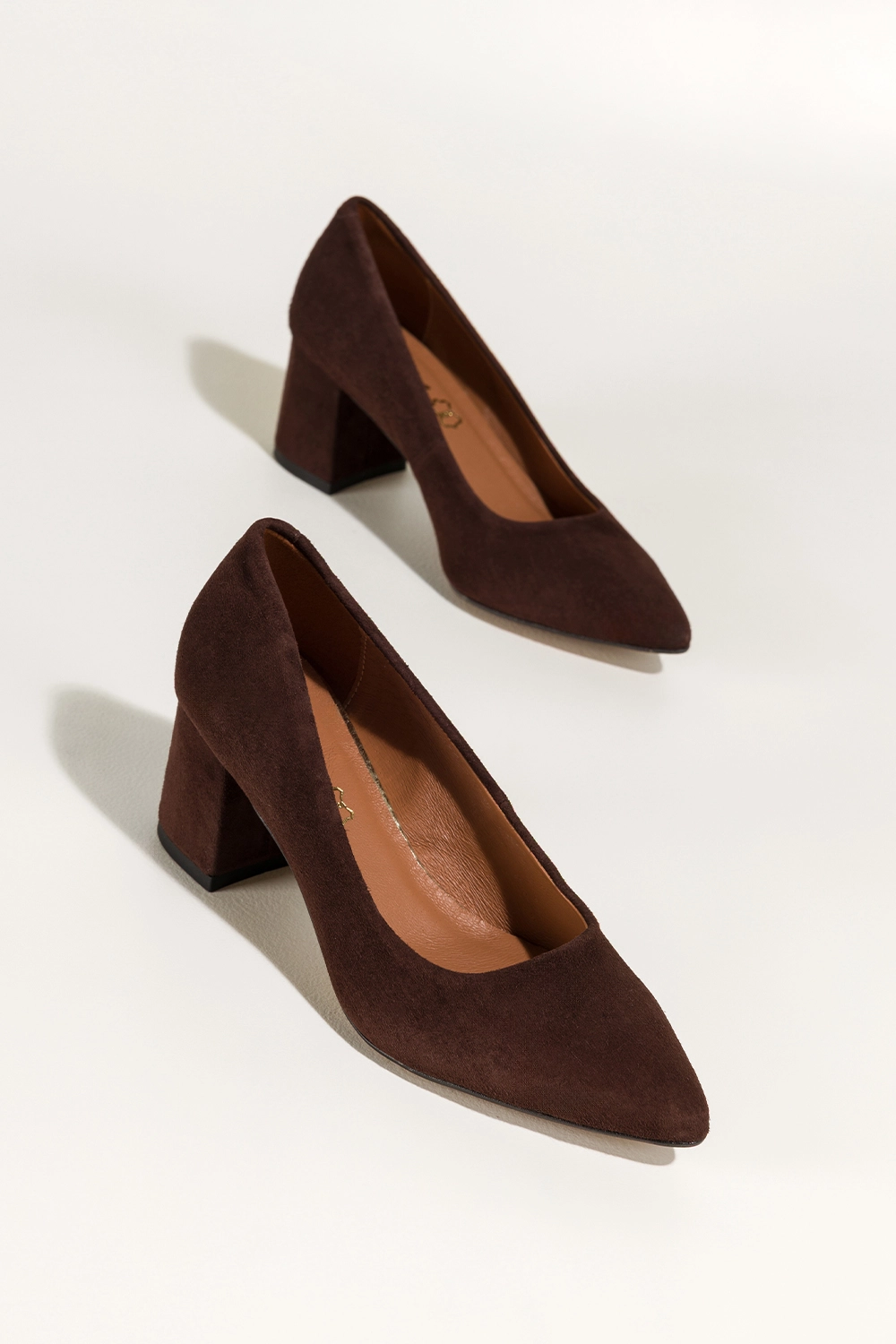 Szpiczasty nosek oraz szeroki obcas typu słupek pokryty skórą zamszową nadają sylwetce smukłości i klasy, jednocześnie zachowując stabilność i komfort noszenia. Ten model doskonale komponuje się z eleganckimi sukienkami, garniturami i bardziej casualowymi stylizacjami. Uniwersalny, ciepły odcień czekoladowego brązu sprawia, że czółenka są łatwe do zestawienia zarówno z klasycznymi, jak i modowymi stylami. To idealne obuwie na ważne spotkania, randki i uroczystości.
