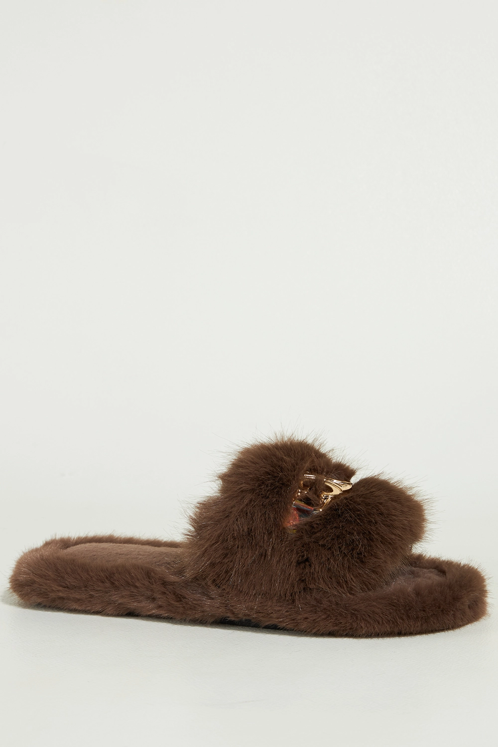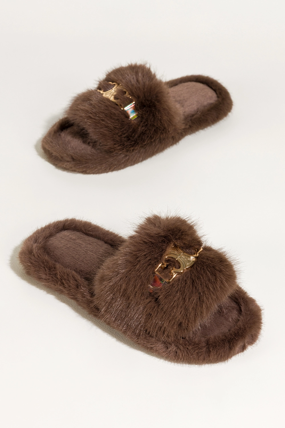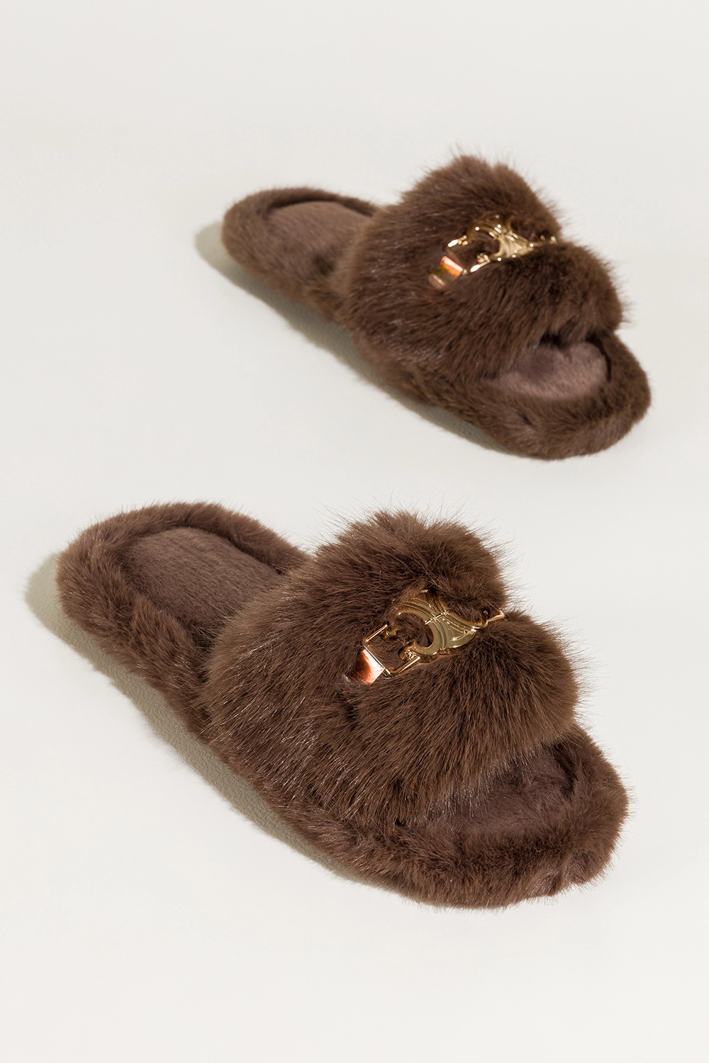 Szeroki pasek pokryty bujnym futerkiem ozdobiono efektowną, złotą aplikacją, która dodaje im szyku i modowego wyrazu. Czekoladowy kolor pasuje do wielu domowych stylizacji, od klasycznych dresów po eleganckie kimona. To idealny wybór dla kobiet, które cenią sobie piękno i jakość nawet podczas odpoczynku w domowym zaciszu.
