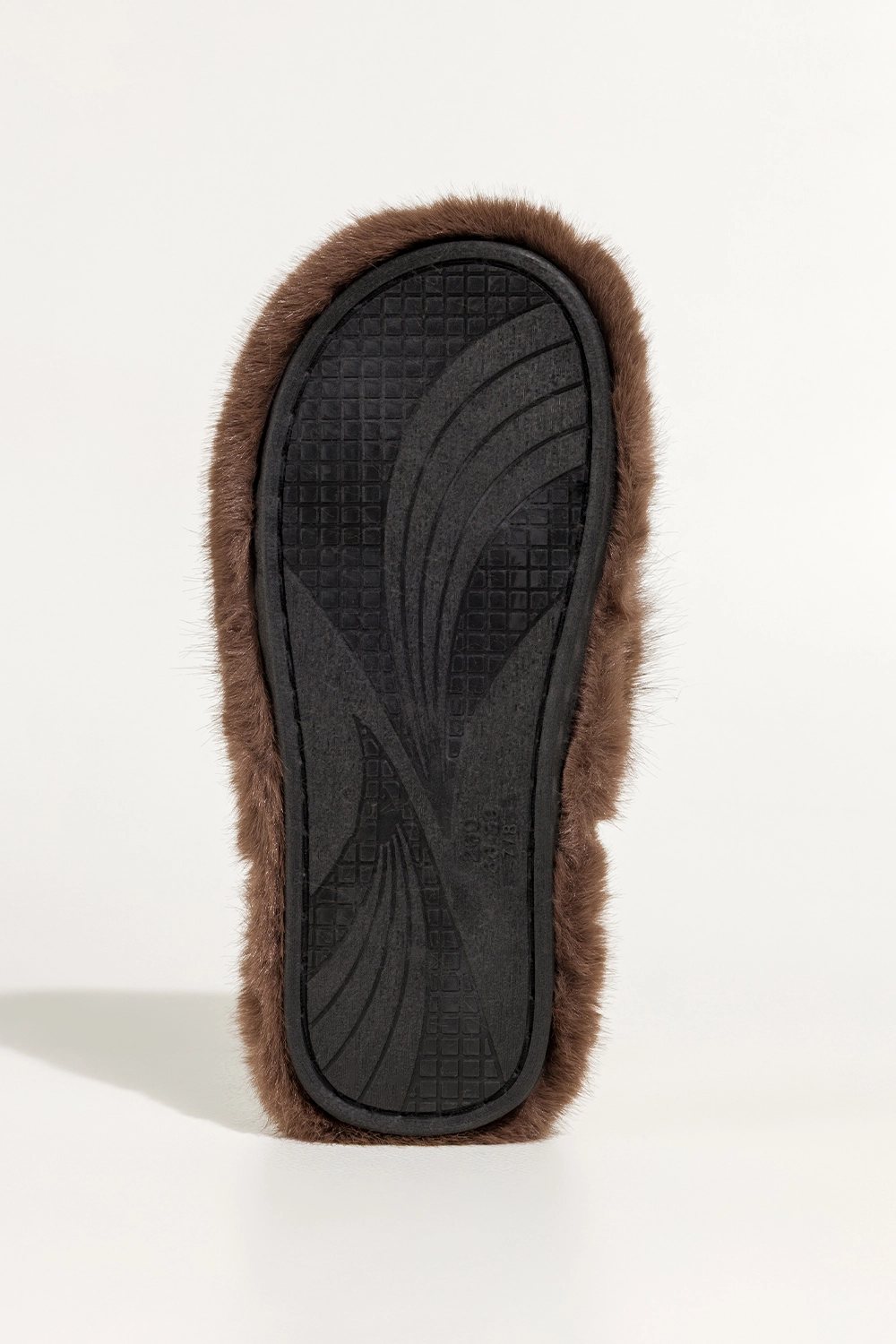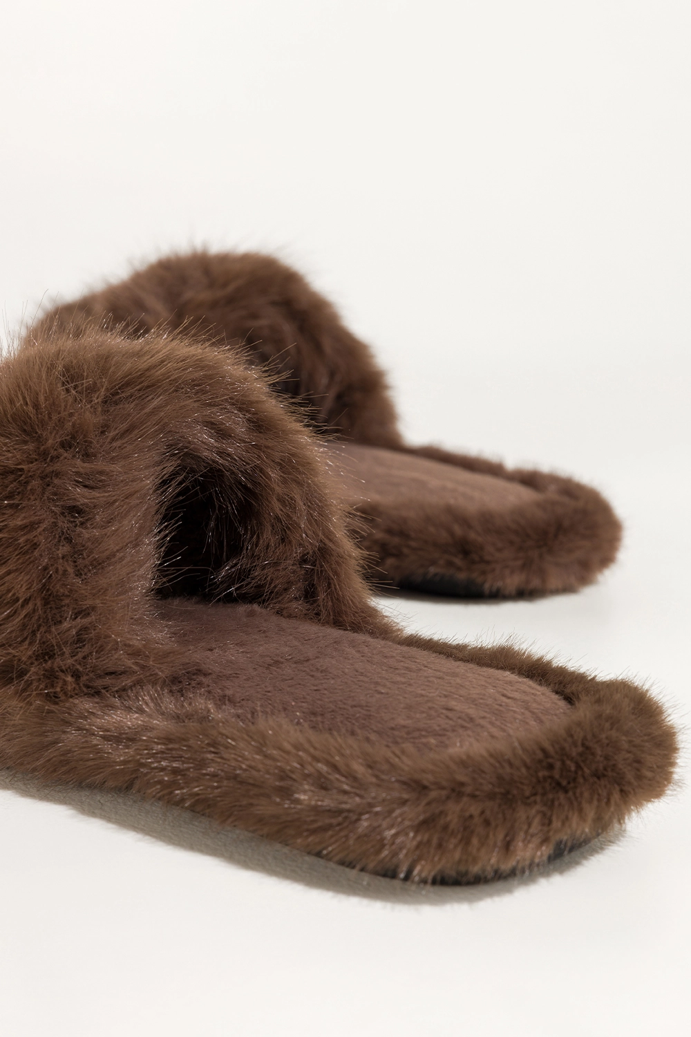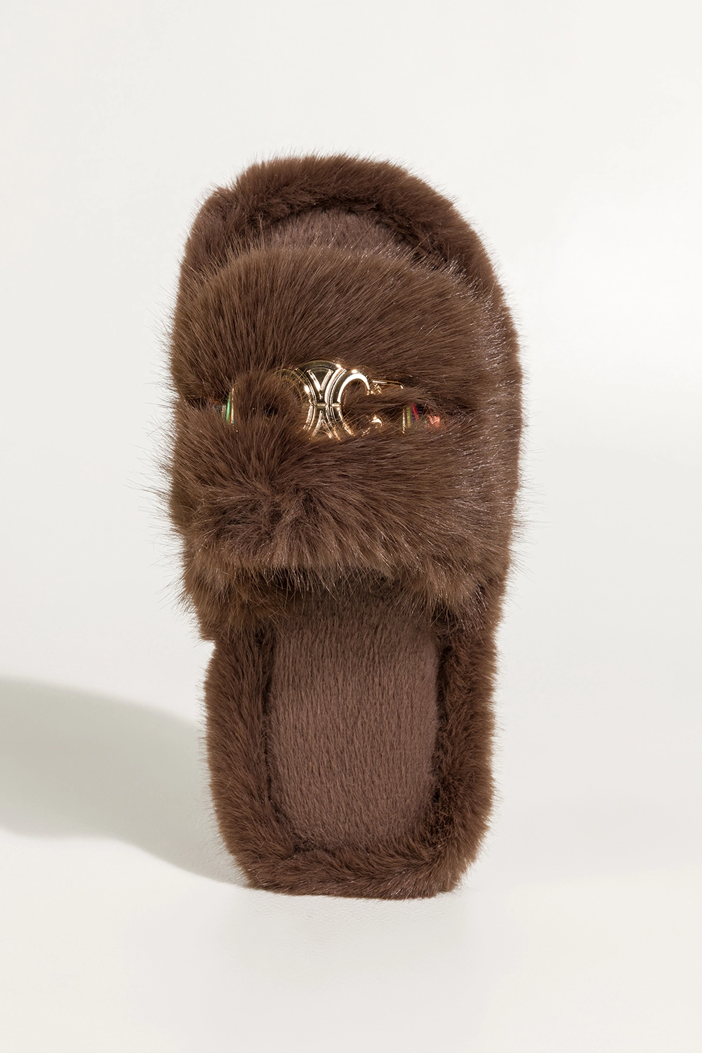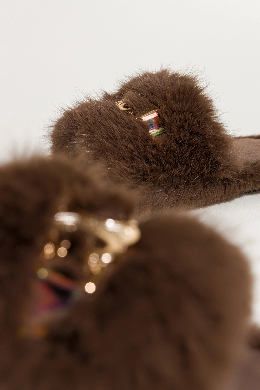 Szeroki pasek pokryty bujnym futerkiem ozdobiono efektowną, złotą aplikacją, która dodaje im szyku i modowego wyrazu. Czekoladowy kolor pasuje do wielu domowych stylizacji, od klasycznych dresów po eleganckie kimona. To idealny wybór dla kobiet, które cenią sobie piękno i jakość nawet podczas odpoczynku w domowym zaciszu.