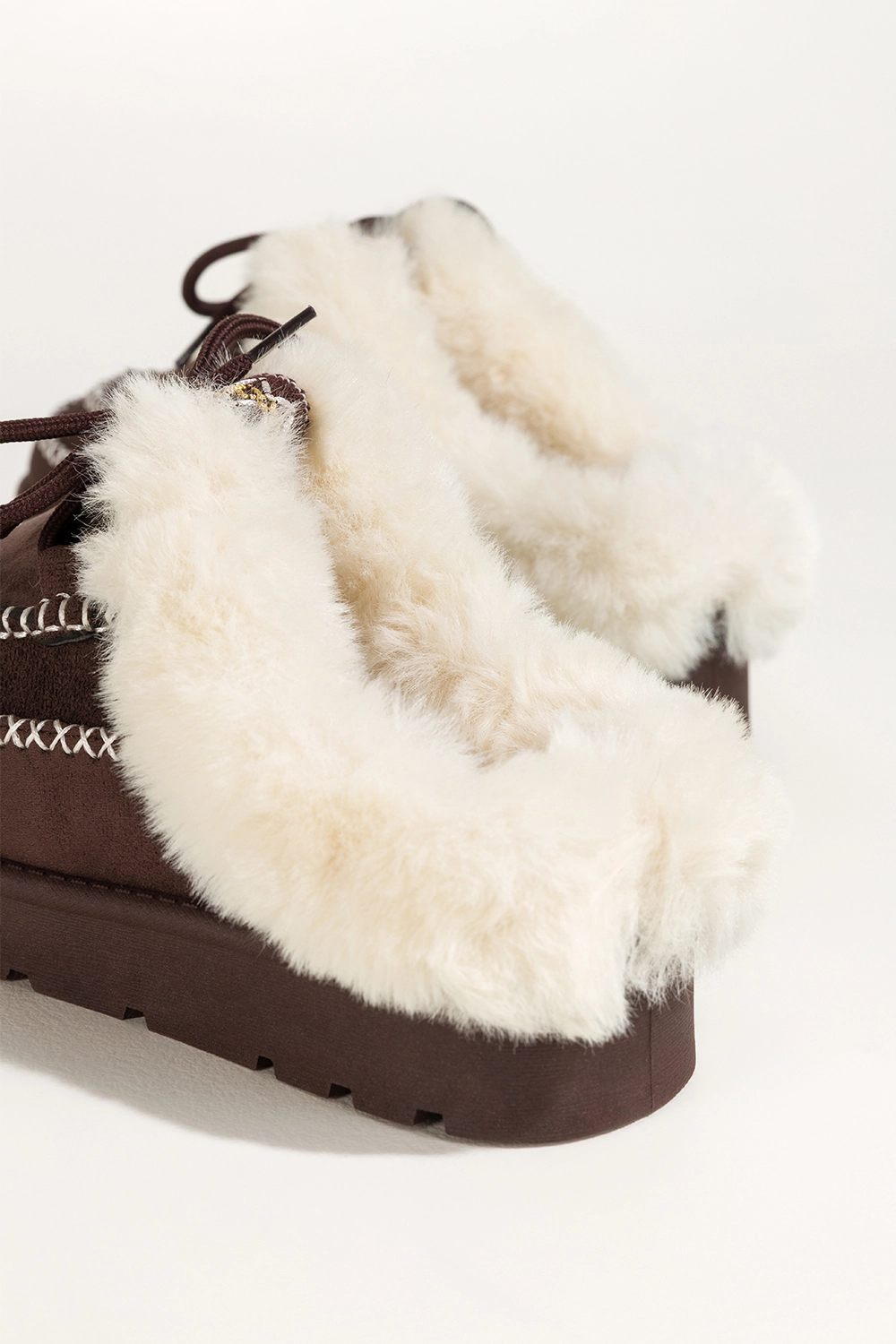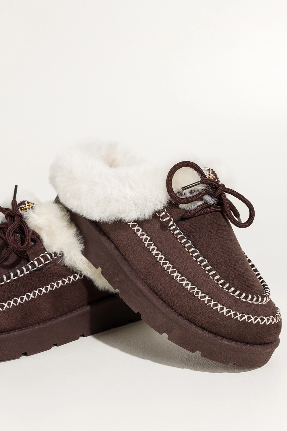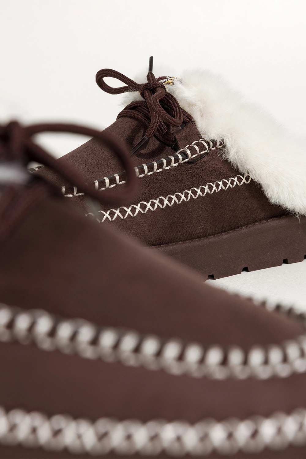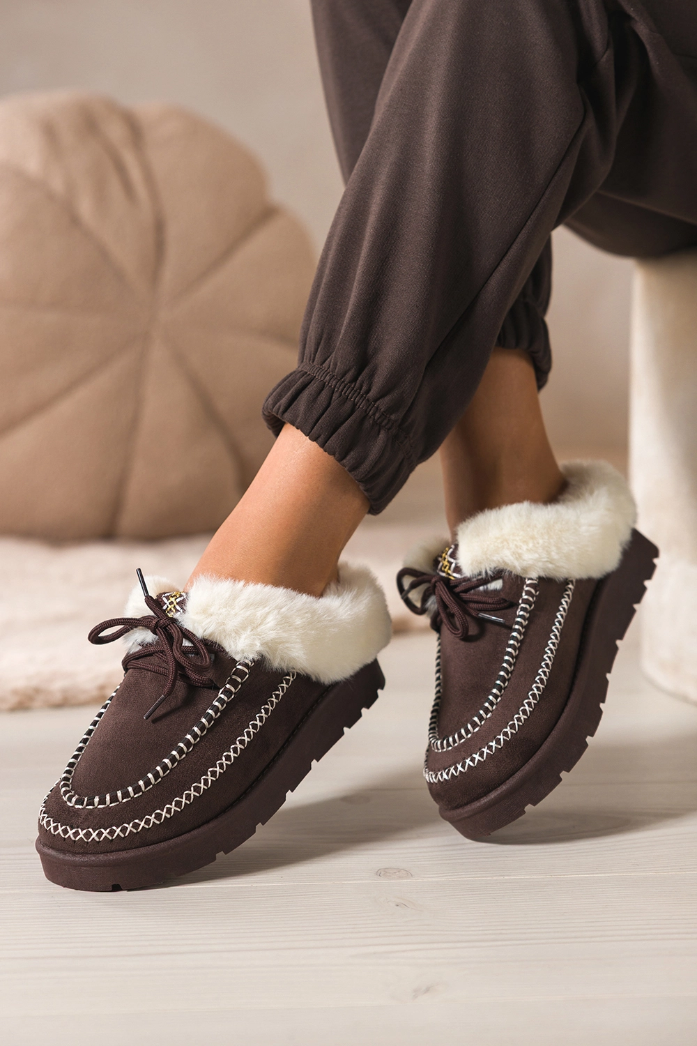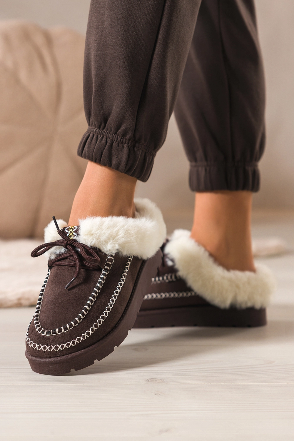 Czekoladowe kapcie damskie z futerkiem na bieżnikowanej platformie ozdobne przeszycia sznurówka Casu model 0944. Wykonane z wysokogatunkowej zamszowej skóry ekologicznej, gwarantują nie tylko trwałość, ale i elegancki wygląd. Wewnętrzne futerko zapewnia doskonałą izolację termiczną i miękko otula stopy, tworząc uczucie luksusu przy każdym kroku. Ich solidna bieżnikowana podeszwa zwiększa przyczepność, co sprawia, że są idealne zarówno do noszenia w domu, jak i na zewnątrz.