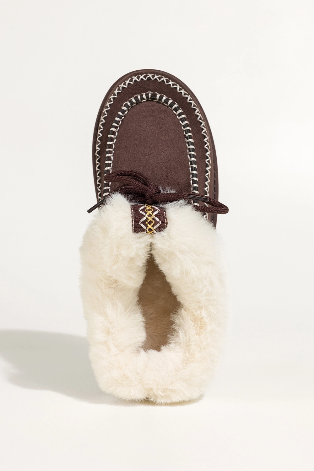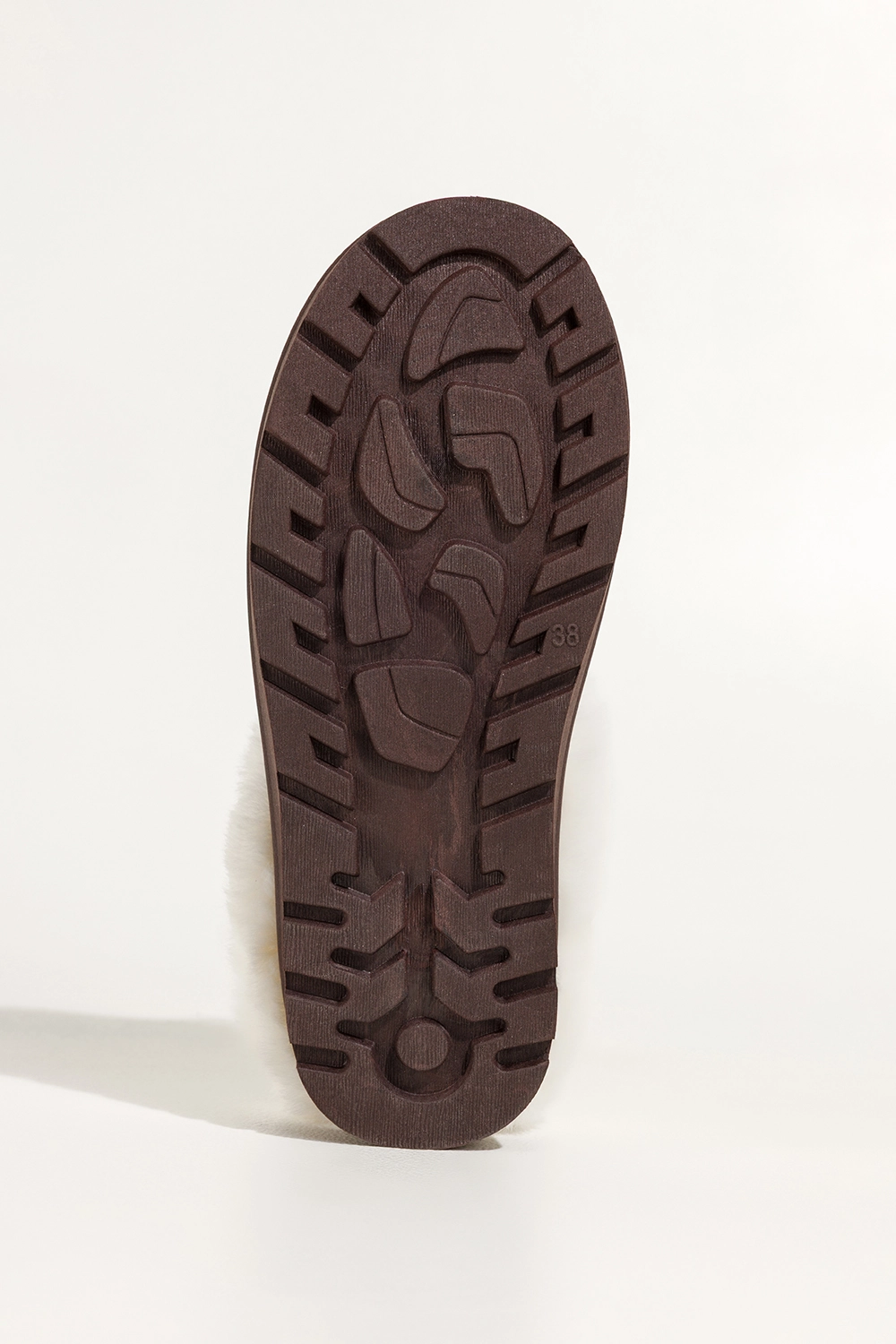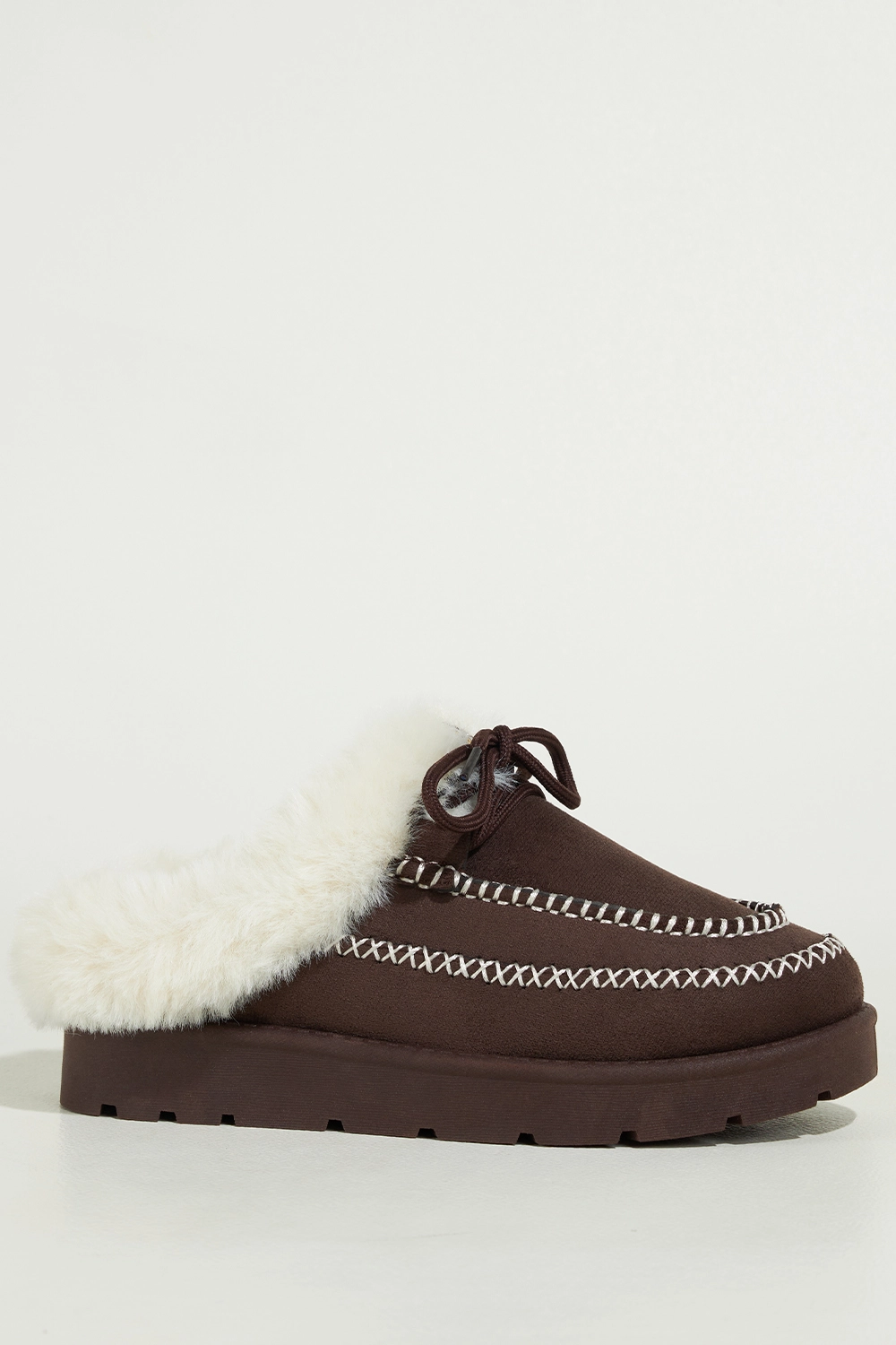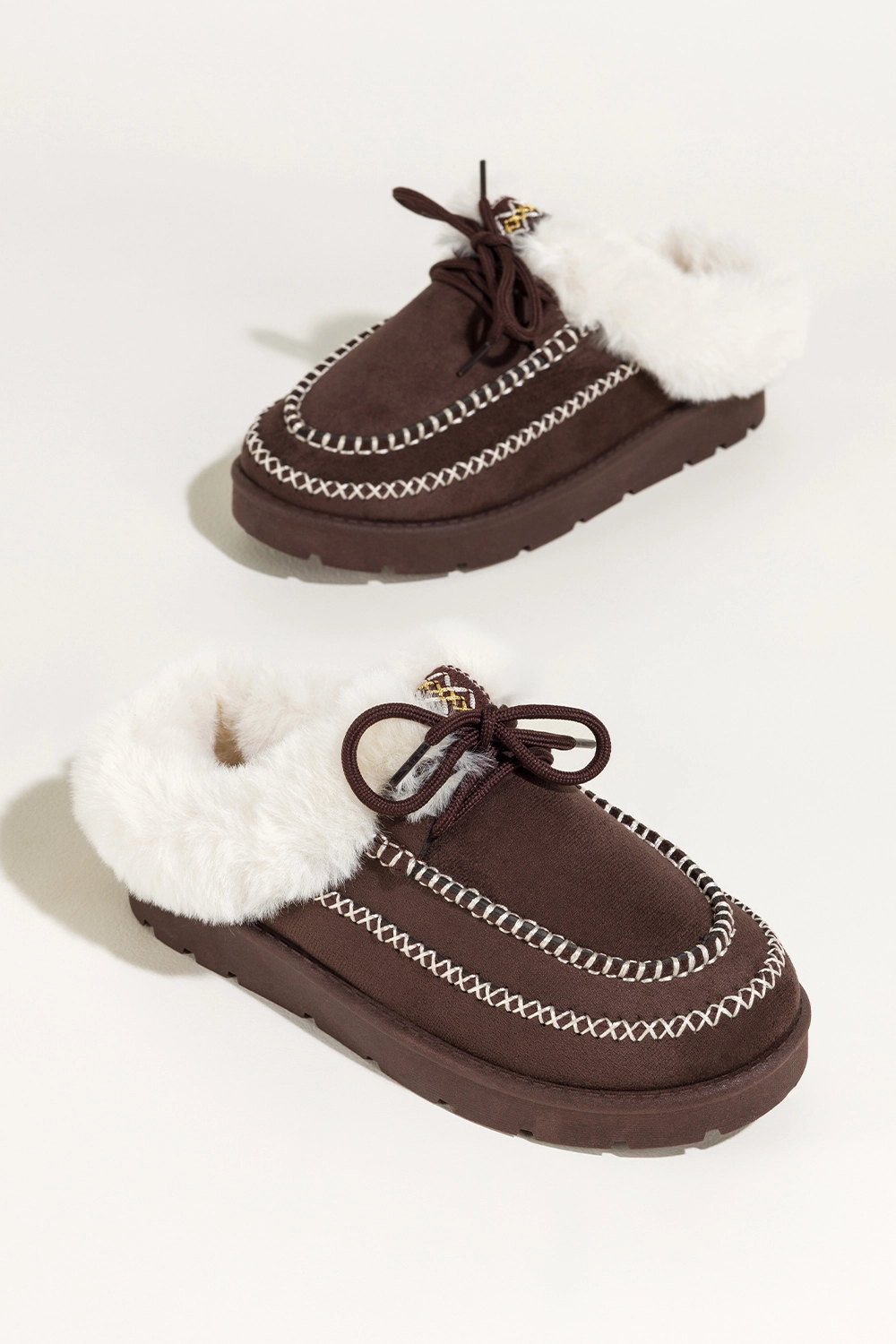 Ozdobne przeszycia i dekoracyjna sznurówka na przodzie nadają kapciom unikalnego charakteru, który przyciąga wzrok i dodaje stylizacji przytulnego uroku. Zaokrąglony nosek oraz odkryta pięta podkreślają lekkość i kobiecy styl obuwia. Kapcie świetnie komponują się z domowymi stylizacjami, ale też sprawdzą się jako ciepłe obuwie po powrocie z zimowego spaceru czy narciarskich szaleństw.
