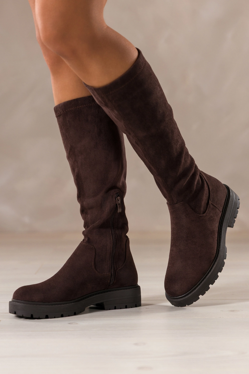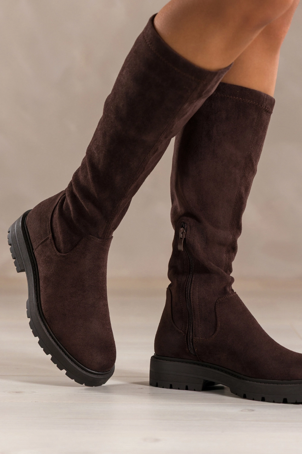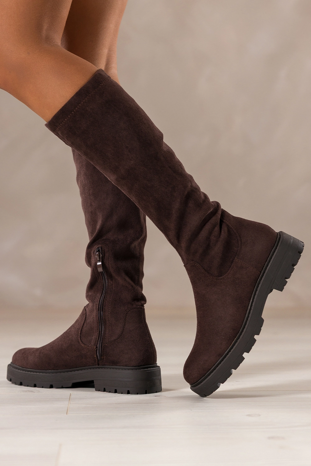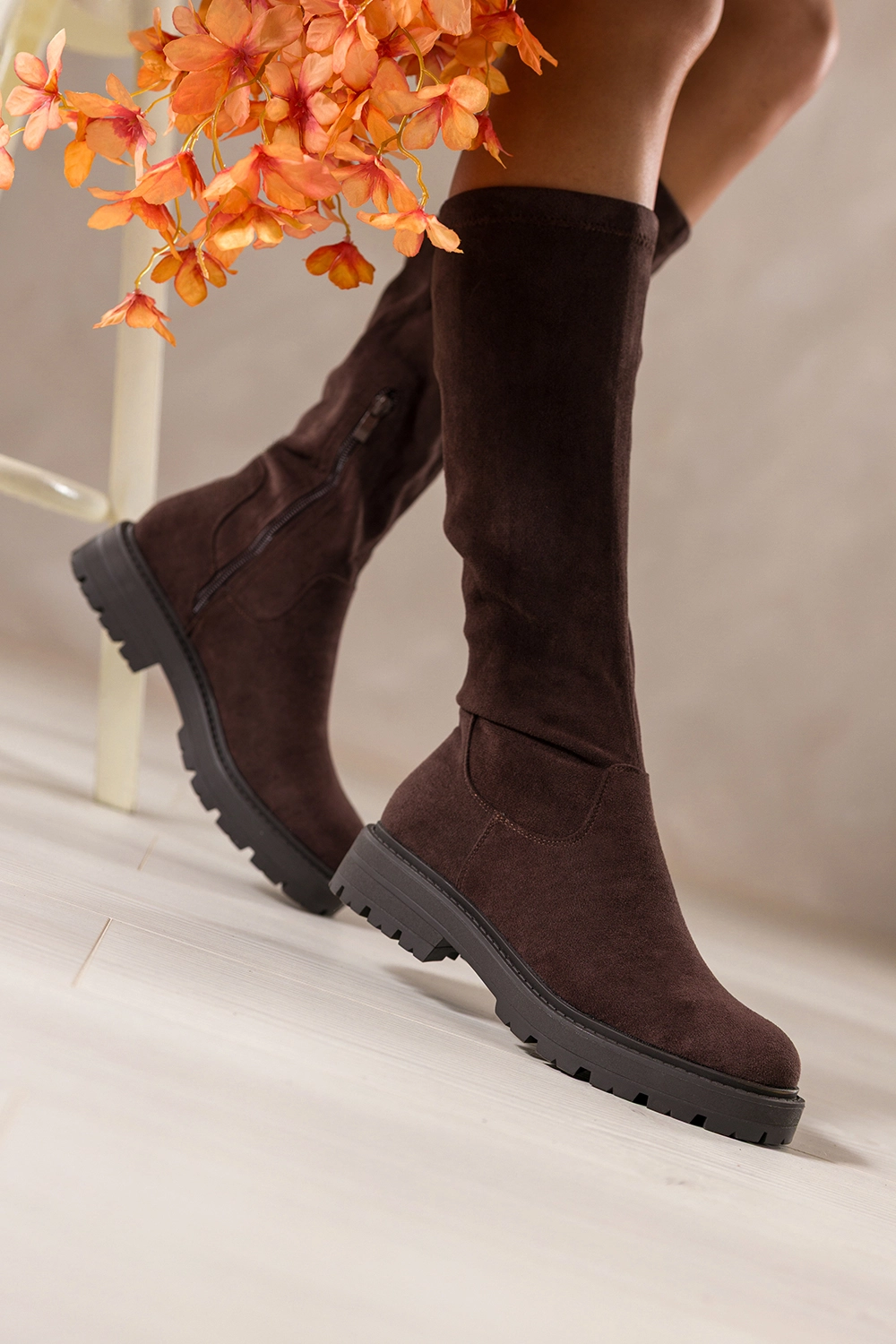 Czekoladowe kozaki damskie na bieżnikowanej podeszwie elastyczna cholewka przed kolano Casu model 0833, elegancja i funkcjonalność w jednym. Wykonane z wysokogatunkowego zamszu ekologicznego, zachwycają perfekcyjnym wykończeniem i miękkim, dopasowującym się do nogi materiałem. Ich wnętrze zostało wyściełane delikatnym futerkiem, które gwarantuje ciepło i wygodę nawet podczas najchłodniejszych dni. Solidna bieżnikowana platforma zapewnia stabilność i pewny krok, co czyni ten model idealnym wyborem na zimową aurę.
