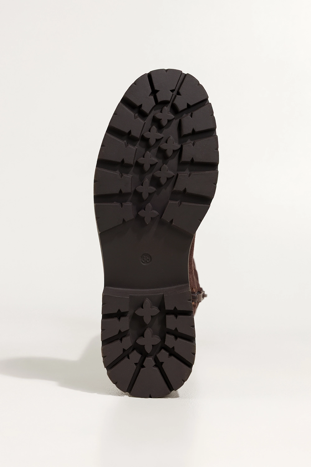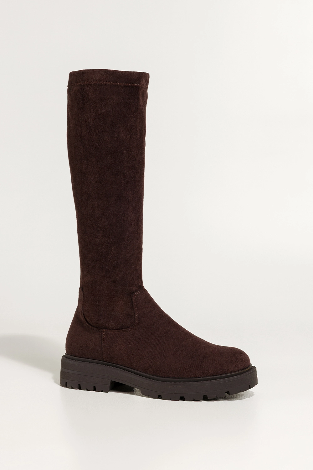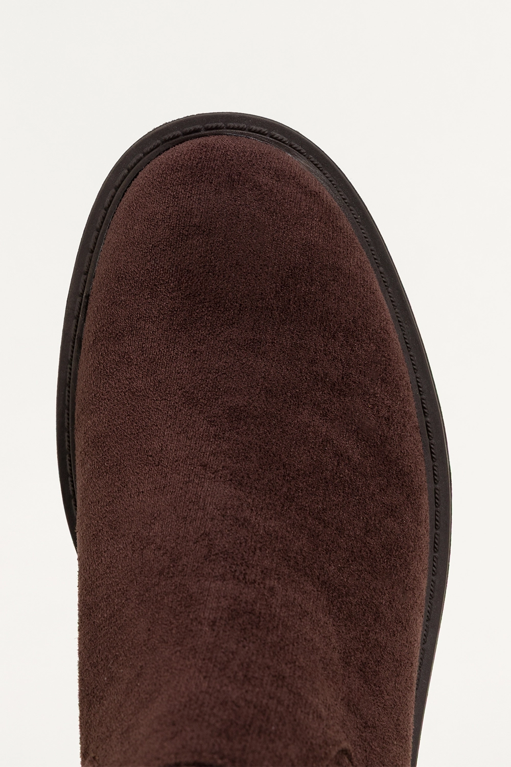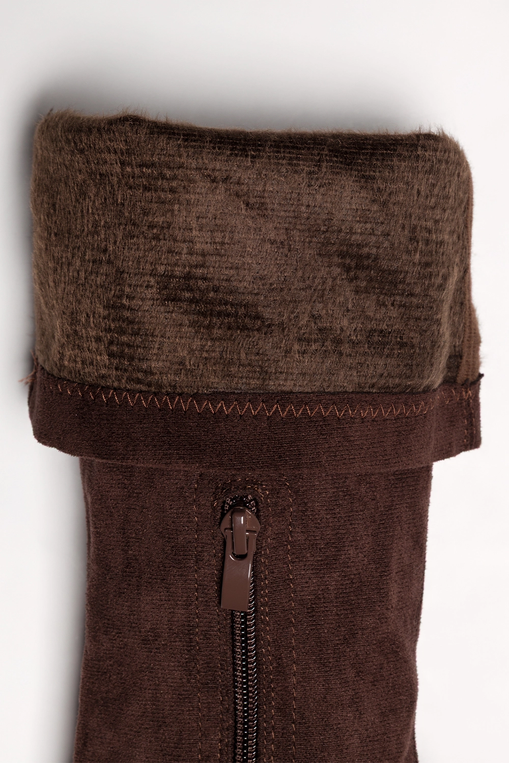 Czekoladowe kozaki damskie na bieżnikowanej podeszwie elastyczna cholewka przed kolano Casu model 0833, elegancja i funkcjonalność w jednym. Wykonane z wysokogatunkowego zamszu ekologicznego, zachwycają perfekcyjnym wykończeniem i miękkim, dopasowującym się do nogi materiałem. Ich wnętrze zostało wyściełane delikatnym futerkiem, które gwarantuje ciepło i wygodę nawet podczas najchłodniejszych dni. Solidna bieżnikowana platforma zapewnia stabilność i pewny krok, co czyni ten model idealnym wyborem na zimową aurę.