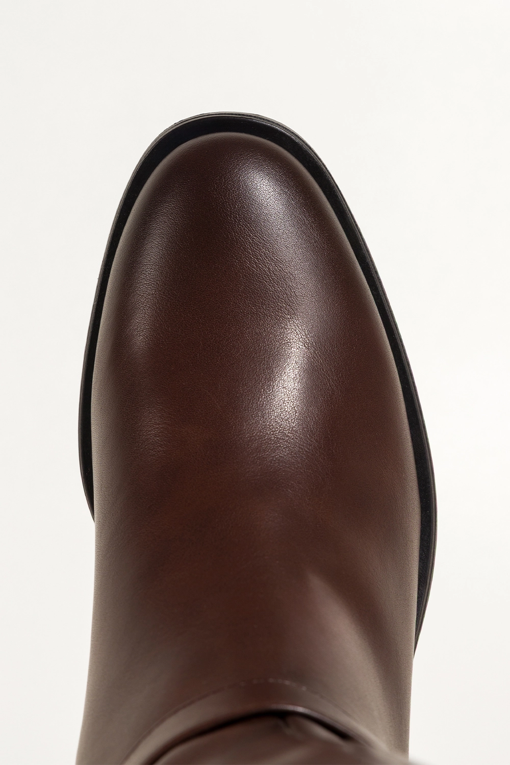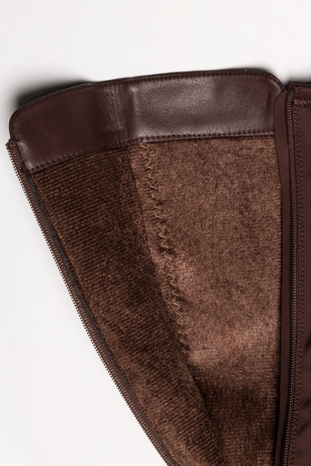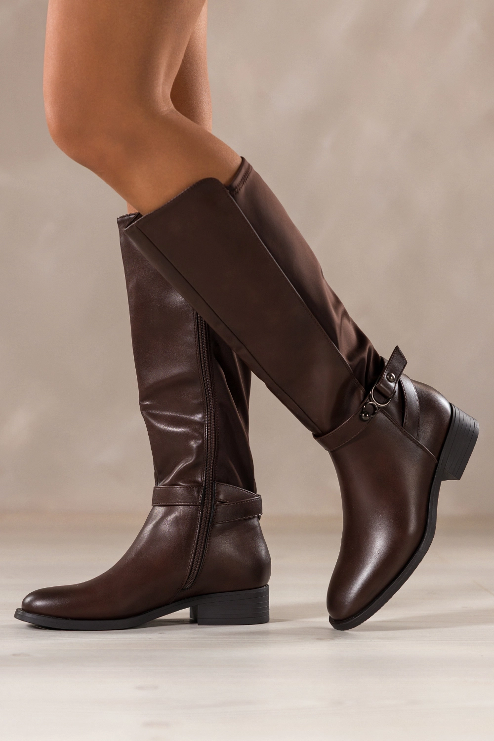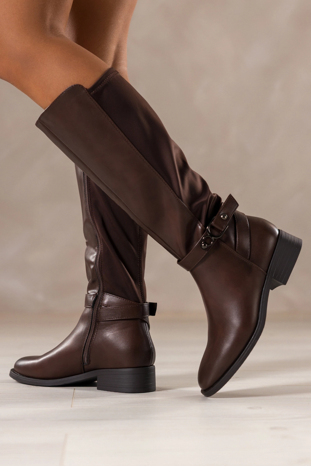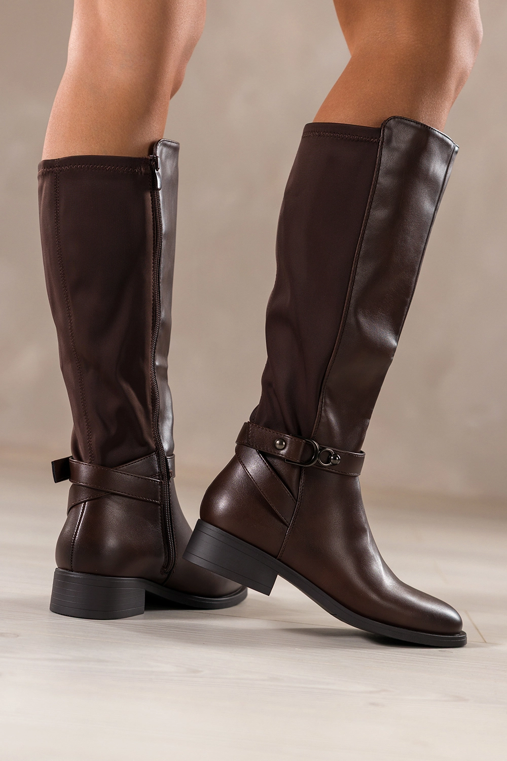 Model przyciąga wzrok dzięki modnej elastycznej cholewce, która doskonale dopasowuje się do kształtu łydki, podkreślając sylwetkę i zapewniając wygodę noszenia. Pasek ze stalową ozdobą dodaje elegancji i nowoczesnego sznytu, czyniąc te kozaki idealnym wyborem zarówno do casualowych stylizacji, jak i bardziej formalnych zestawów. Czekoladowy odcień wprowadza ciepło i łatwo łączy się z jesienno-zimową garderobą, podkreślając charakter każdej stylizacji.