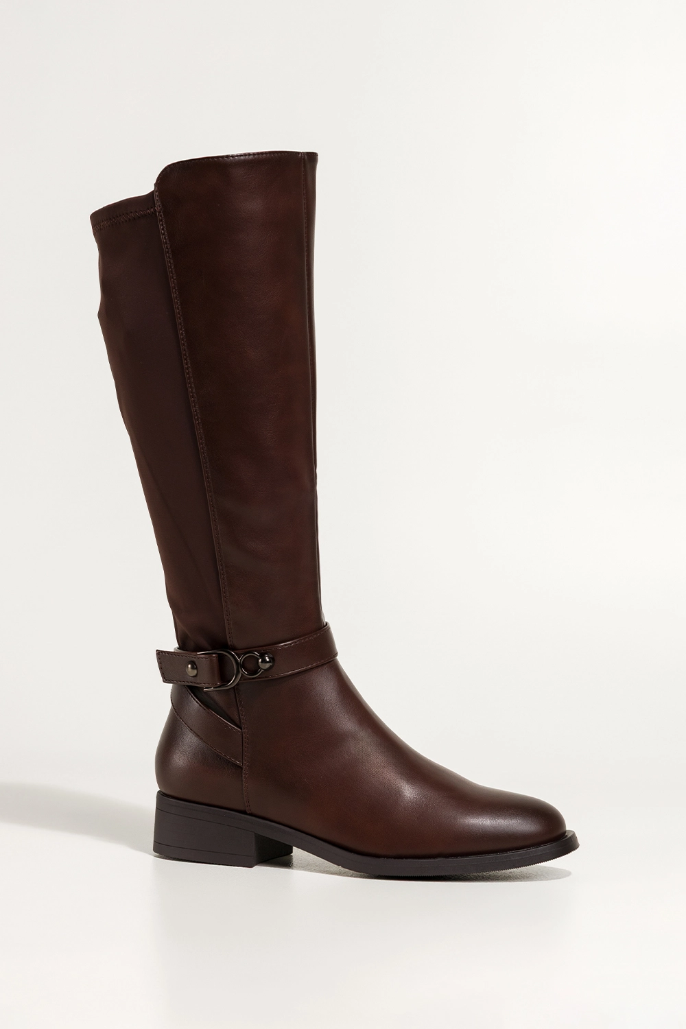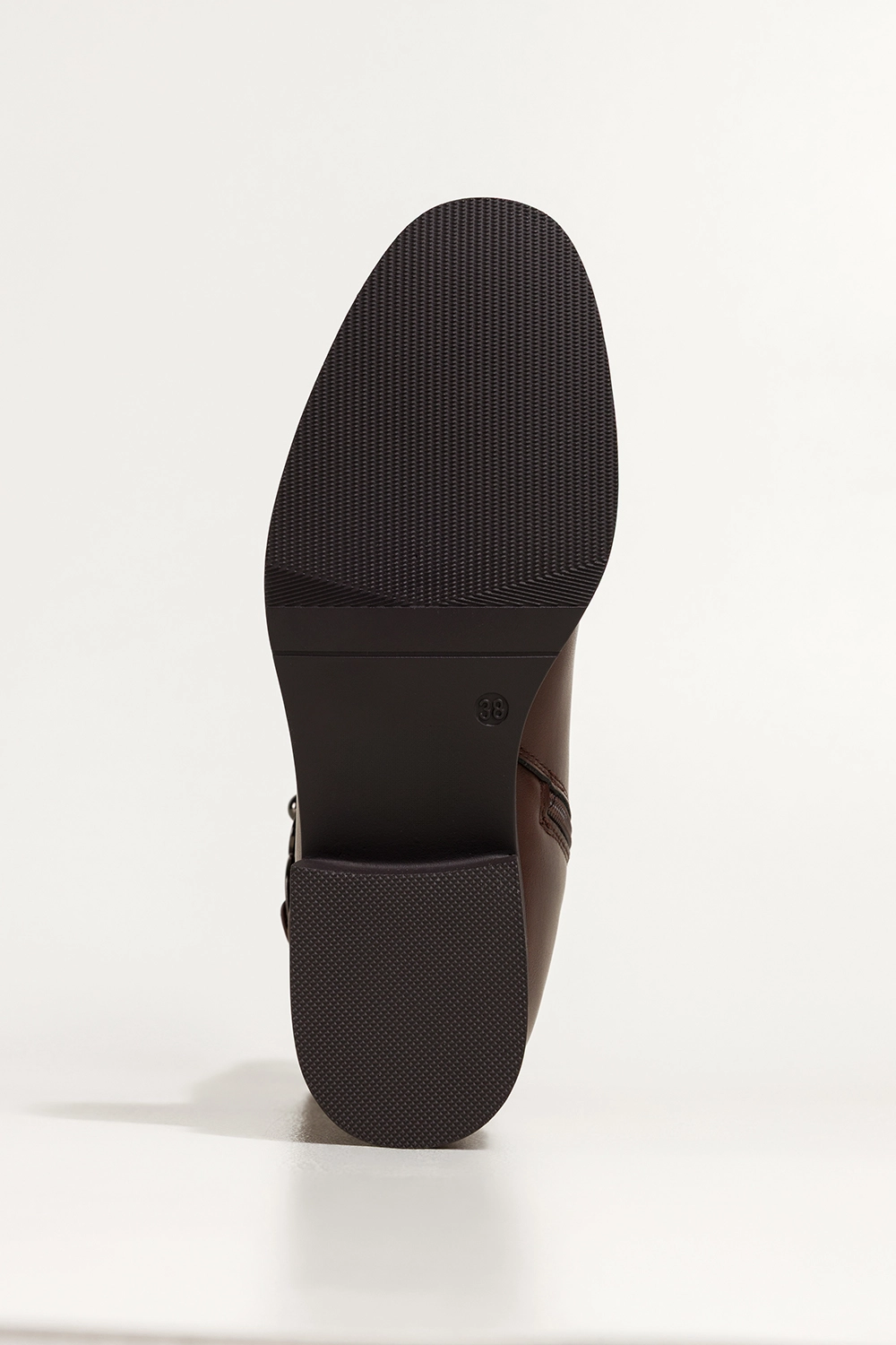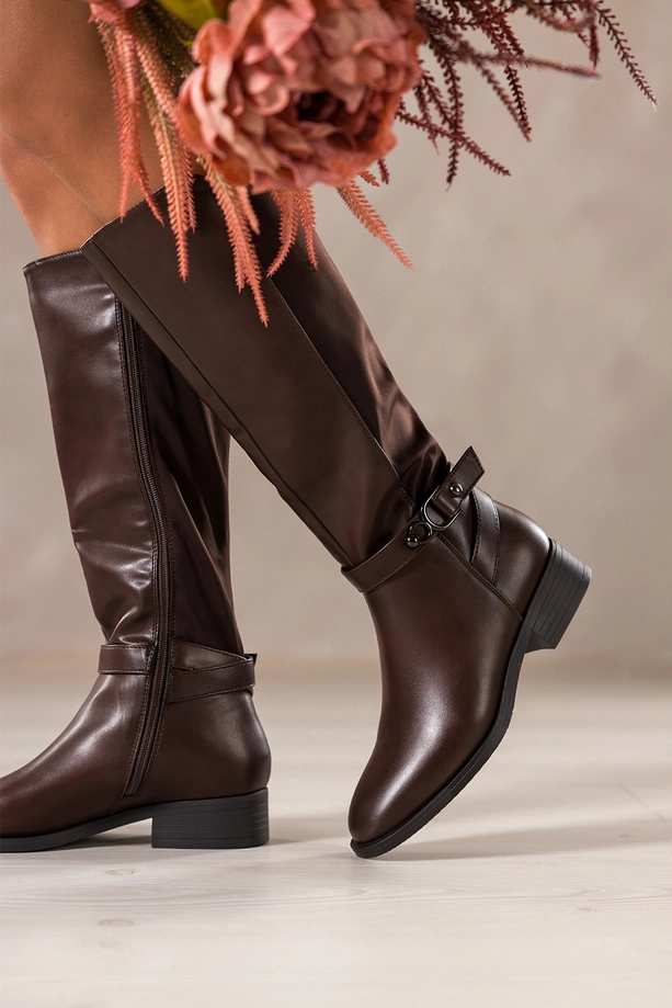 Czekoladowe kozaki damskie na klocku elastyczna cholewka pasek ze stalową ozdobą Casu model D728-7, połączenie elegancji, funkcjonalności. Wykonane z wysokogatunkowej skóry ekologicznej, zapewniają trwałość i odporność na codzienne użytkowanie. Wnętrze ocieplone delikatnym futerkiem otula stopę miękkością, gwarantując komfort nawet w najchłodniejsze dni. Solidny obcas typu klocek dba o stabilność, a zaokrąglony nosek dodaje subtelnego, kobiecego uroku.