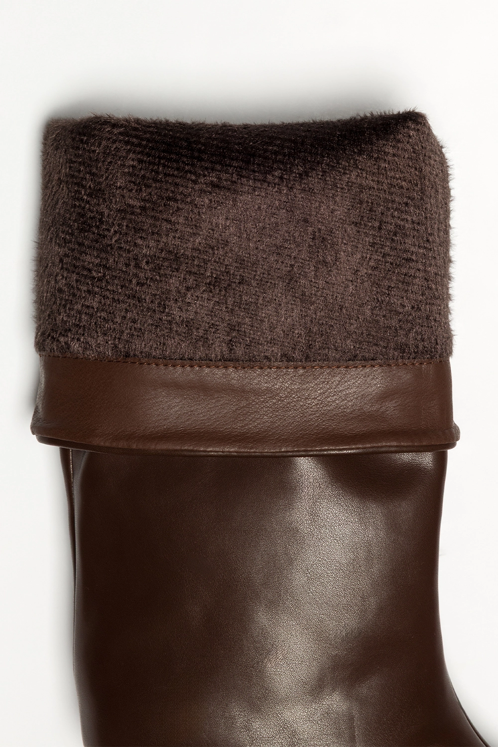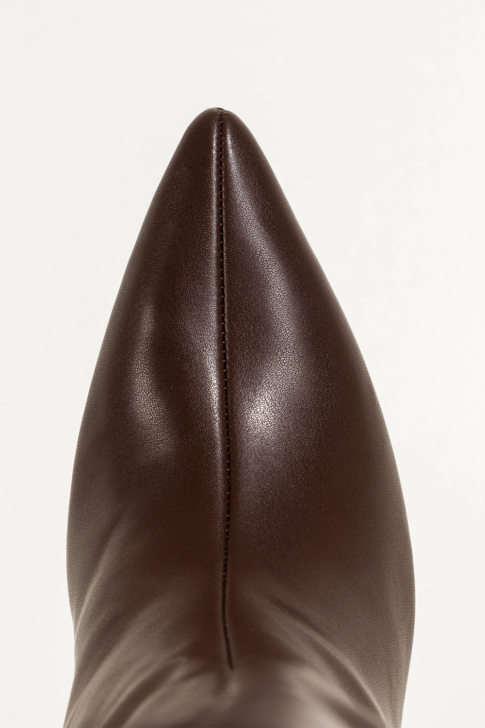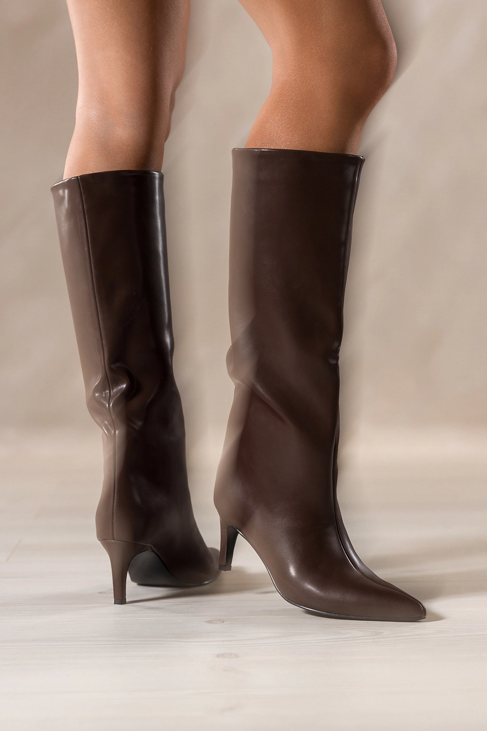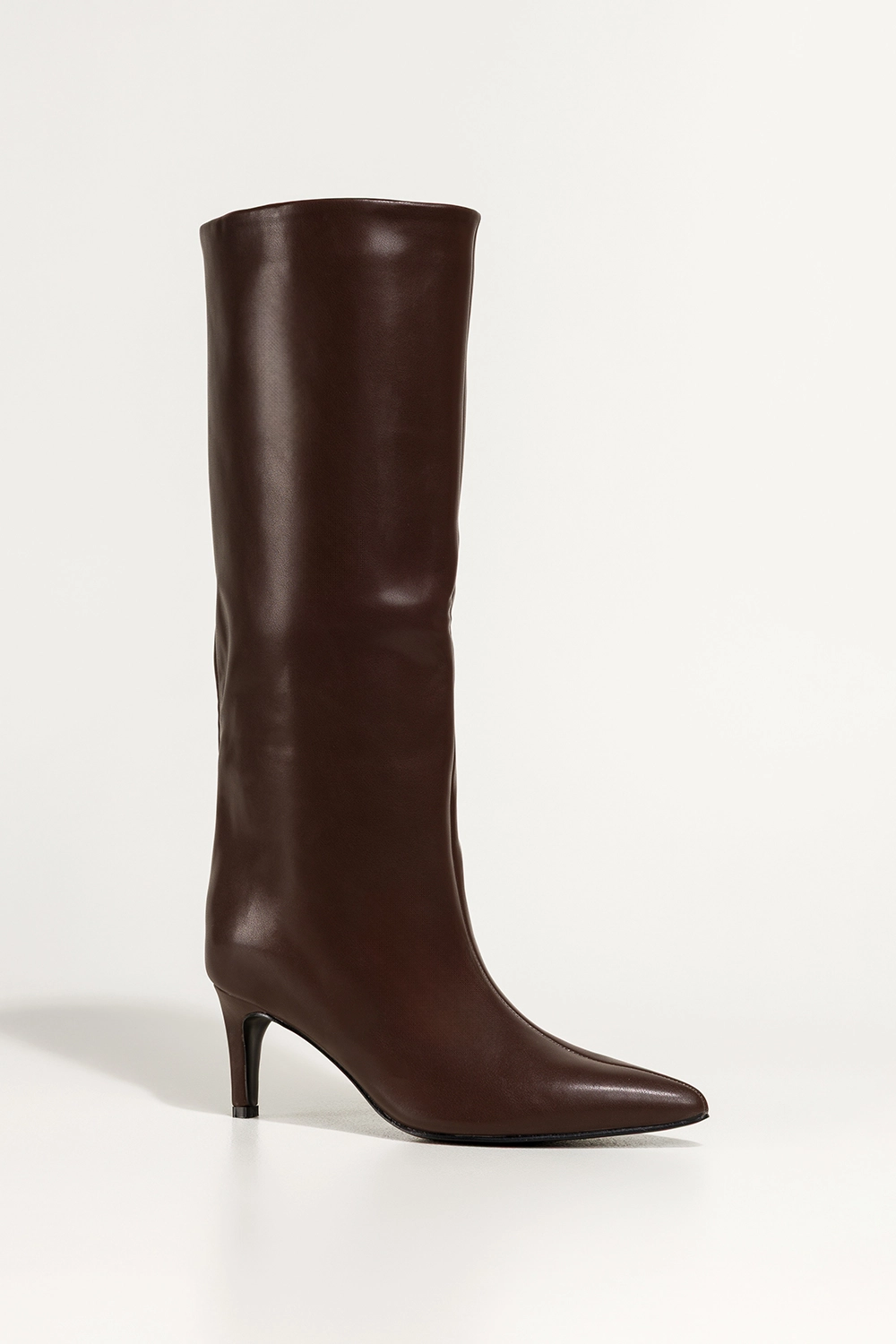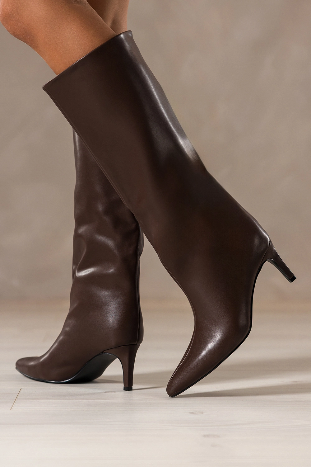 Czekoladowy odcień butów to absolutny hit sezonu, a szeroka cholewka przed kolano dodaje nonszalancji i nowoczesnego charakteru. Ozdobne przeszycie biegnące przez środek cholewki to unikalny detal, który przyciąga uwagę i wyróżnia ten model na tle innych. Dzięki wsuwanej konstrukcji buty są nie tylko stylowe, ale też praktyczne, łatwe w zakładaniu i zdejmowaniu. Te kozaki doskonale wpisują się w miejskie stylizacje, ale sprawdzą się również podczas bardziej eleganckich wyjść.