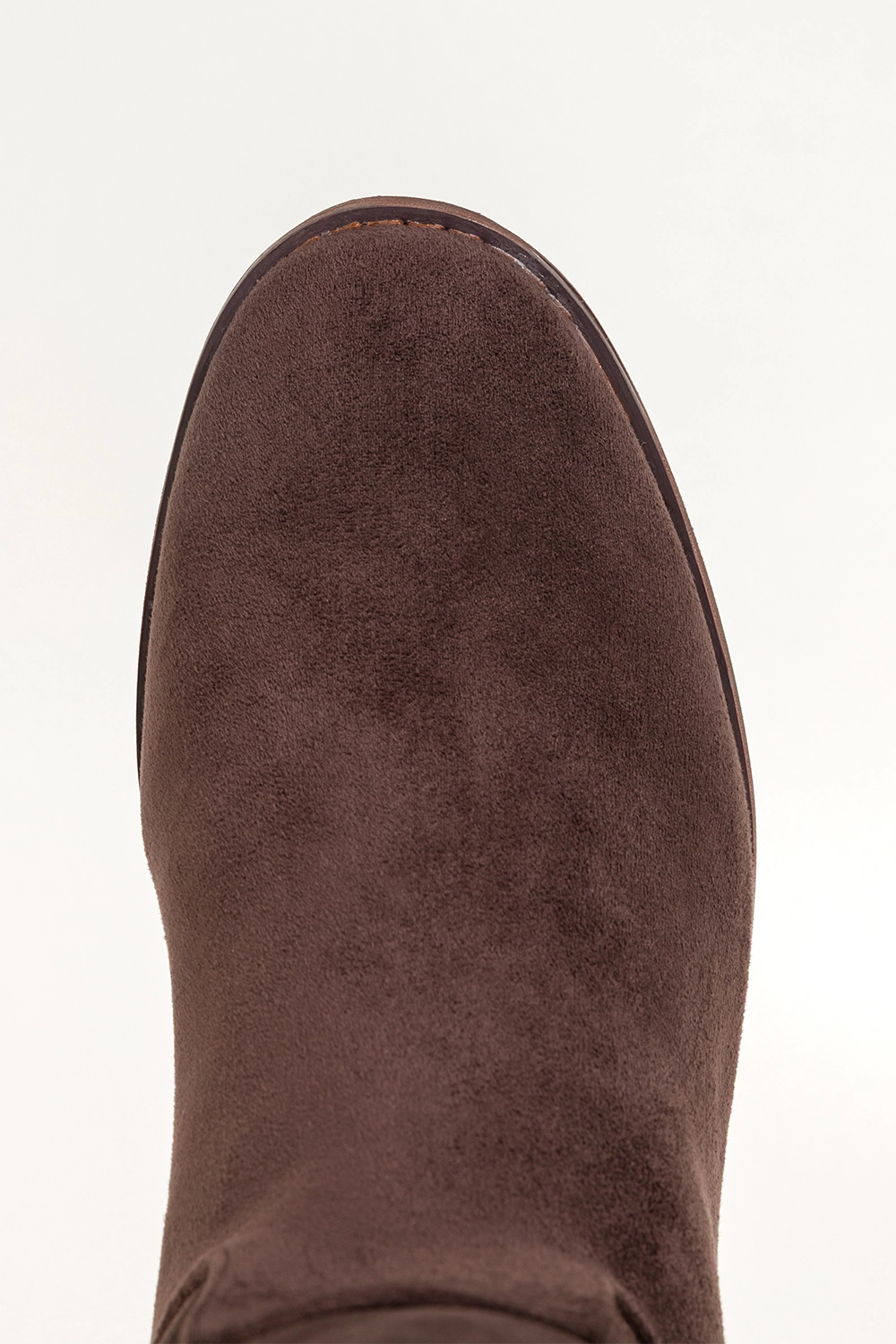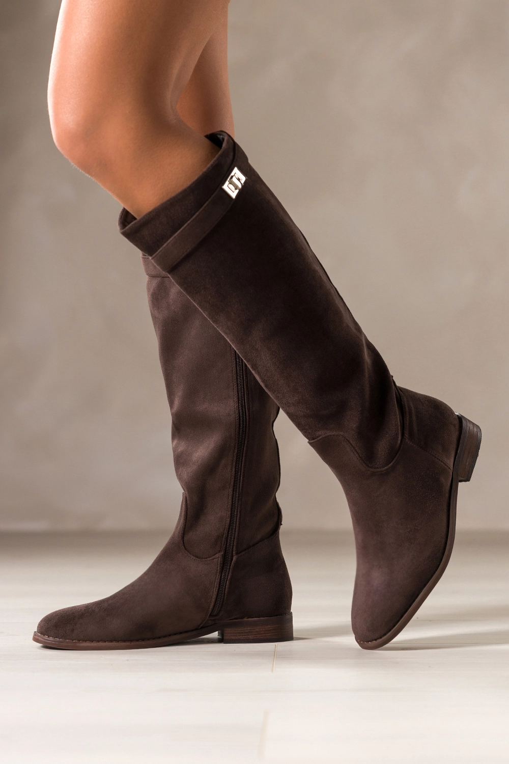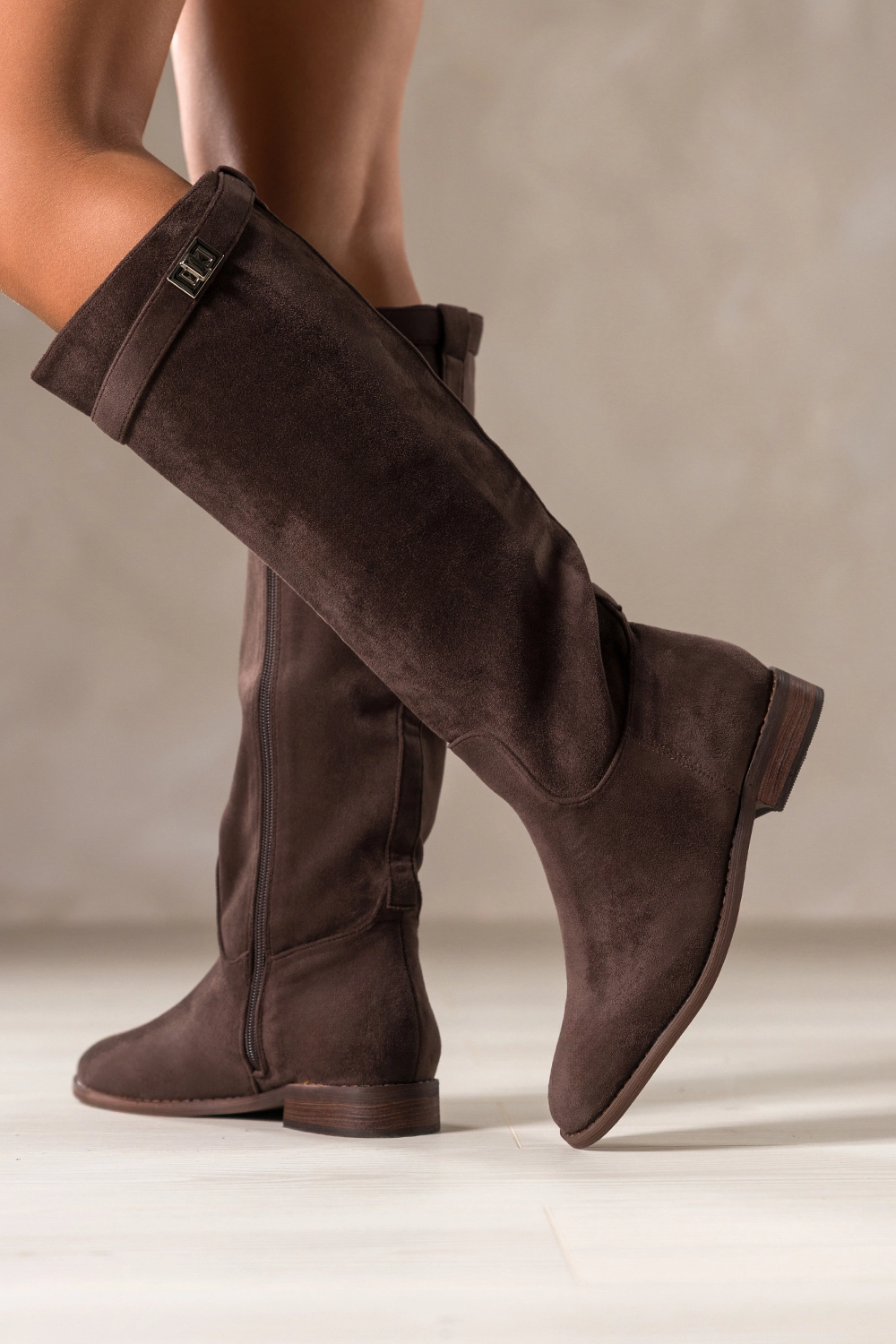 Czekoladowe kozaki damskie przed kolano na cholewce pasek z ozdobą niski obcas klocek Casu model 11-7 przyciągają wzrok głębokim, ciepłym odcieniem i elegancką linią, która subtelnie wysmukla nogę. Miękki w dotyku zamsz ekologiczny oraz zaokrąglony nosek nadają im szlachetności, a charakterystyczny pasek ze srebrną ozdobą w górnej części cholewki dodaje nowoczesnego wykończenia.