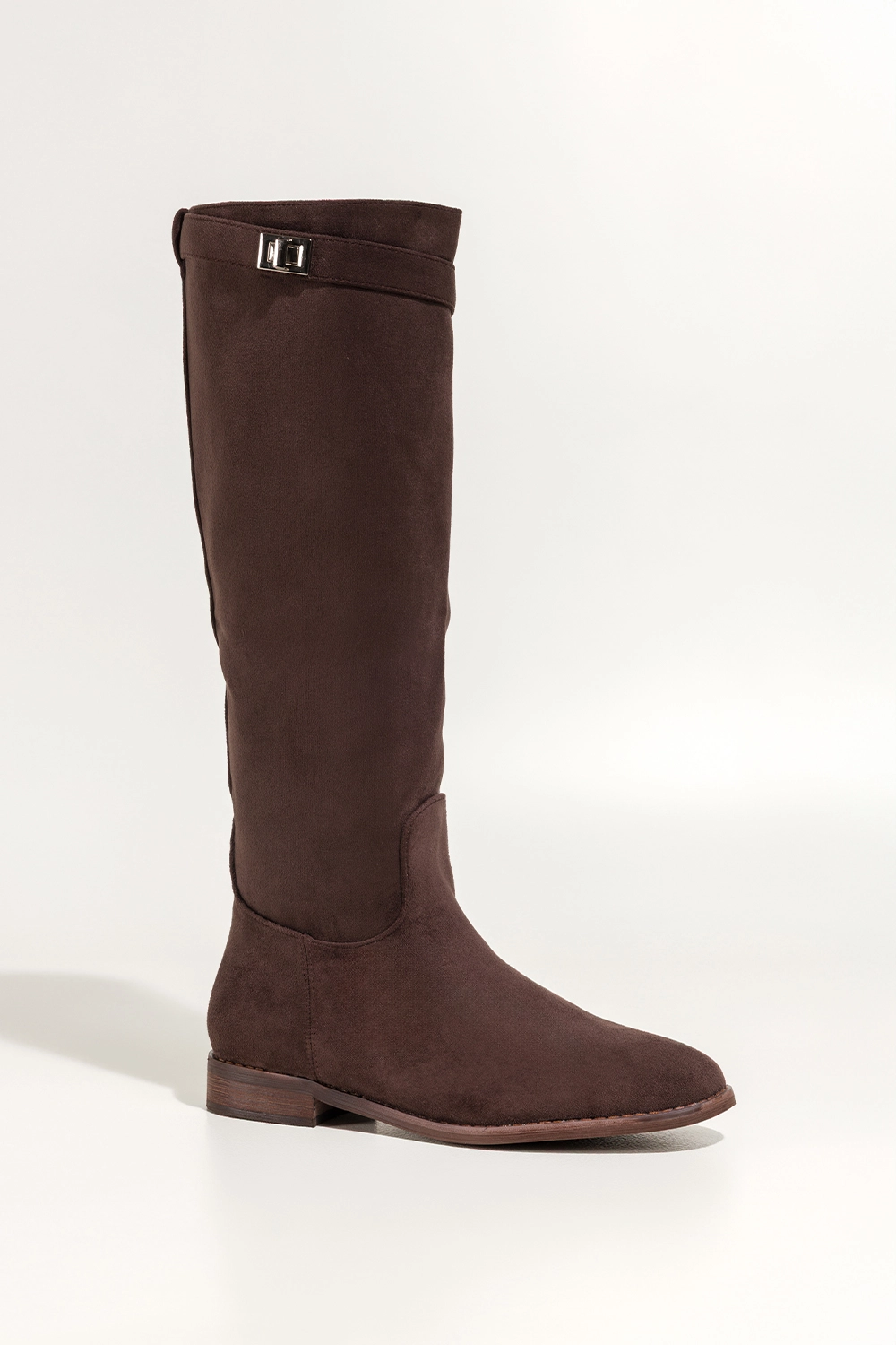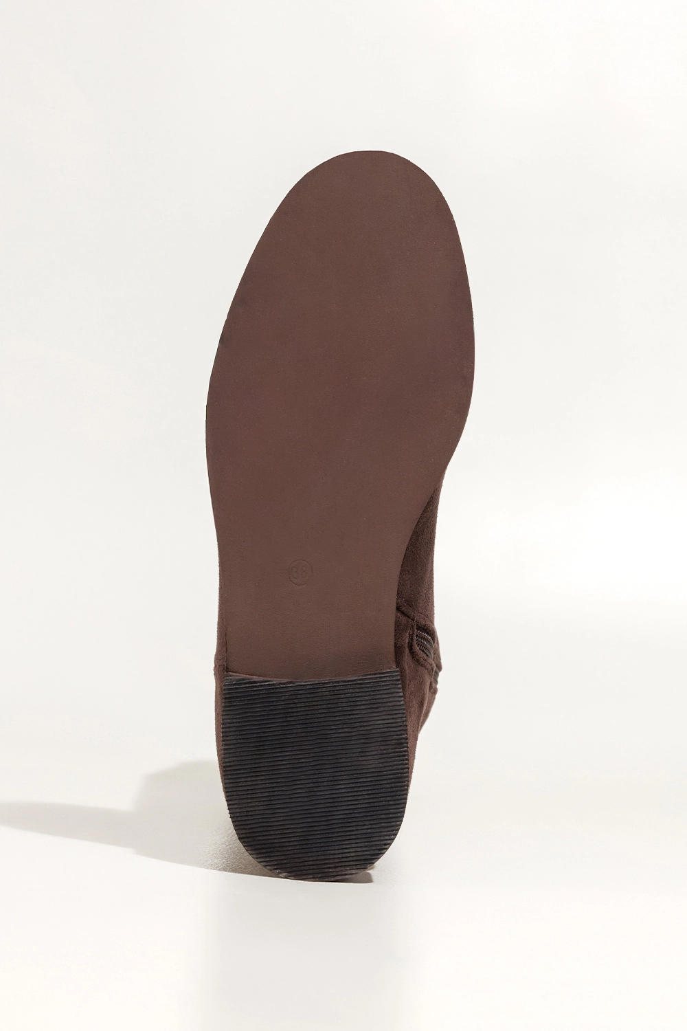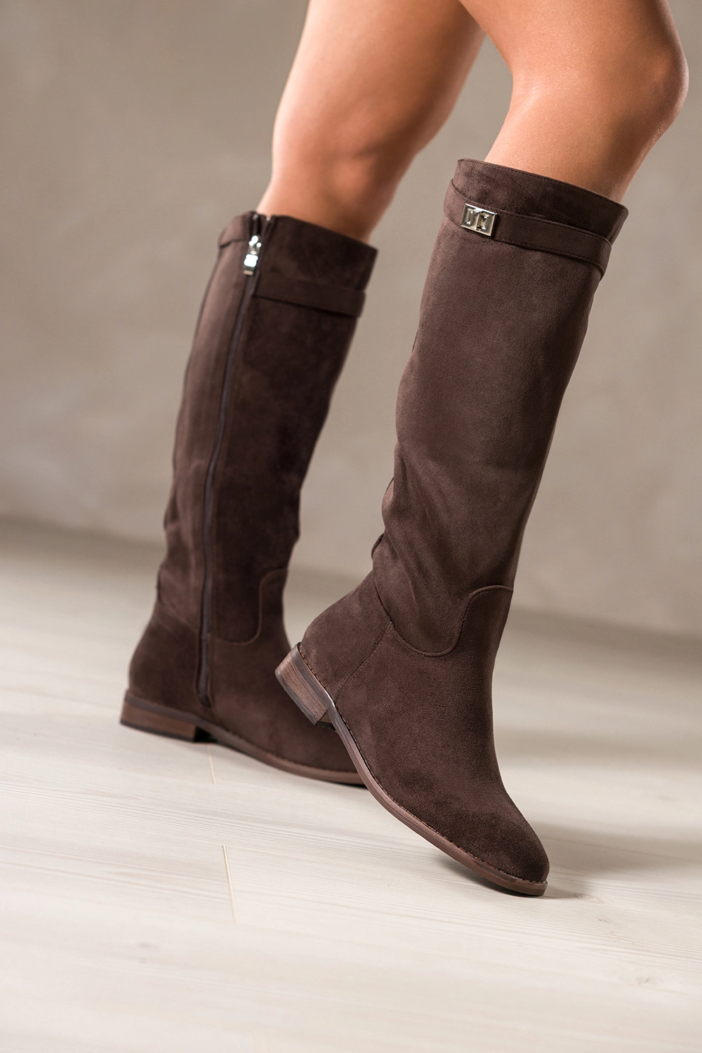 Czekoladowe kozaki damskie przed kolano na cholewce pasek z ozdobą niski obcas klocek Casu model 11-7 przyciągają wzrok głębokim, ciepłym odcieniem i elegancką linią, która subtelnie wysmukla nogę. Miękki w dotyku zamsz ekologiczny oraz zaokrąglony nosek nadają im szlachetności, a charakterystyczny pasek ze srebrną ozdobą w górnej części cholewki dodaje nowoczesnego wykończenia.