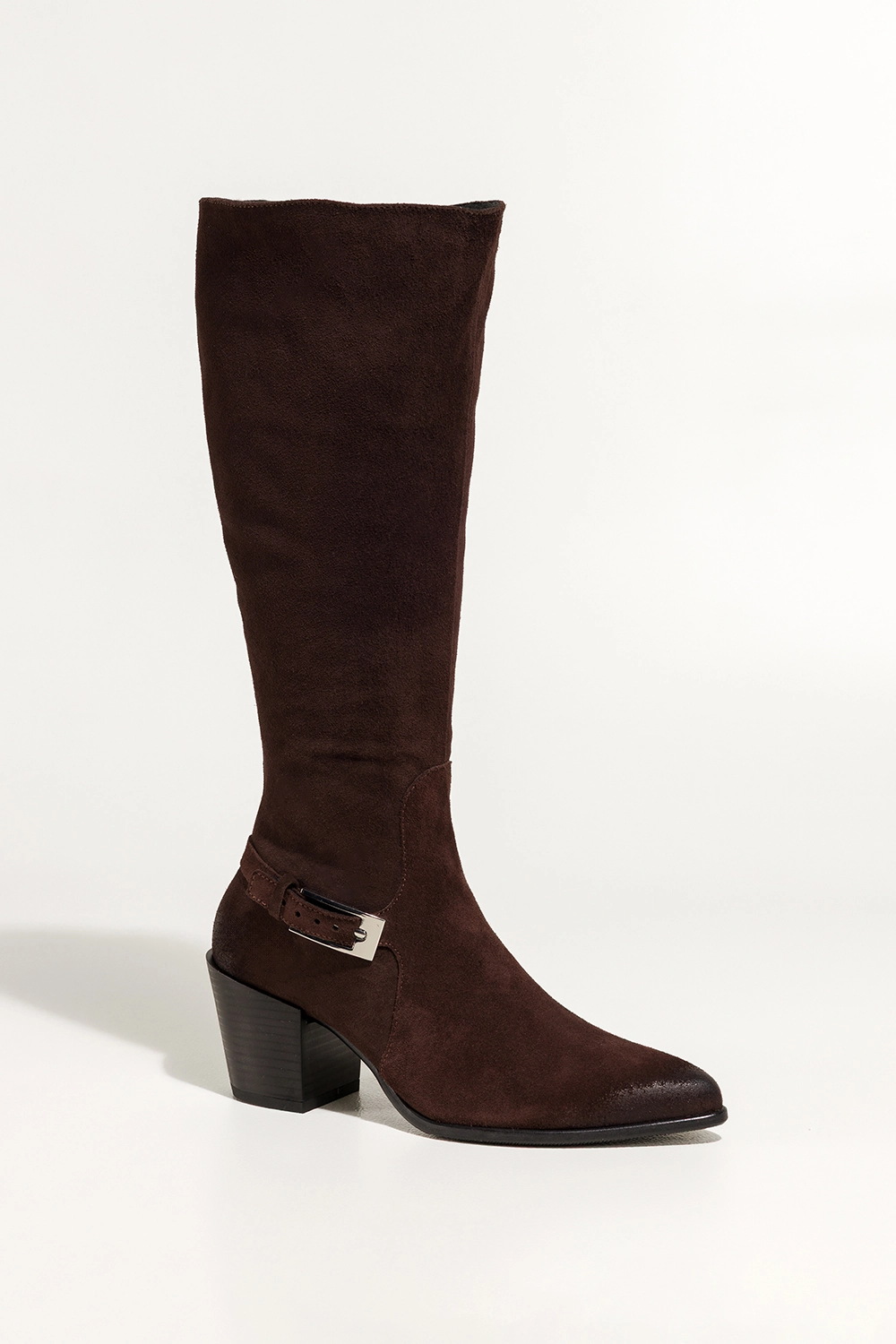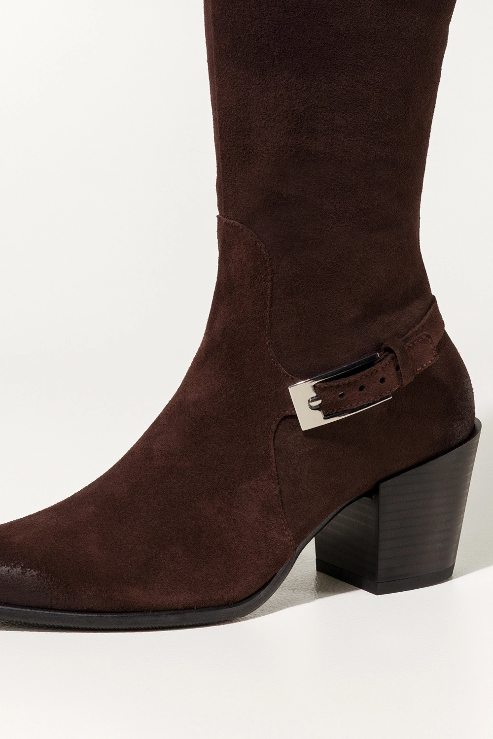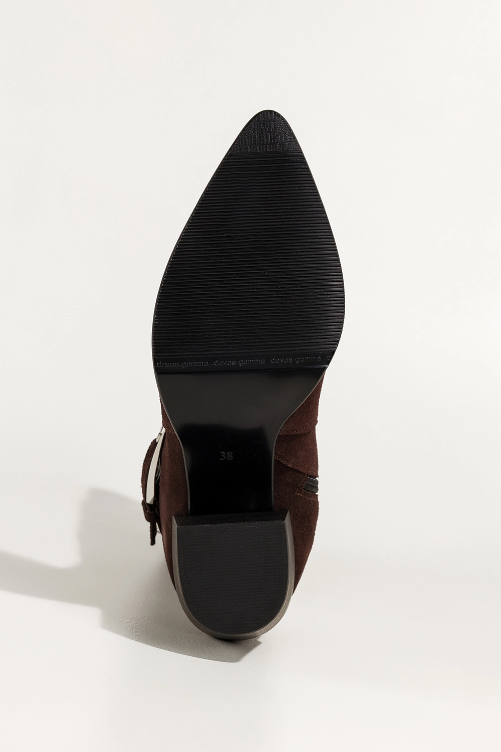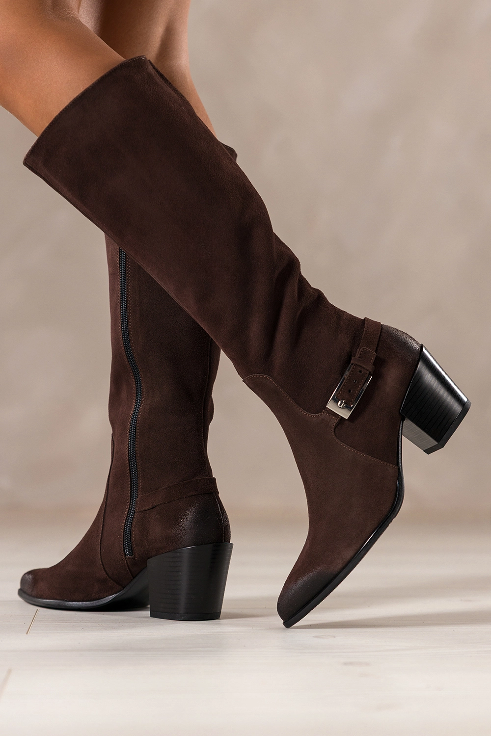 Zainspirowane duchem Dzikiego Zachodu, te kozaki kowbojki wyróżniają się szpiczastym noskiem i dekoracyjną cholewką ozdobioną paskiem ze srebrną klamrą. Czekoladowy odcień skóry zamszowej dodaje głębi i klasy, sprawiając, że pasują zarówno do codziennych stylizacji, jak i bardziej eleganckich wyjść. Świetnie komponują się z jeansami, sukienkami boho, a także jesiennymi płaszczami i wełnianymi spódnicami.