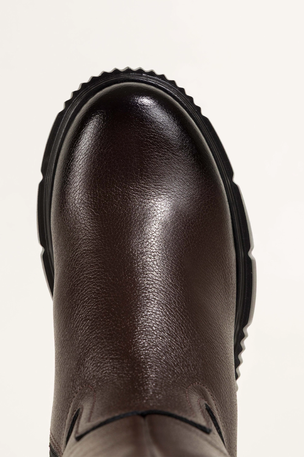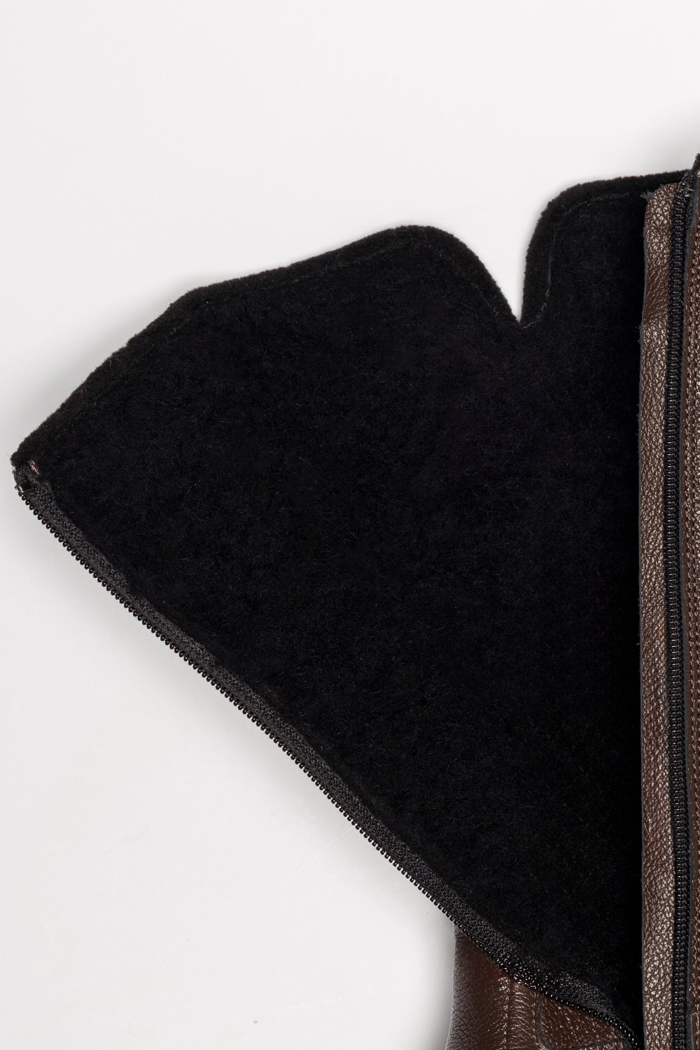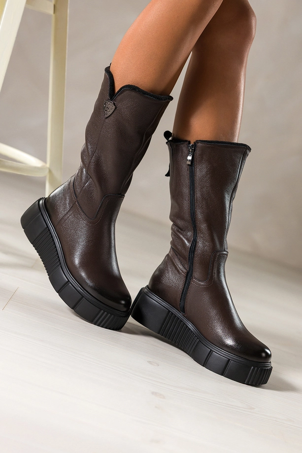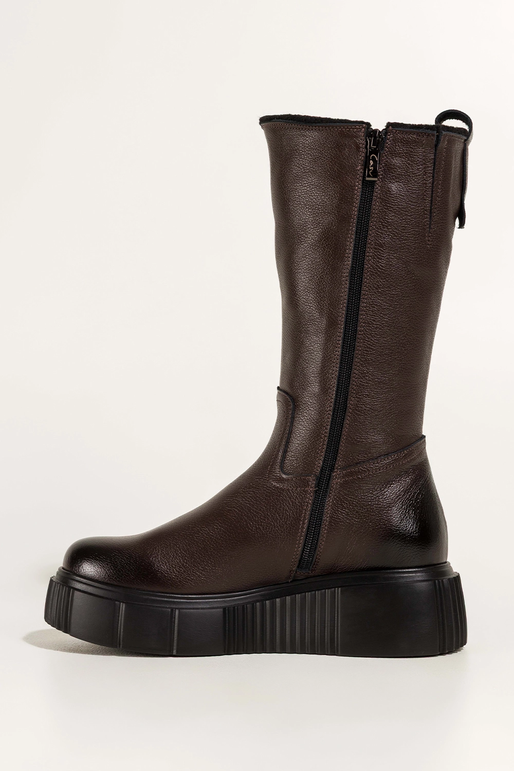 Czekoladowe kozaki skórzane damskie przed kolano na żłobionej platformie wycięta cholewka stalowa ozdoba PRODUKT POLSKI Casu model 29878, to polska jakości premium. Wykonane z miękkiej, naturalnej skóry, zachwycają trwałością oraz komfortem noszenia. Ocieplane miękkim kożuszkiem, idealnie sprawdzają się w chłodne dni, gwarantując ciepło i wygodę bez kompromisów. Zapinane na zamek, z solidną platformą i starannym wykończeniem, to obuwie, które posłuży przez wiele sezonów.
