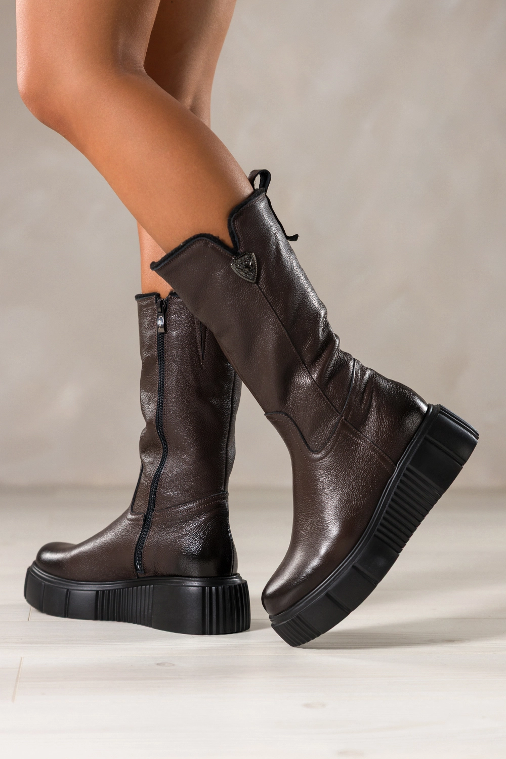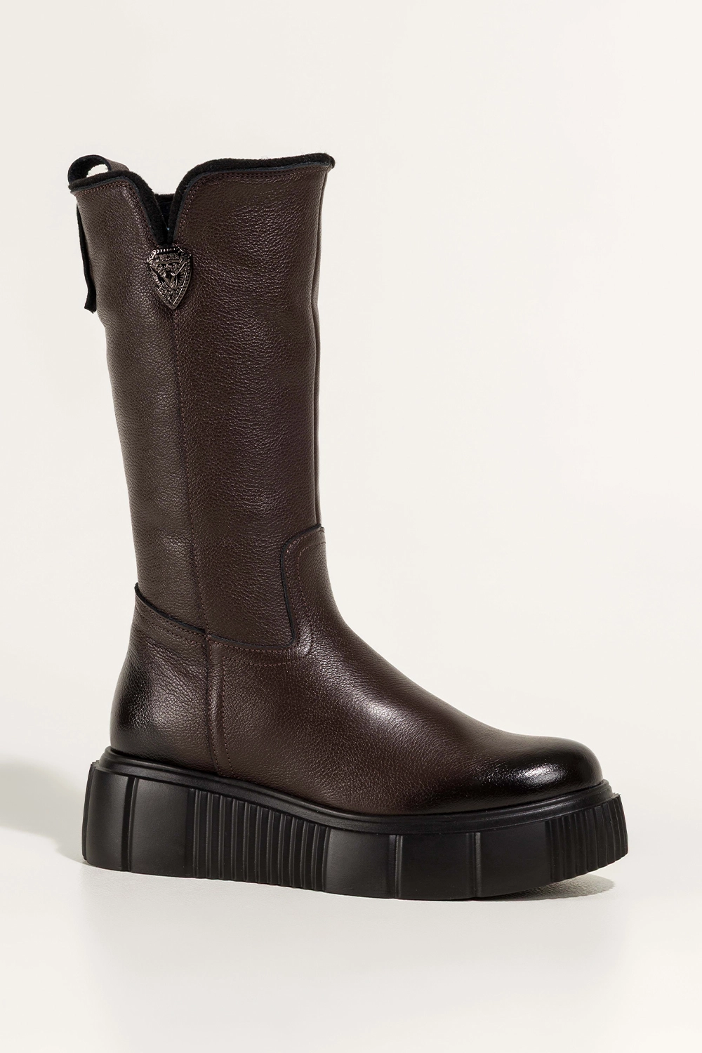Żłobiona platforma, wycięta cholewka wykończona kożuszkiem oraz subtelna, stalowa ozdoba nadają tym kozakom unikalny, nowoczesny charakter. Zaokrąglony nosek dodaje lekkości, a głęboki czekoladowy odcień skóry świetnie komponuje się zarówno z codziennymi stylizacjami, jak i bardziej eleganckimi zestawami. Te kozaki to idealne połączenie ponadczasowej klasyki z modowym twistem, który pokochają kobiety ceniące wyrazisty styl.