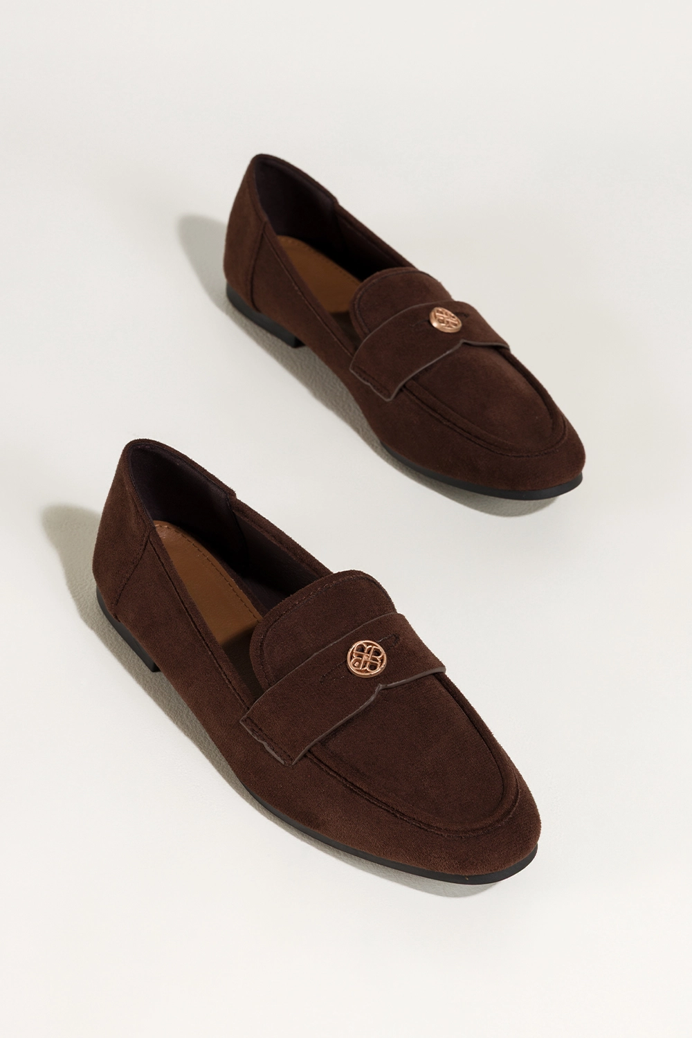 Czekoladowe mokasyny damskie ze złotą ozdobą Carla 0288. Wykonane z miękkiej, zamszowej skóry ekologicznej najwyższej jakości, zachwycają aksamitnym wykończeniem i perfekcyjnym dopasowaniem do stopy. Miękka wkładka ze skóry ekologicznej zwiększa wygodę, nawet podczas całodziennego użytkowania. Starannie obszyta cholewka i subtelne detale gwarantują trwałość.