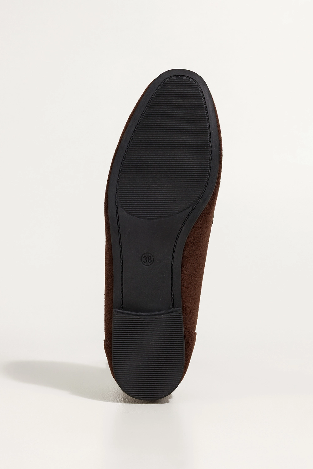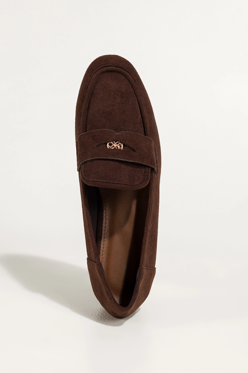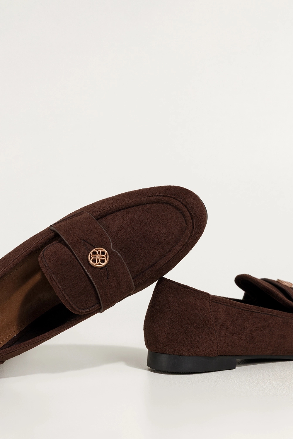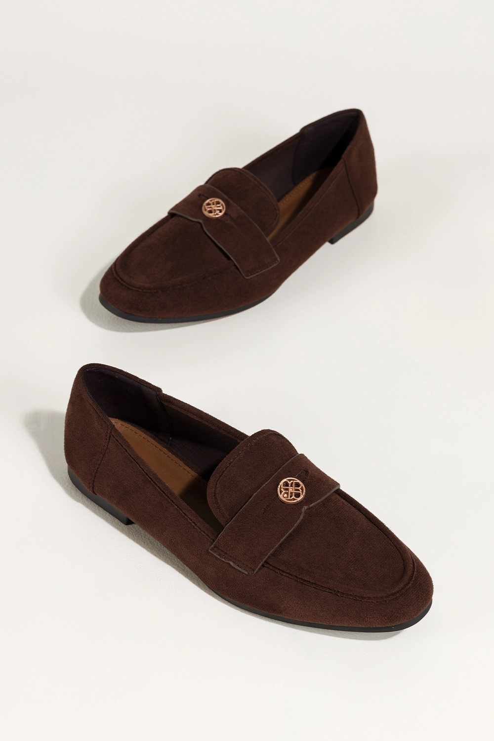 Czekoladowe mokasyny damskie ze złotą ozdobą Carla 0288