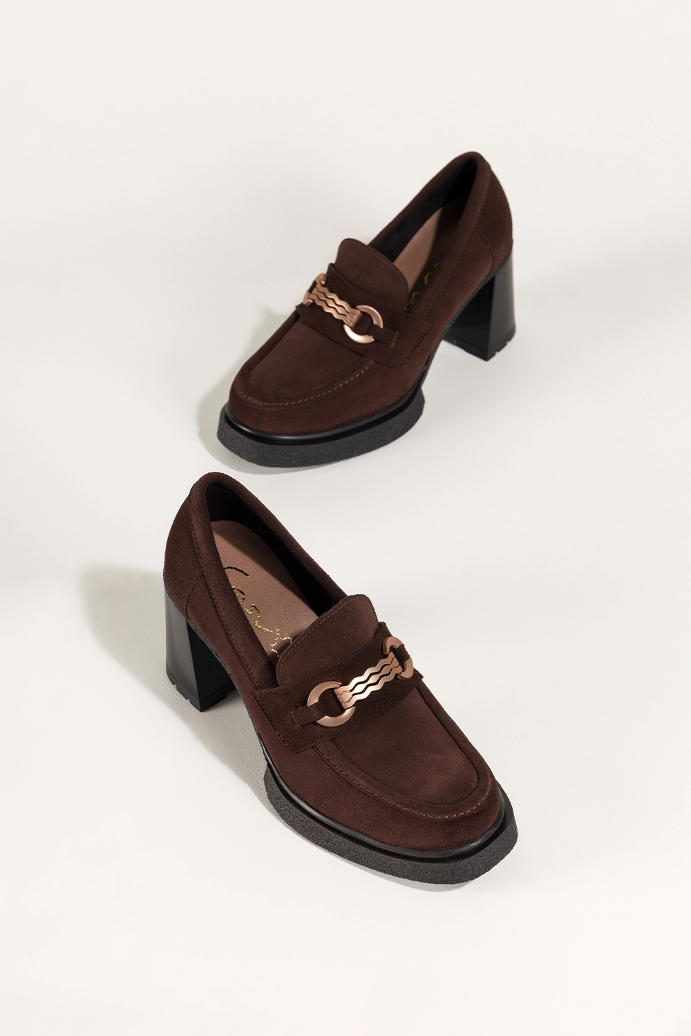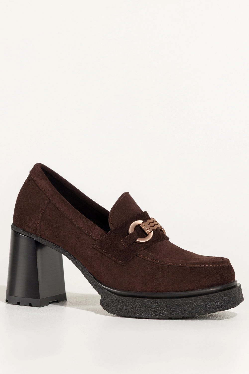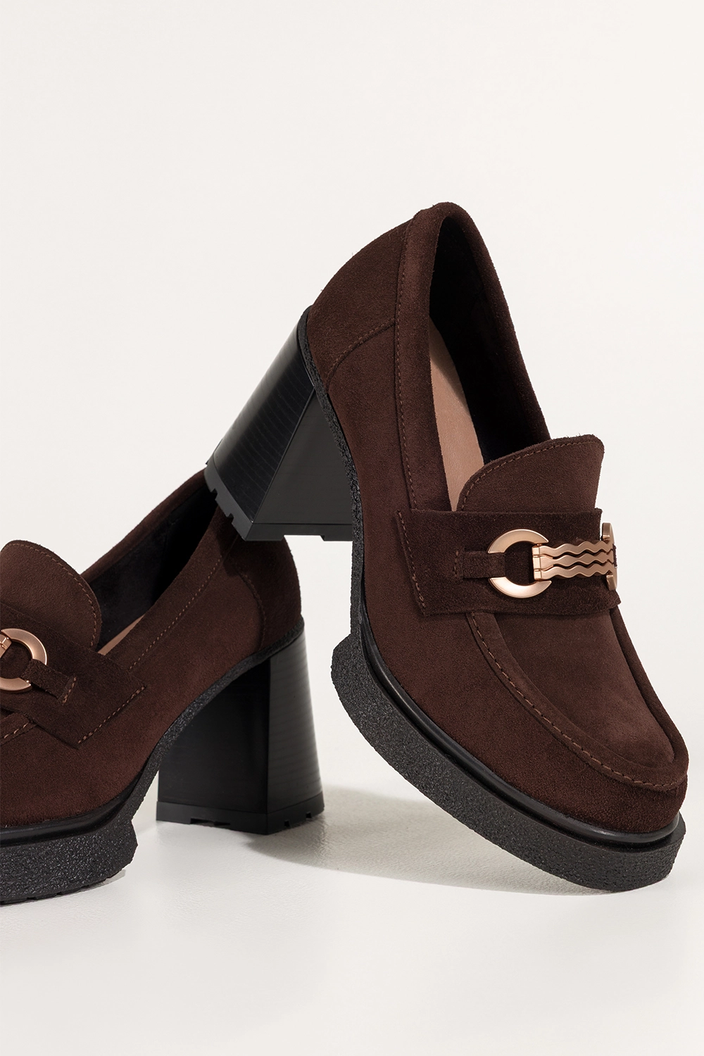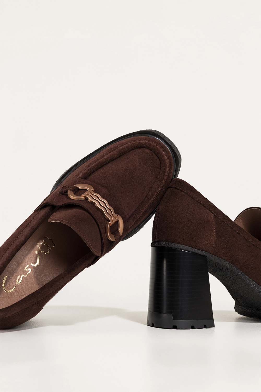 Czekoladowe mokasyny skórzane damskie na szerokim klocku ze złotą sprzączką PRODUKT POLSKI Casu model 79822. Wykonane z miękkiej, wysokogatunkowej skóry zamszowej, zapewniają nie tylko doskonały komfort noszenia, ale i trwałość. Skórzana, oddychająca wkładka sprawia, że każdy krok staje się przyjemnością, a zaokrąglony nosek dodaje klasycznego uroku, który nie wychodzi z mody.