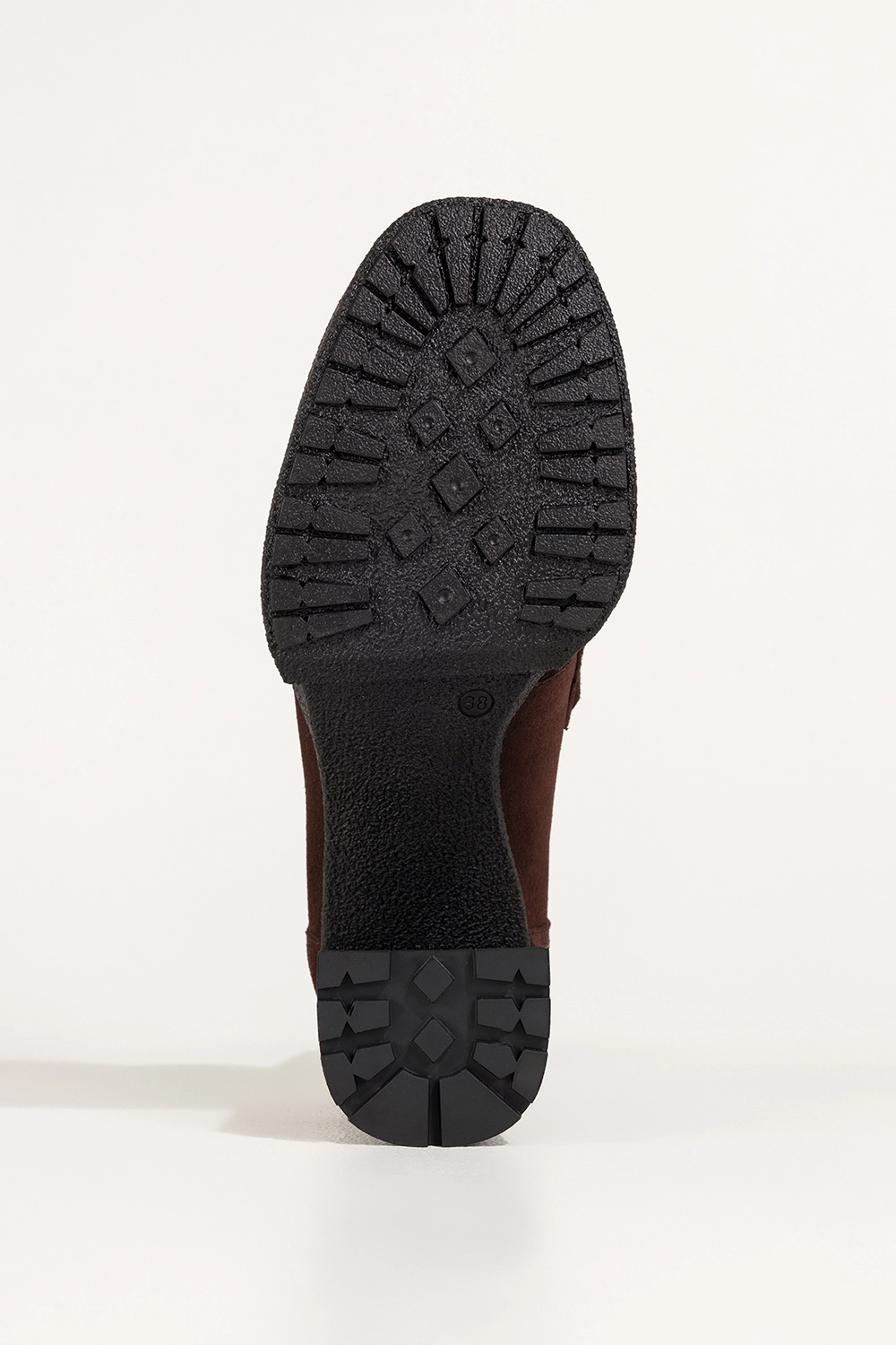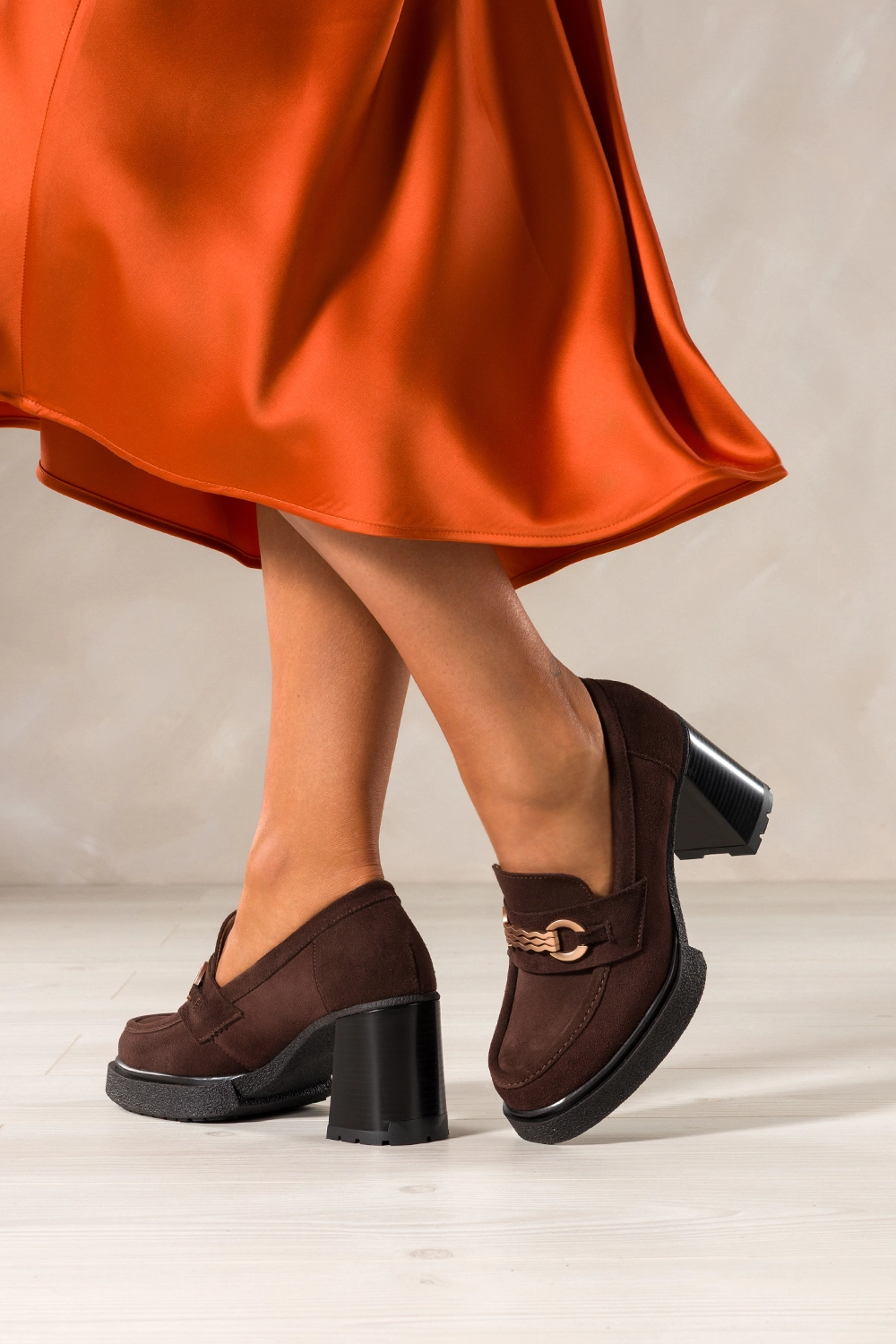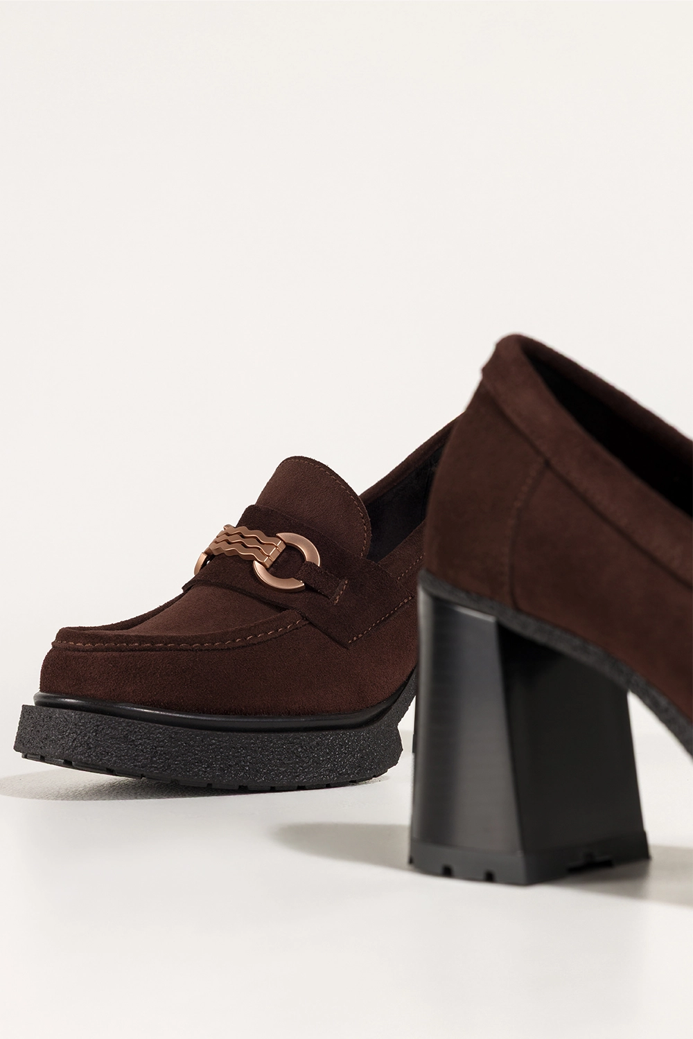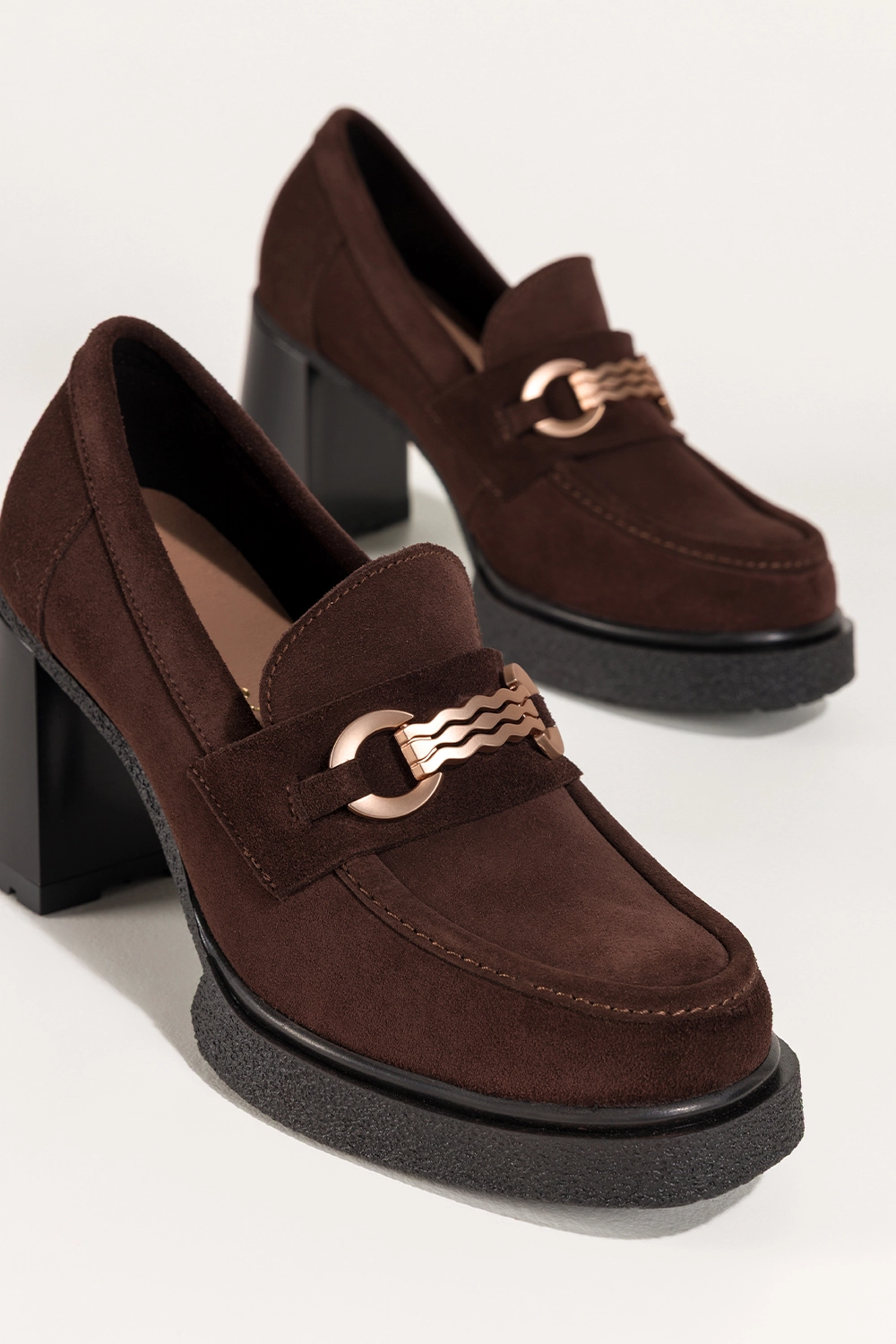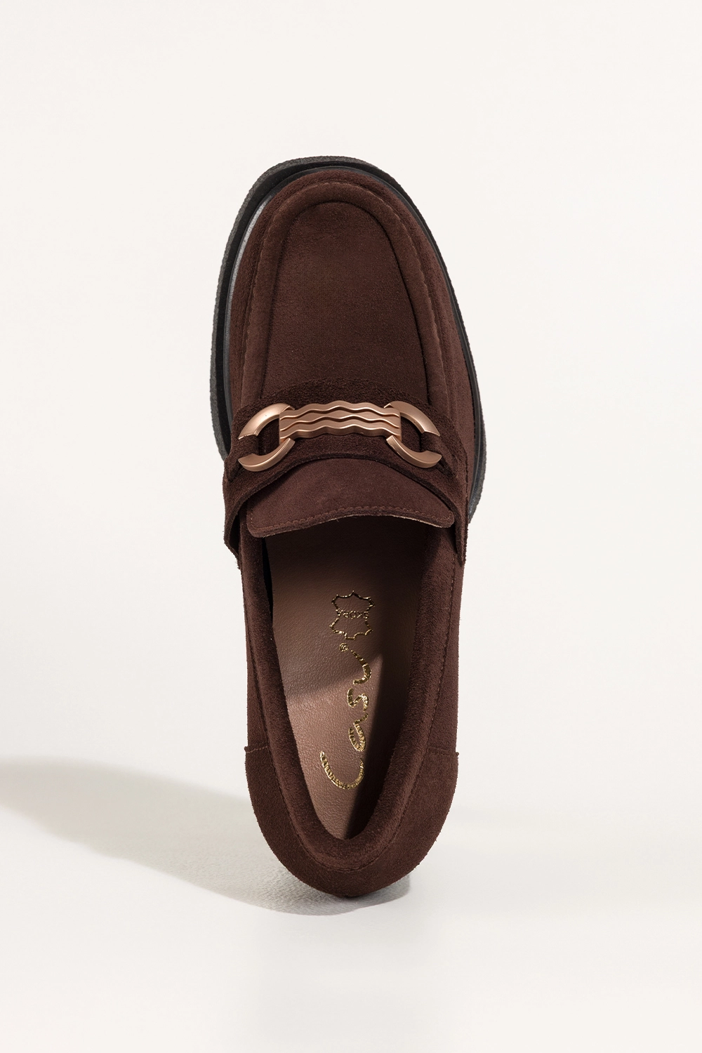 Czekoladowe mokasyny skórzane damskie na szerokim klocku ze złotą sprzączką PRODUKT POLSKI Casu model 79822. Wykonane z miękkiej, wysokogatunkowej skóry zamszowej, zapewniają nie tylko doskonały komfort noszenia, ale i trwałość. Skórzana, oddychająca wkładka sprawia, że każdy krok staje się przyjemnością, a zaokrąglony nosek dodaje klasycznego uroku, który nie wychodzi z mody.