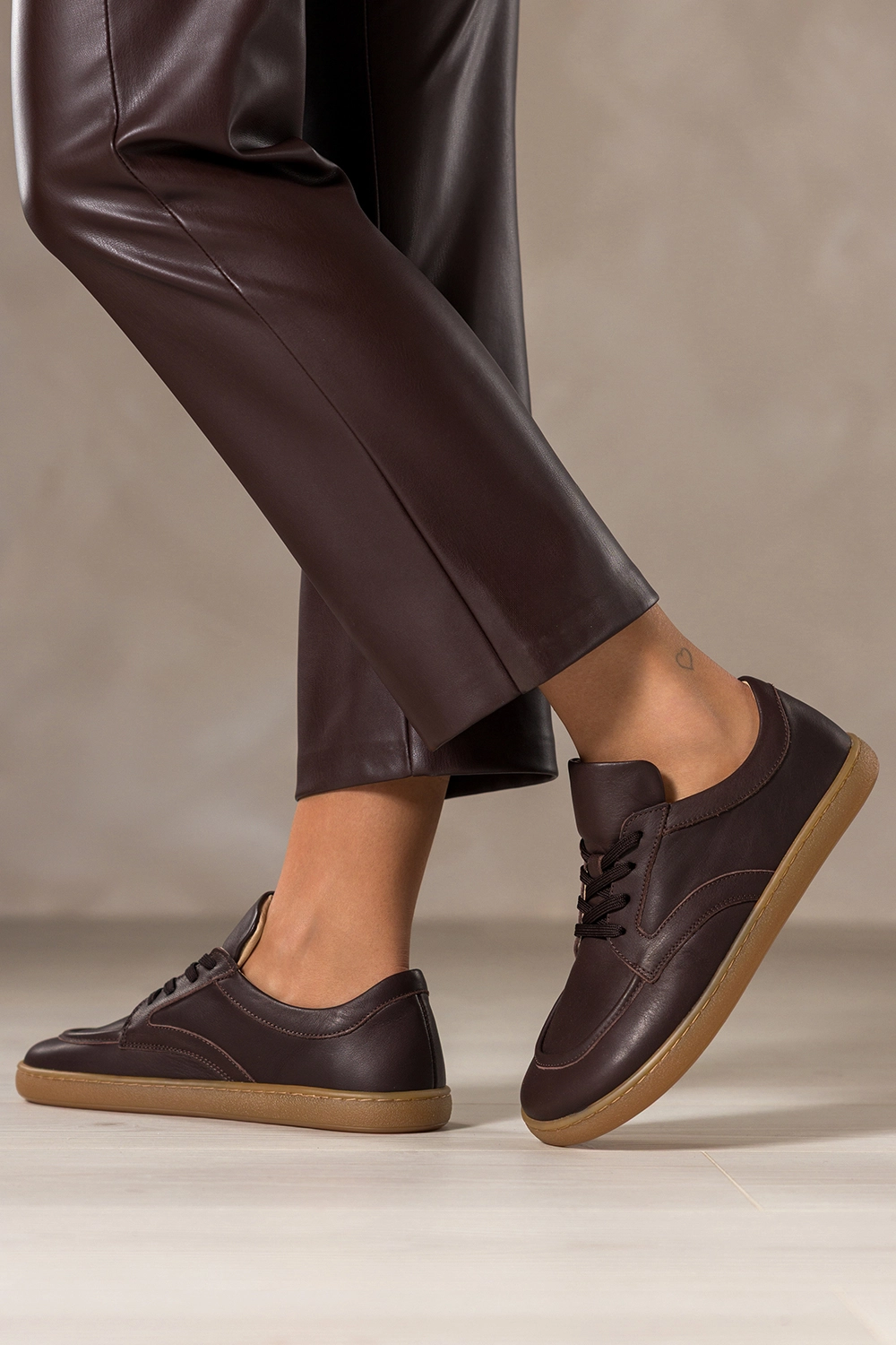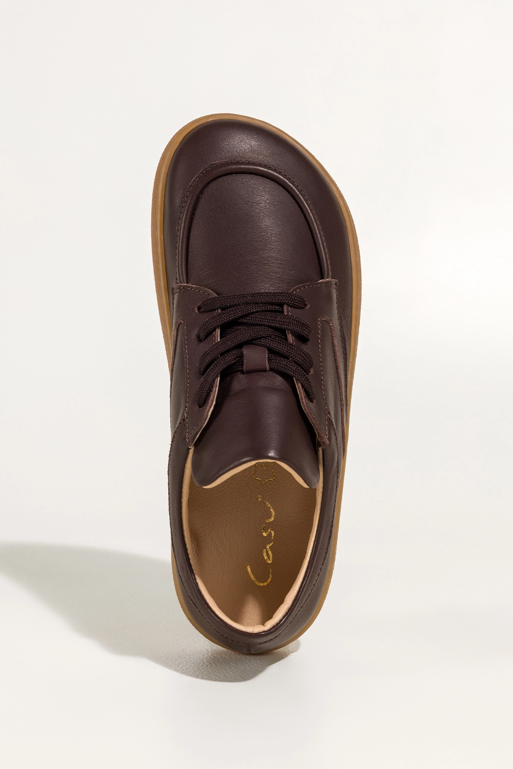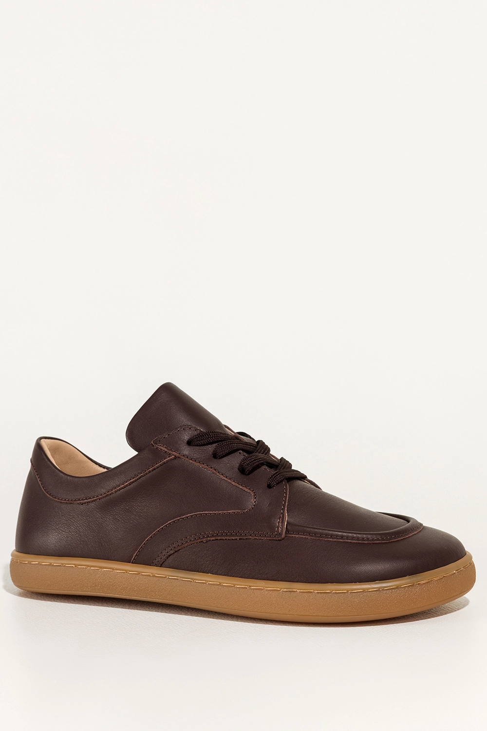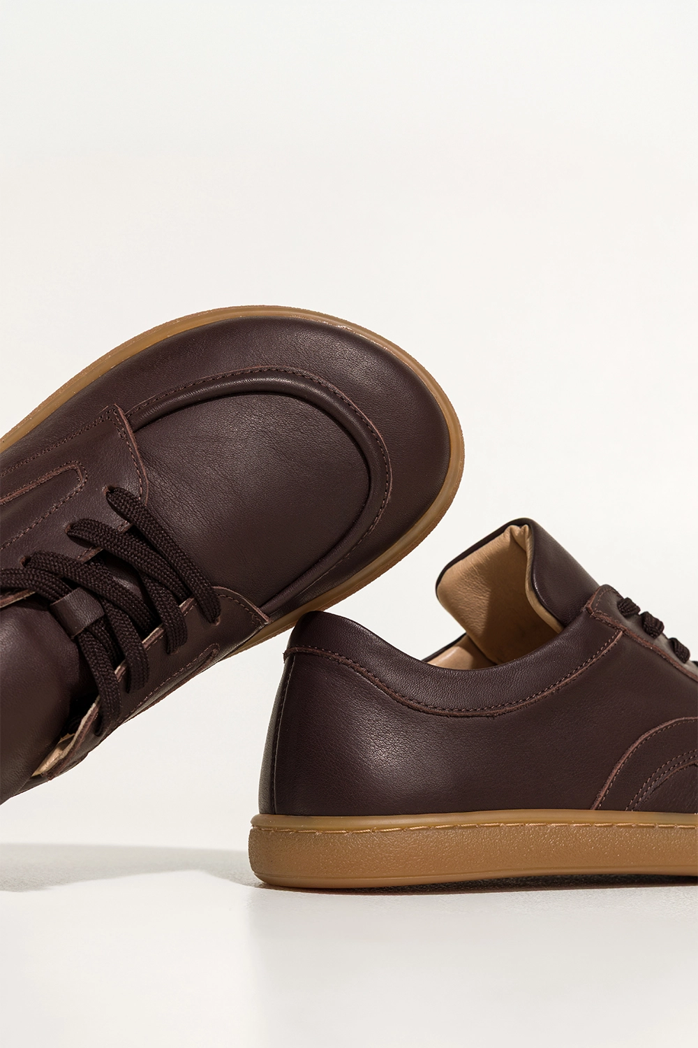 Czekoladowy odcień cholewki i stylowe przeszycia nadają butom ponadczasowego charakteru. Zaokrąglony, szeroki nosek oraz klasyczne sznurowanie w tonacji czekoladowej sprawiają, że obuwie wpisuje się w naturalny, minimalistyczny styl barefoot. Te półbuty świetnie prezentują się w stylizacjach codziennych, z jeansami, lnianymi sukienkami czy casualowymi spodniami, ale równie dobrze dopełnią look w stylu smart casual.