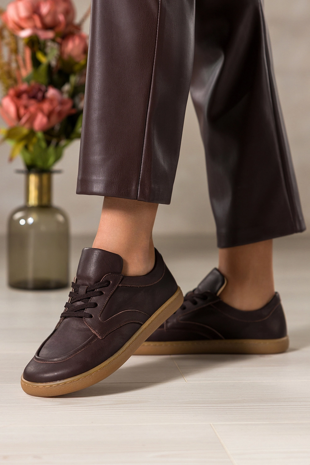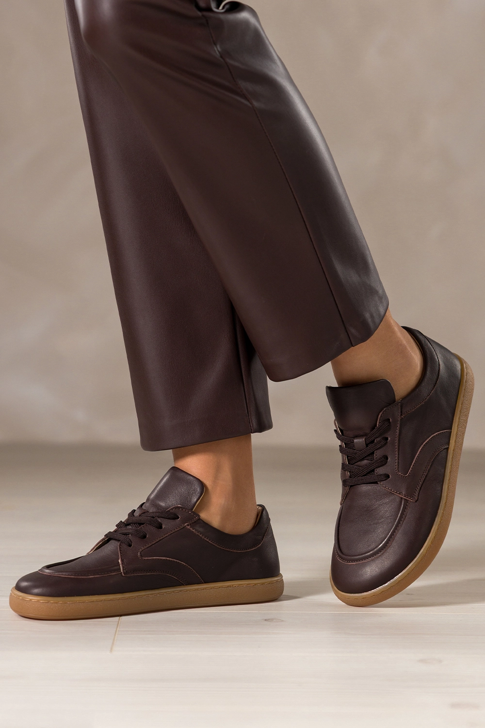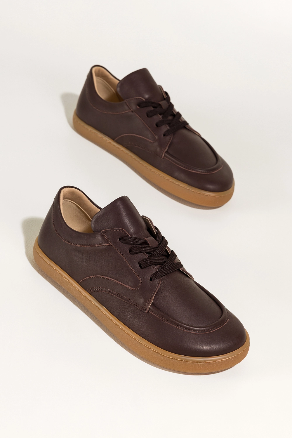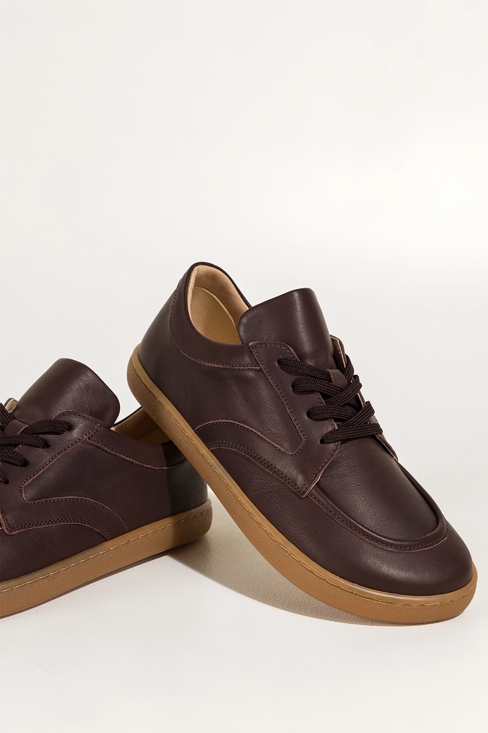 Czekoladowy odcień cholewki i stylowe przeszycia nadają butom ponadczasowego charakteru. Zaokrąglony, szeroki nosek oraz klasyczne sznurowanie w tonacji czekoladowej sprawiają, że obuwie wpisuje się w naturalny, minimalistyczny styl barefoot. Te półbuty świetnie prezentują się w stylizacjach codziennych, z jeansami, lnianymi sukienkami czy casualowymi spodniami, ale równie dobrze dopełnią look w stylu smart casual.