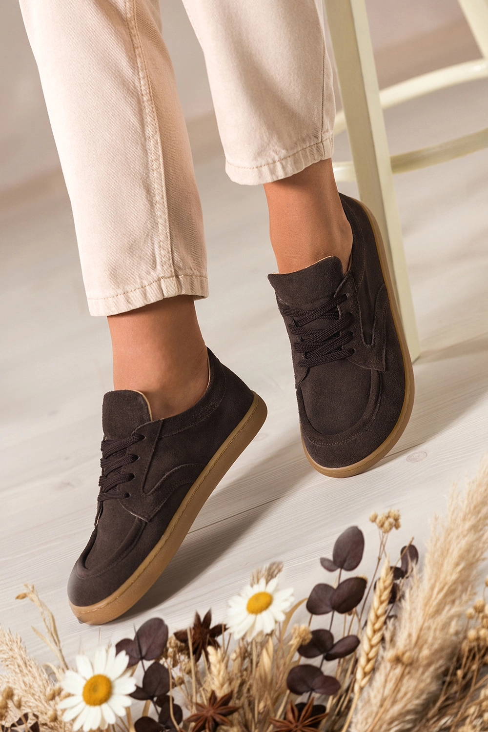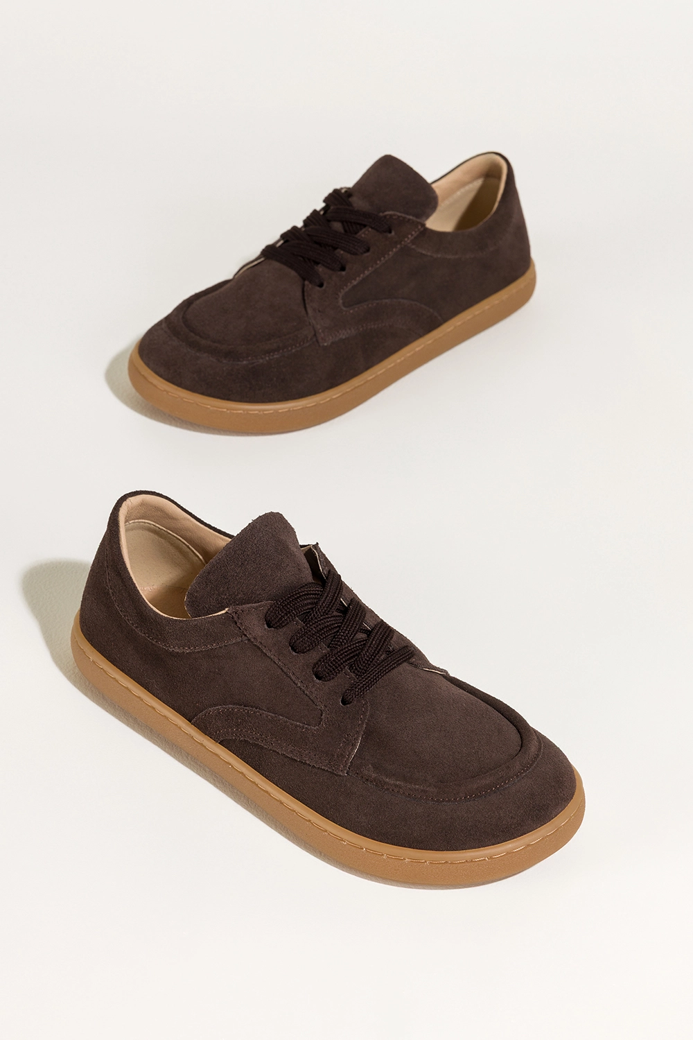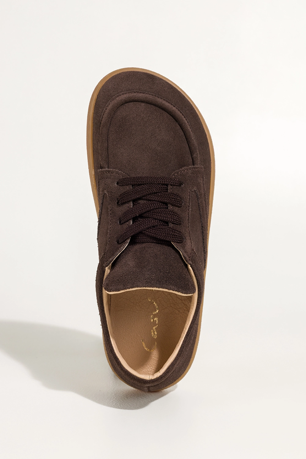 Czekoladowe półbuty barefoot skórzane zamszowe damskie szerokie na elastycznej płaskiej podeszwie cholewka z przeszyciami sznurowane PRODUKT POLSKI Casu M8669