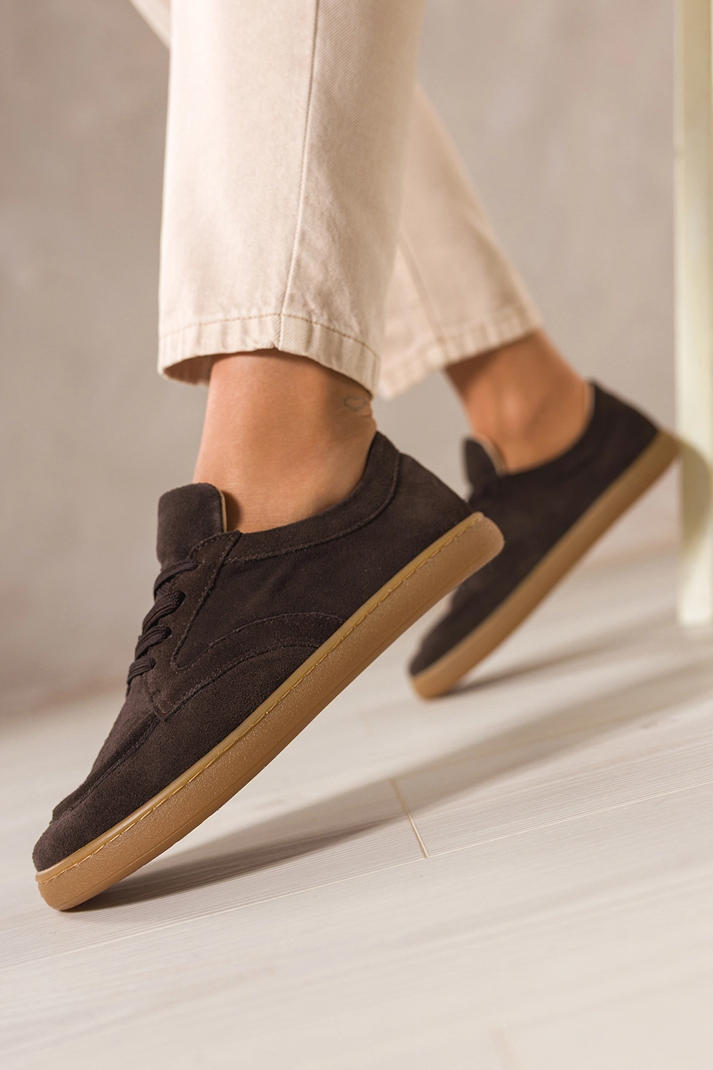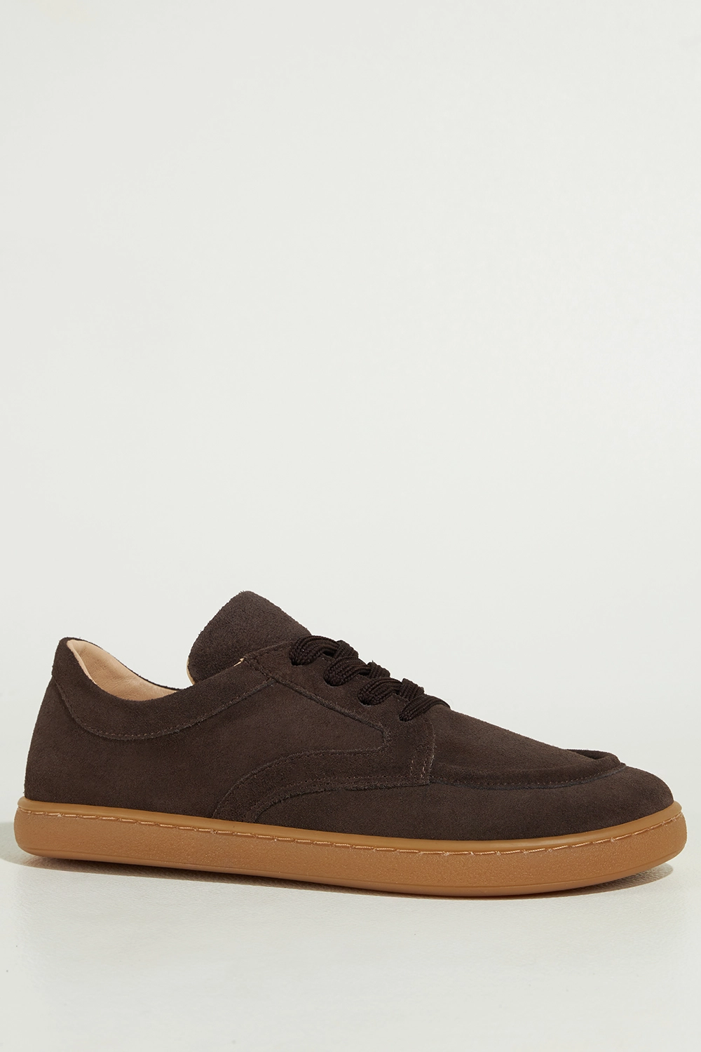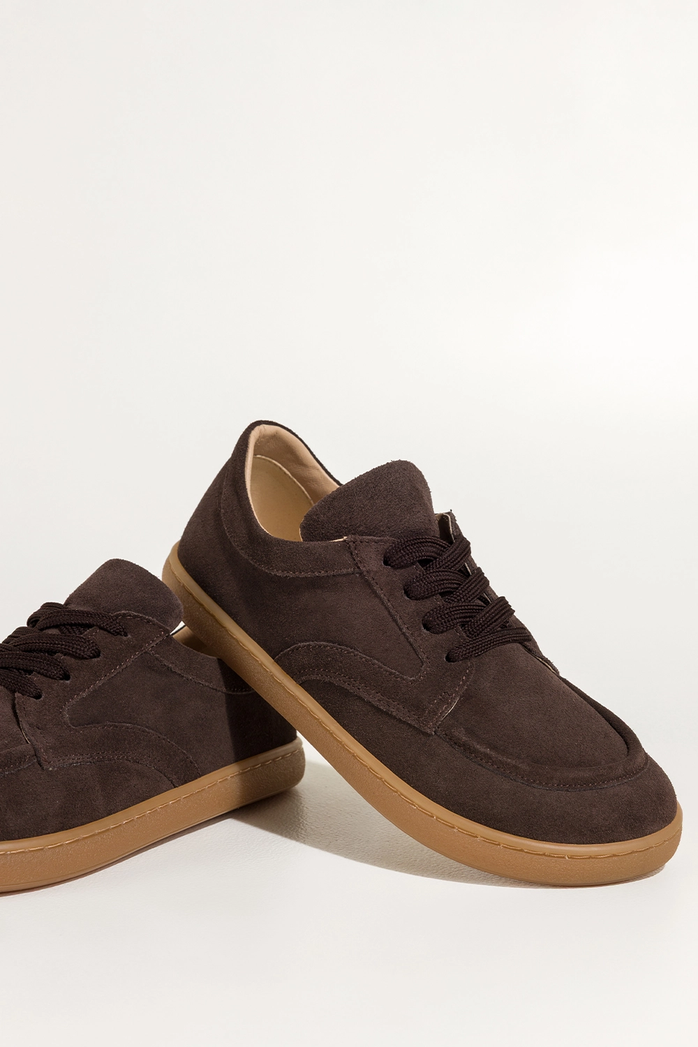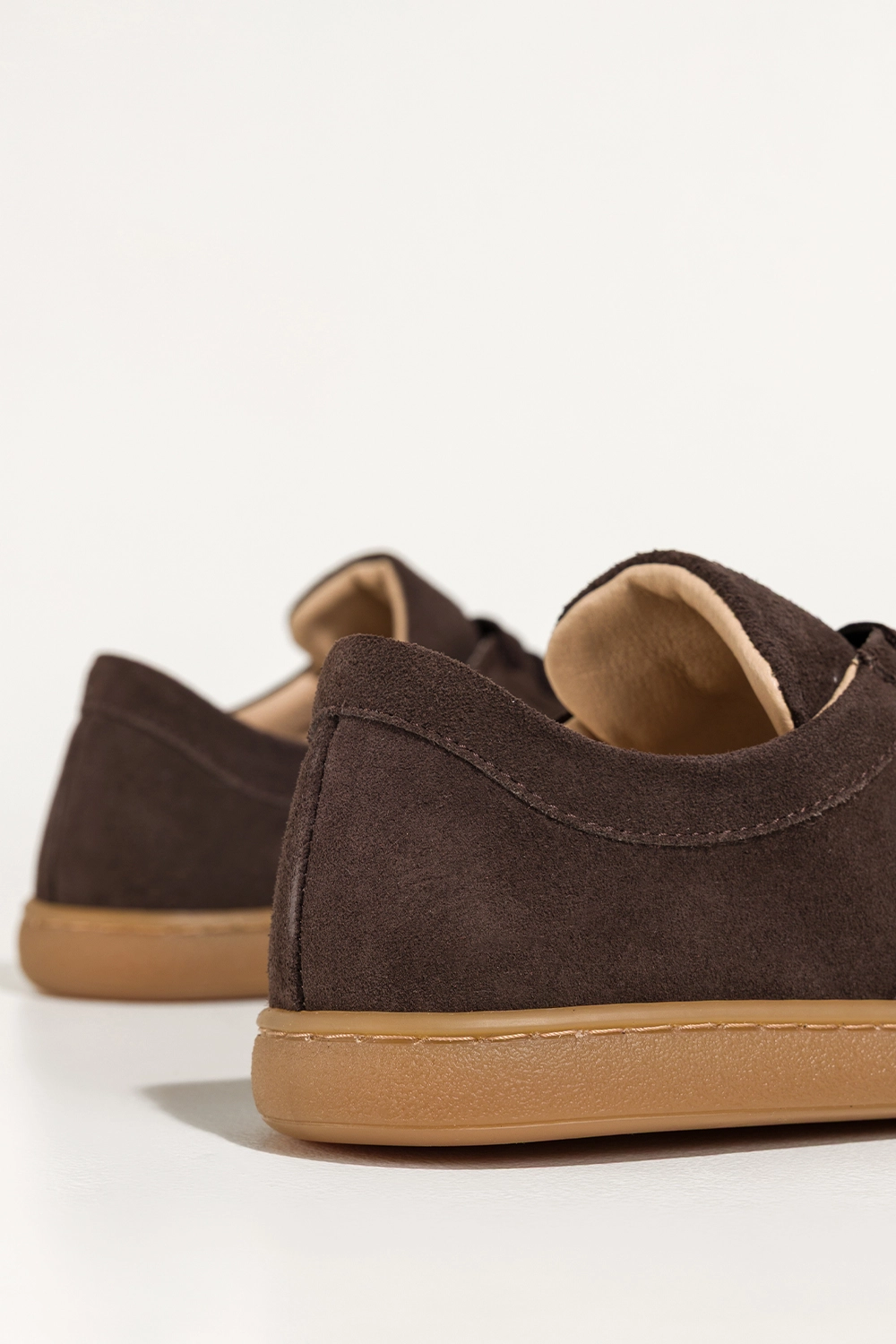 Czekoladowe półbuty barefoot skórzane zamszowe damskie szerokie na elastycznej płaskiej podeszwie cholewka z przeszyciami sznurowane PRODUKT POLSKI Casu M8669