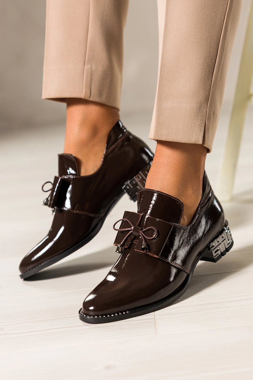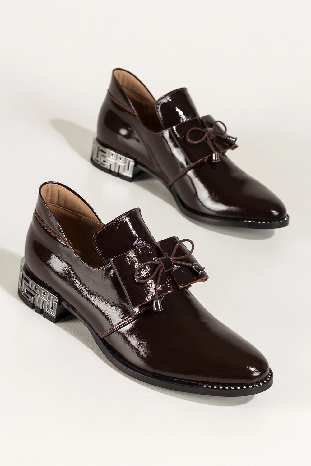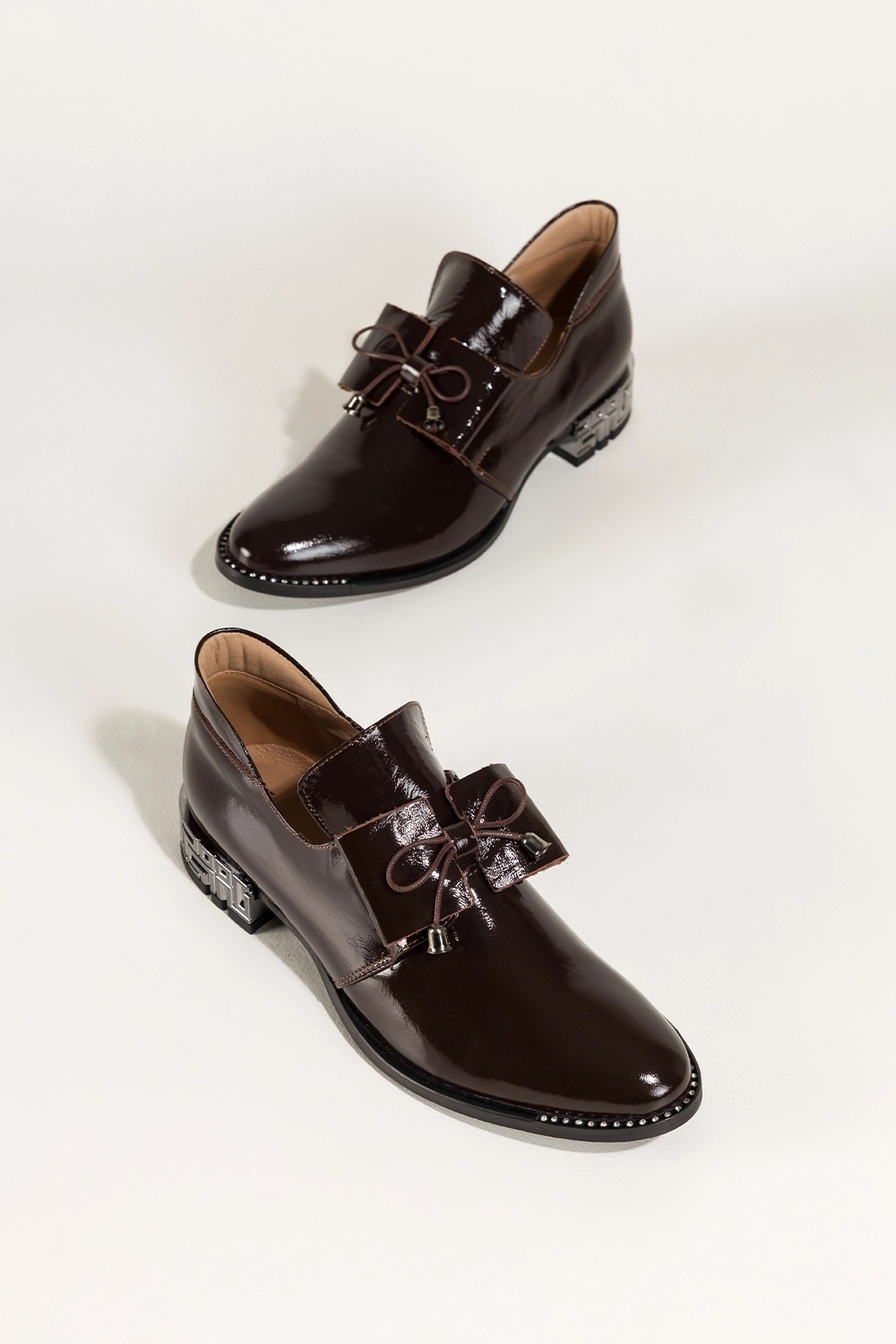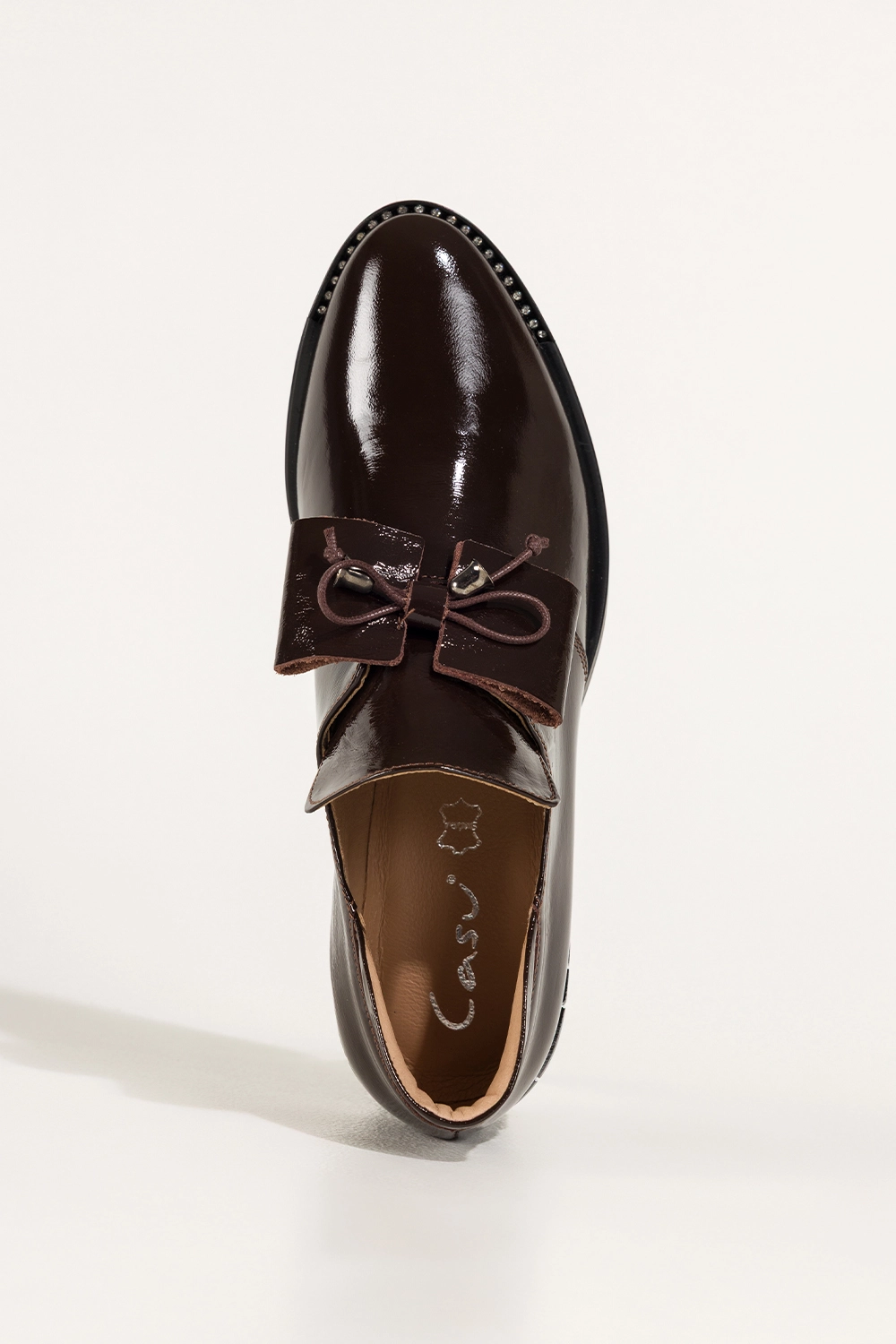 Czekoladowe półbuty skórzane damskie lakierowane dekoracyjny obcas wycięta cholewka kokarda PRODUKT POLSKI Casu model 8600, to połączenie luksusowego wyglądu z trwałością. Wykonane z wysokogatunkowej skóry naturalnej o lśniącym wykończeniu, zachwycają precyzją detali i elegancką formą. Miękka, skórzana wkładka zapewnia komfort nawet przy całodziennym noszeniu.