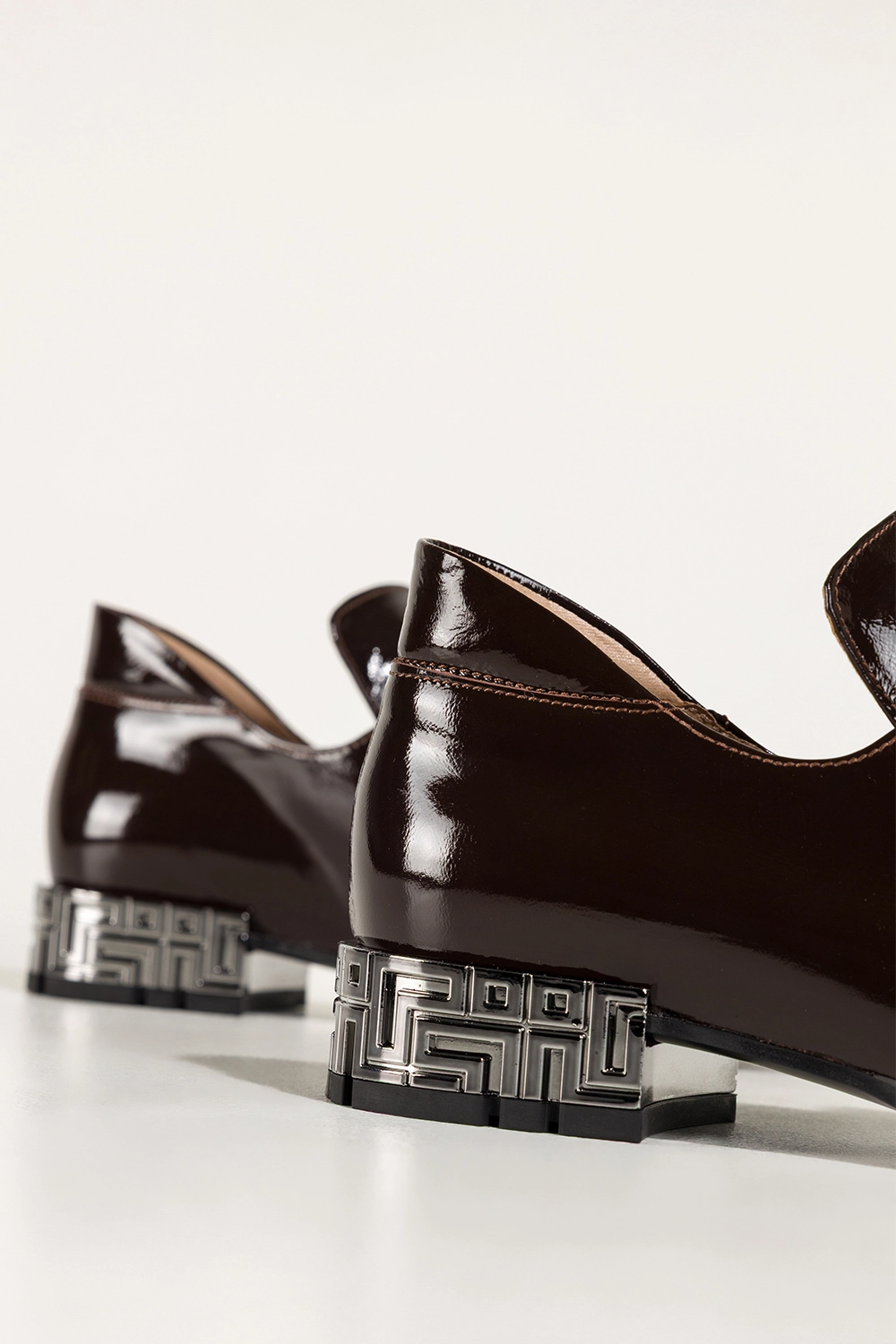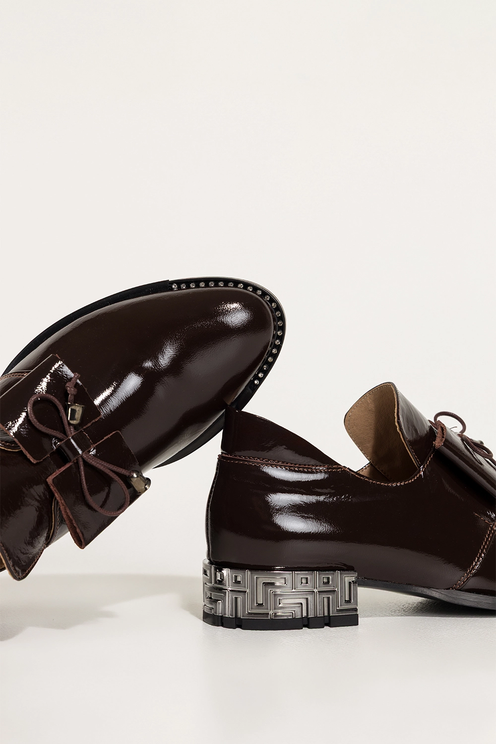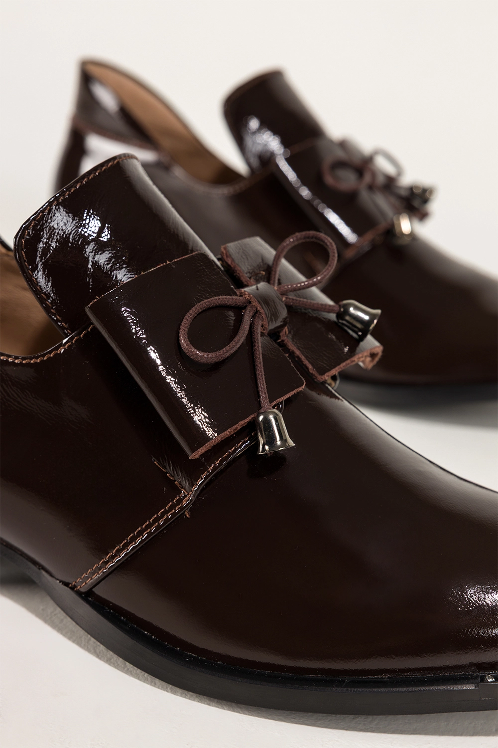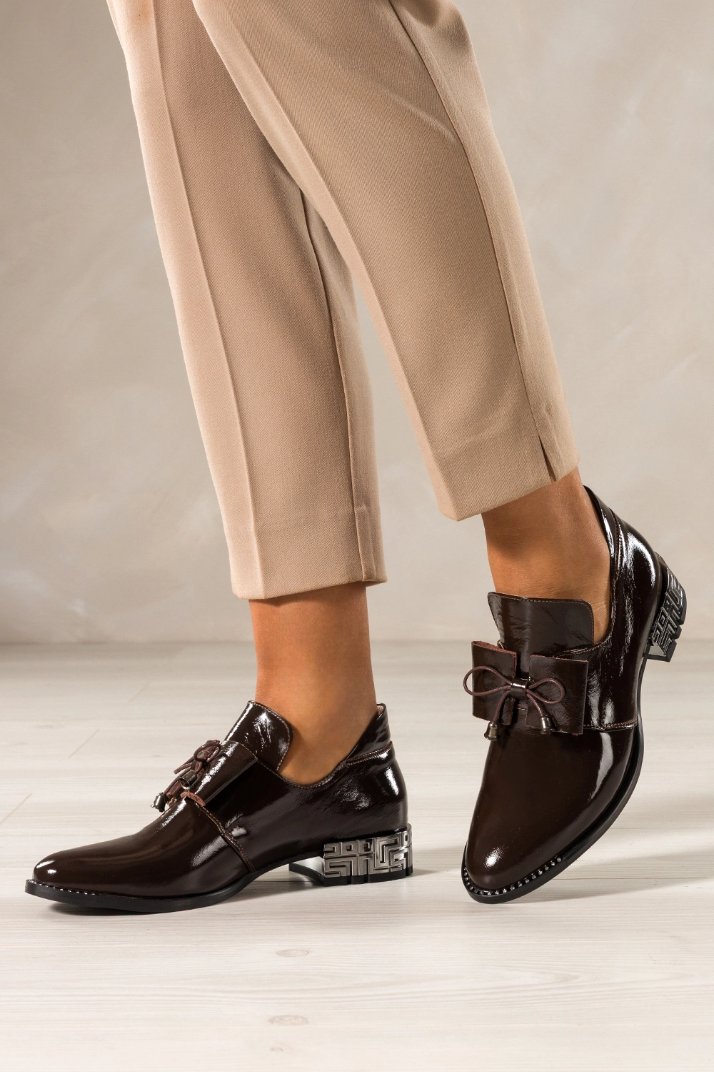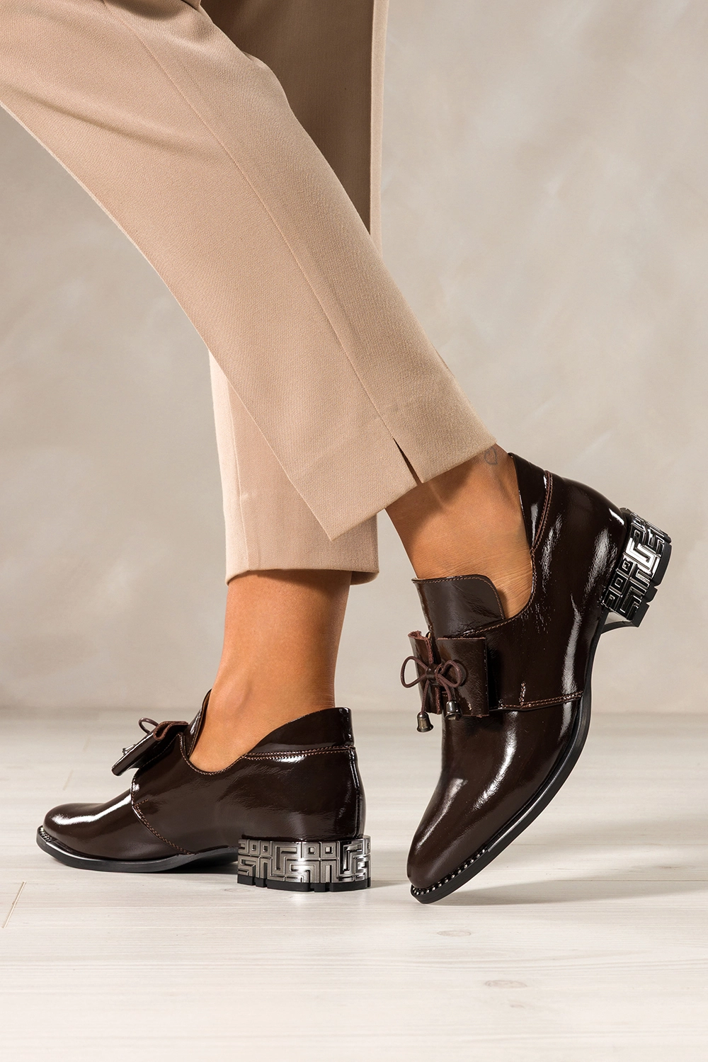 Czekoladowe półbuty skórzane damskie lakierowane dekoracyjny obcas wycięta cholewka kokarda PRODUKT POLSKI Casu model 8600, to połączenie luksusowego wyglądu z trwałością. Wykonane z wysokogatunkowej skóry naturalnej o lśniącym wykończeniu, zachwycają precyzją detali i elegancką formą. Miękka, skórzana wkładka zapewnia komfort nawet przy całodziennym noszeniu.