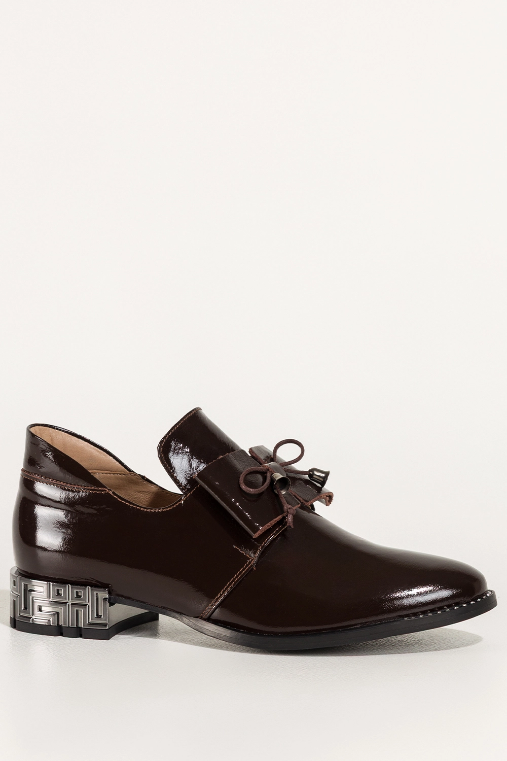 Czekoladowe półbuty skórzane damskie lakierowane dekoracyjny obcas wycięta cholewka kokarda PRODUKT POLSKI Casu 8600