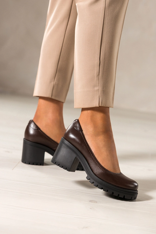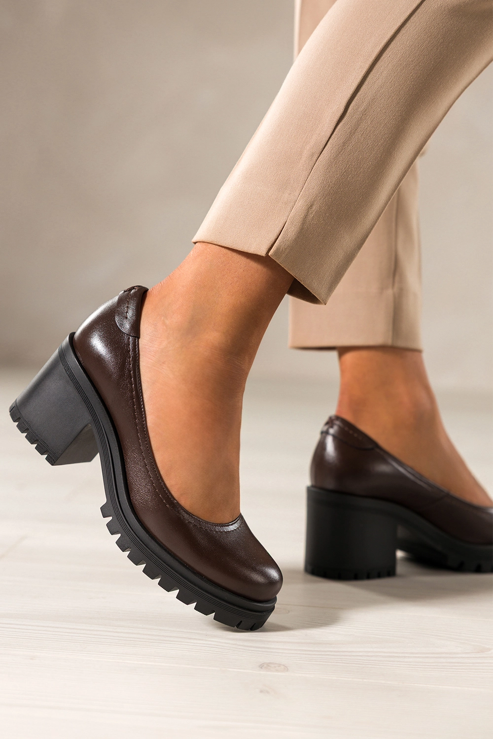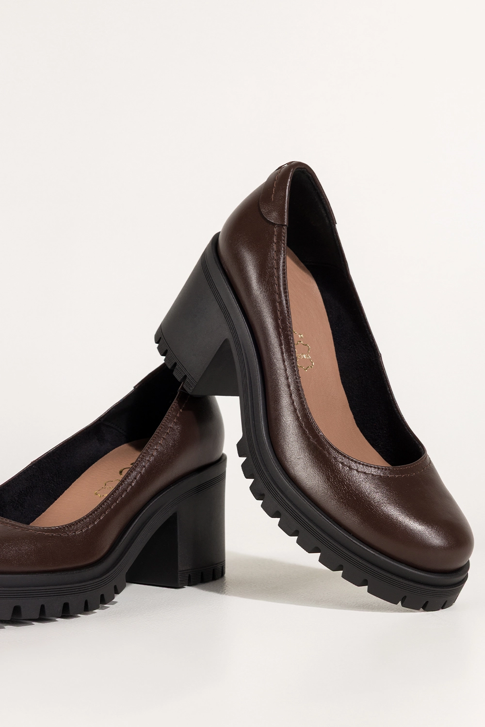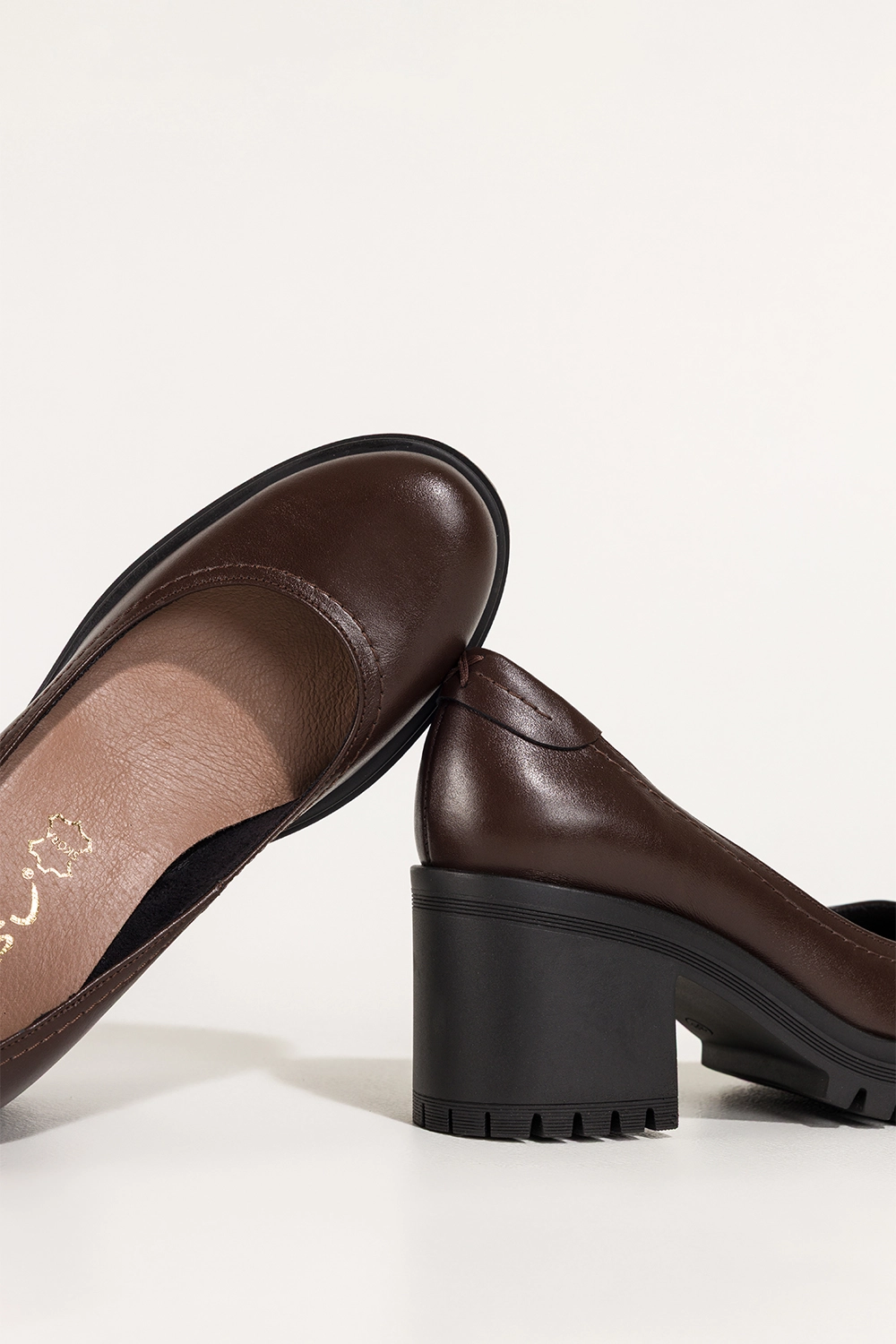 Półbuty doskonale sprawdzą się zarówno w stylizacjach casualowych, jak i bardziej eleganckich. Bieżnikowana platforma oraz szeroki słupek zapewniają nie tylko stabilność i bezpieczeństwo, ale też nadają sylwetce lekkości. Zaokrąglony nosek i głęboki, czekoladowy odcień czynią ten model wyjątkowo łatwym do zestawienia z wieloma kolorami i fakturami. To doskonały wybór na co dzień, do pracy, a także na spotkania towarzyskie.