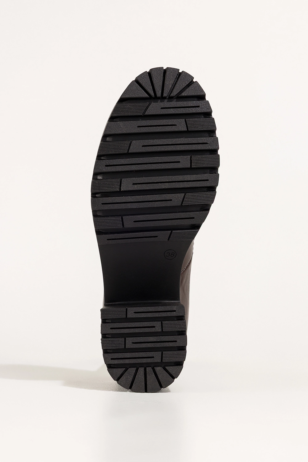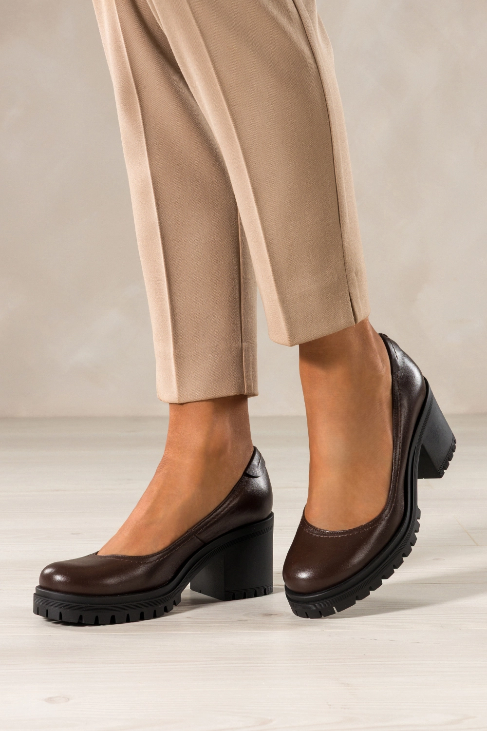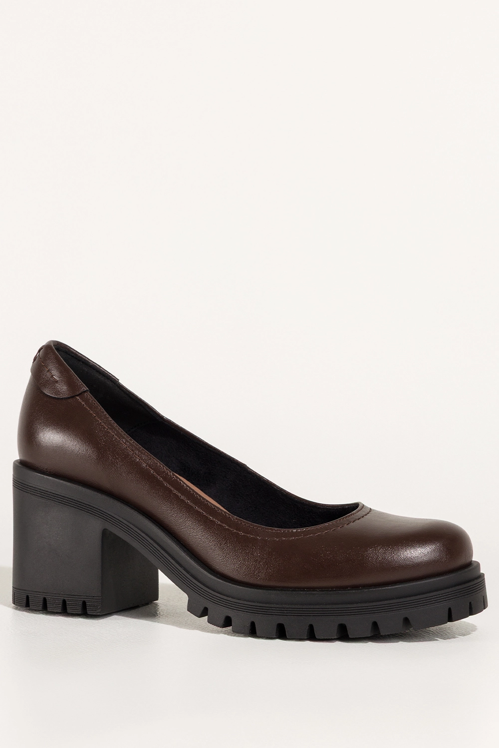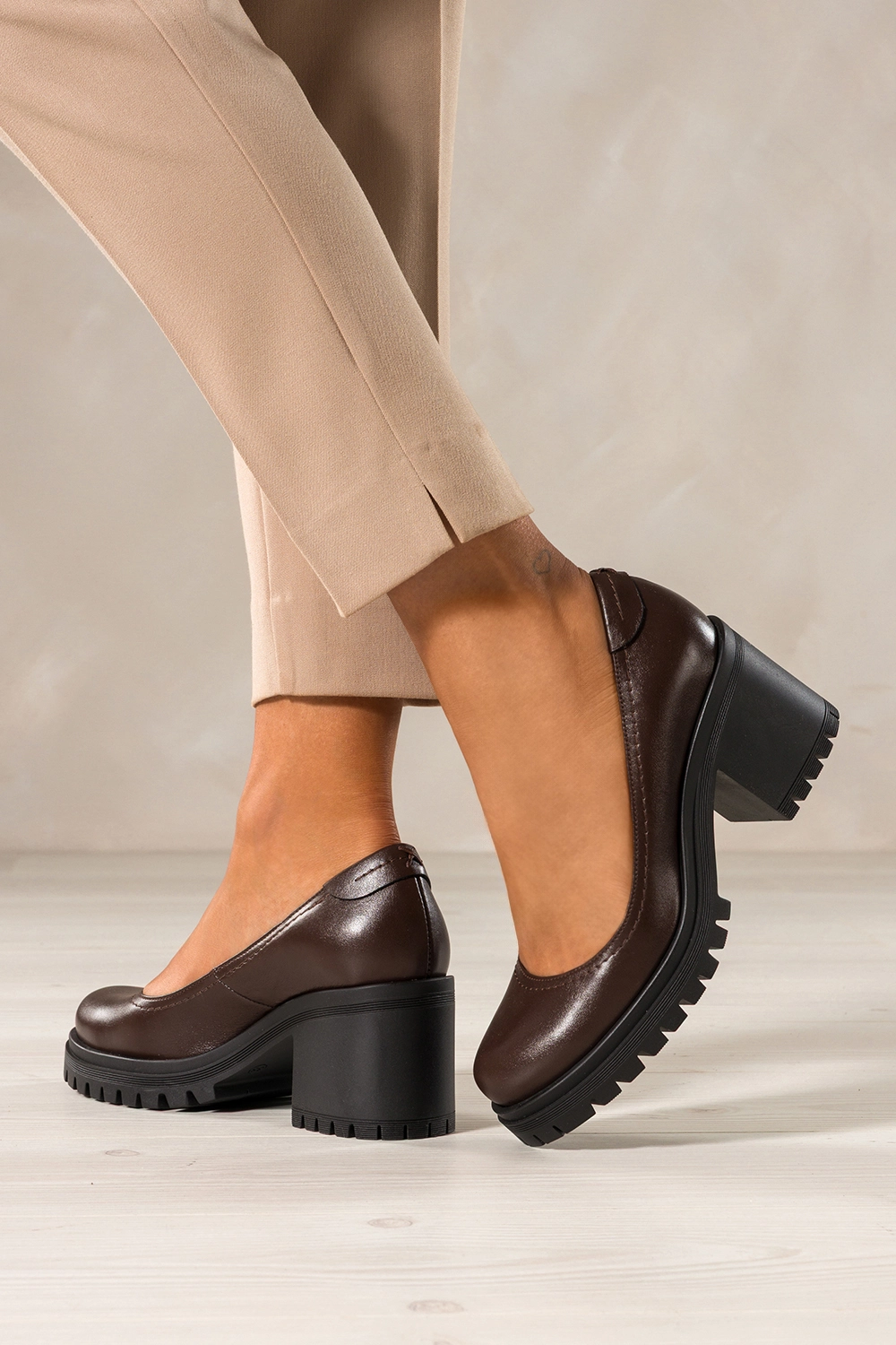 Półbuty doskonale sprawdzą się zarówno w stylizacjach casualowych, jak i bardziej eleganckich. Bieżnikowana platforma oraz szeroki słupek zapewniają nie tylko stabilność i bezpieczeństwo, ale też nadają sylwetce lekkości. Zaokrąglony nosek i głęboki, czekoladowy odcień czynią ten model wyjątkowo łatwym do zestawienia z wieloma kolorami i fakturami. To doskonały wybór na co dzień, do pracy, a także na spotkania towarzyskie.