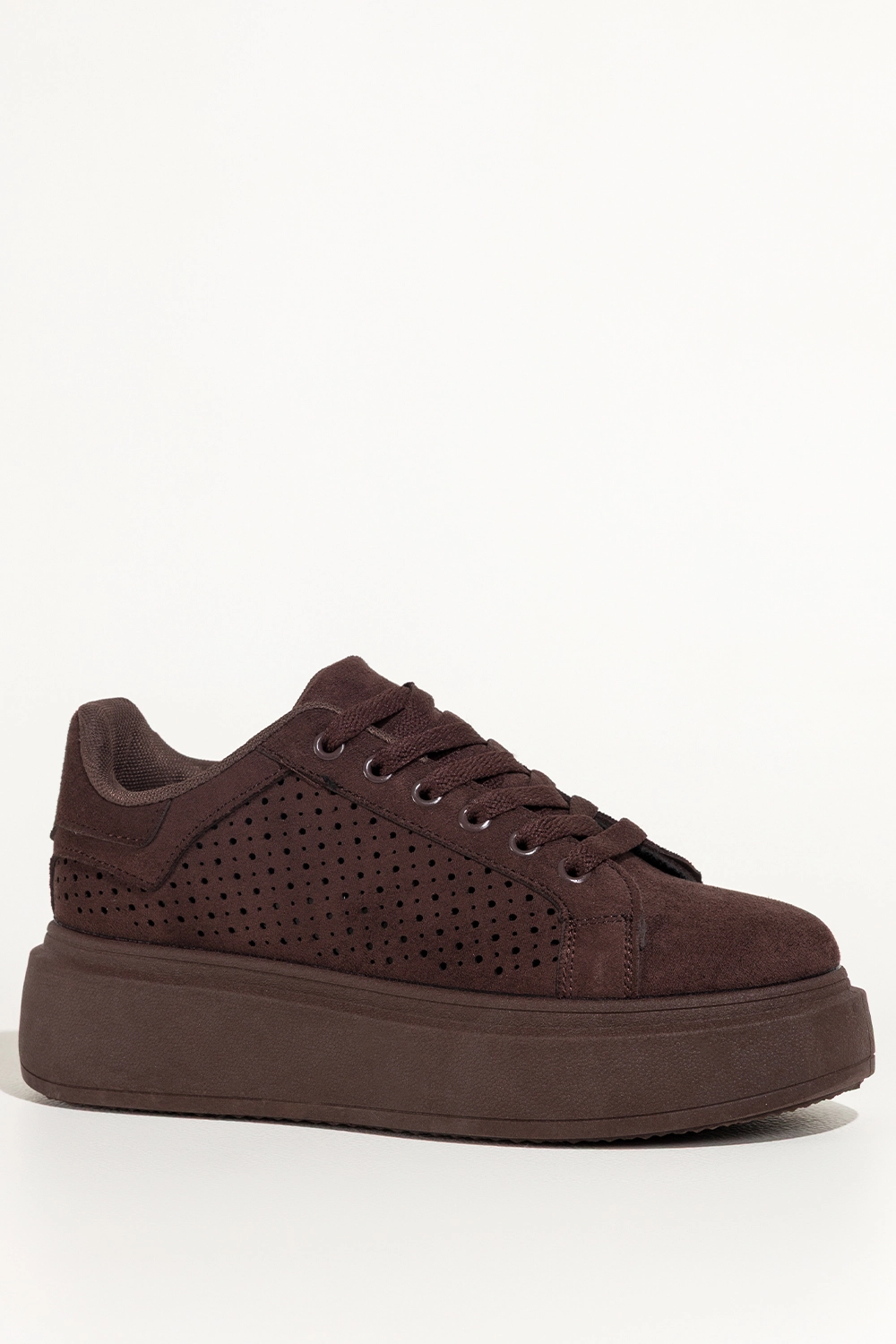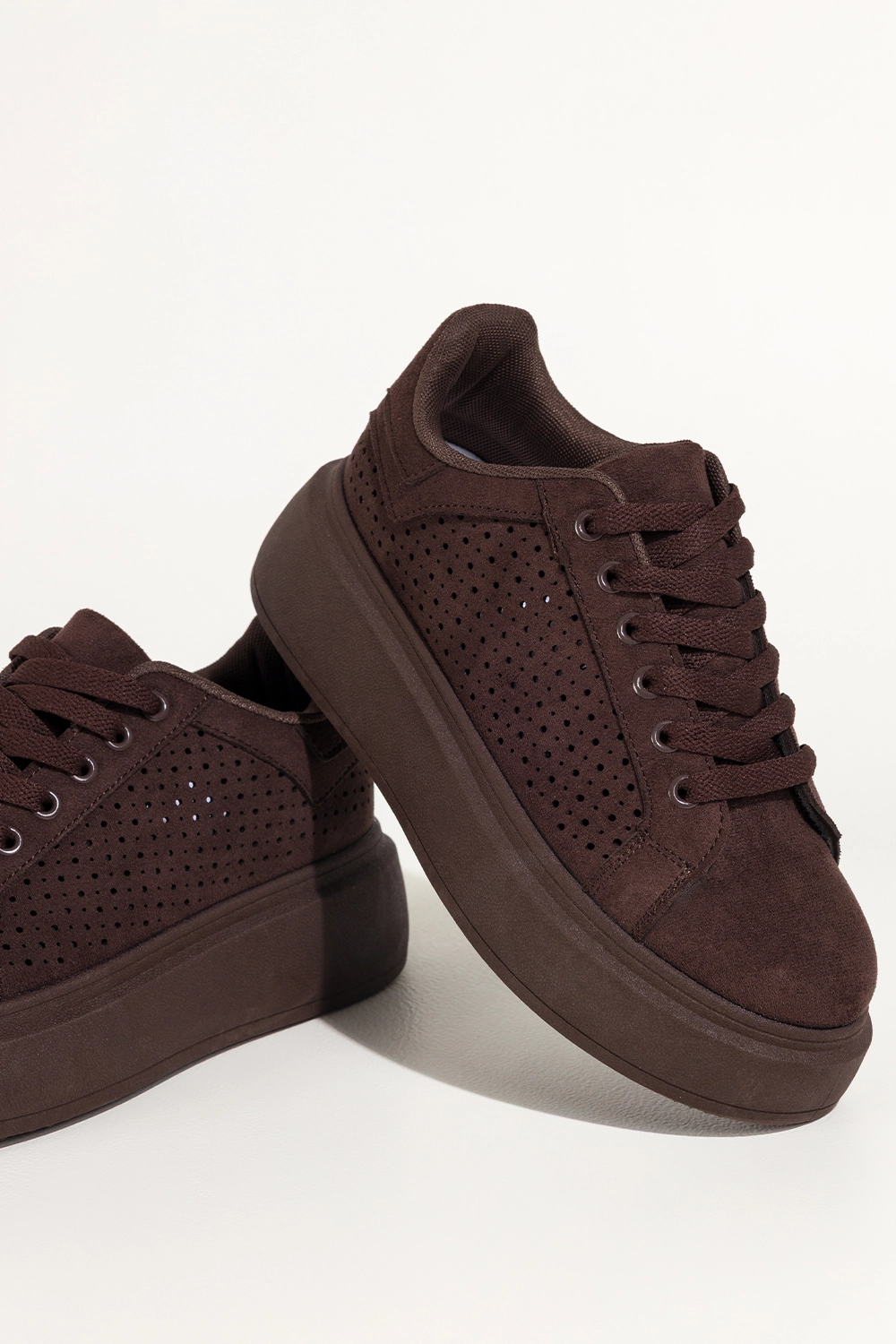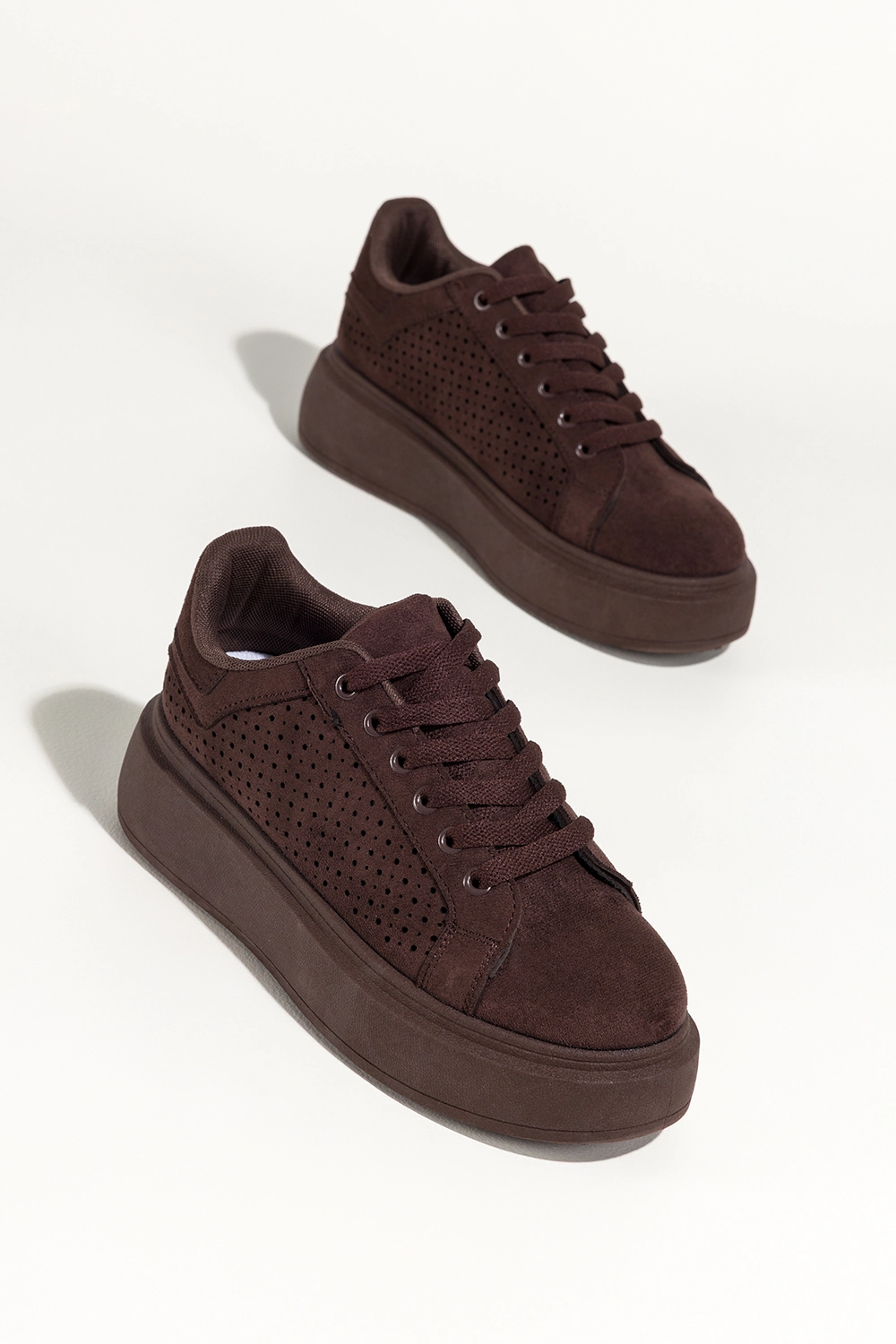 Czekoladowe sneakersy damskie buty sportowe ażurowe na platformie sznurowane Carla YO349K to nowoczesna lekkości w wyrazistym kolorze, który przyciąga spojrzenia subtelną głębią. Ciepły odcień czekolady, ażurowa cholewka i spójna kolorystycznie platforma tworzą harmonijną całość, która podkreśla charakter stylizacji i nadaje jej świeżości. Miękka faktura zamszu ekologicznego dodaje elegancji, a dopracowane detale budują wrażenie jakości już od pierwszego spojrzenia.