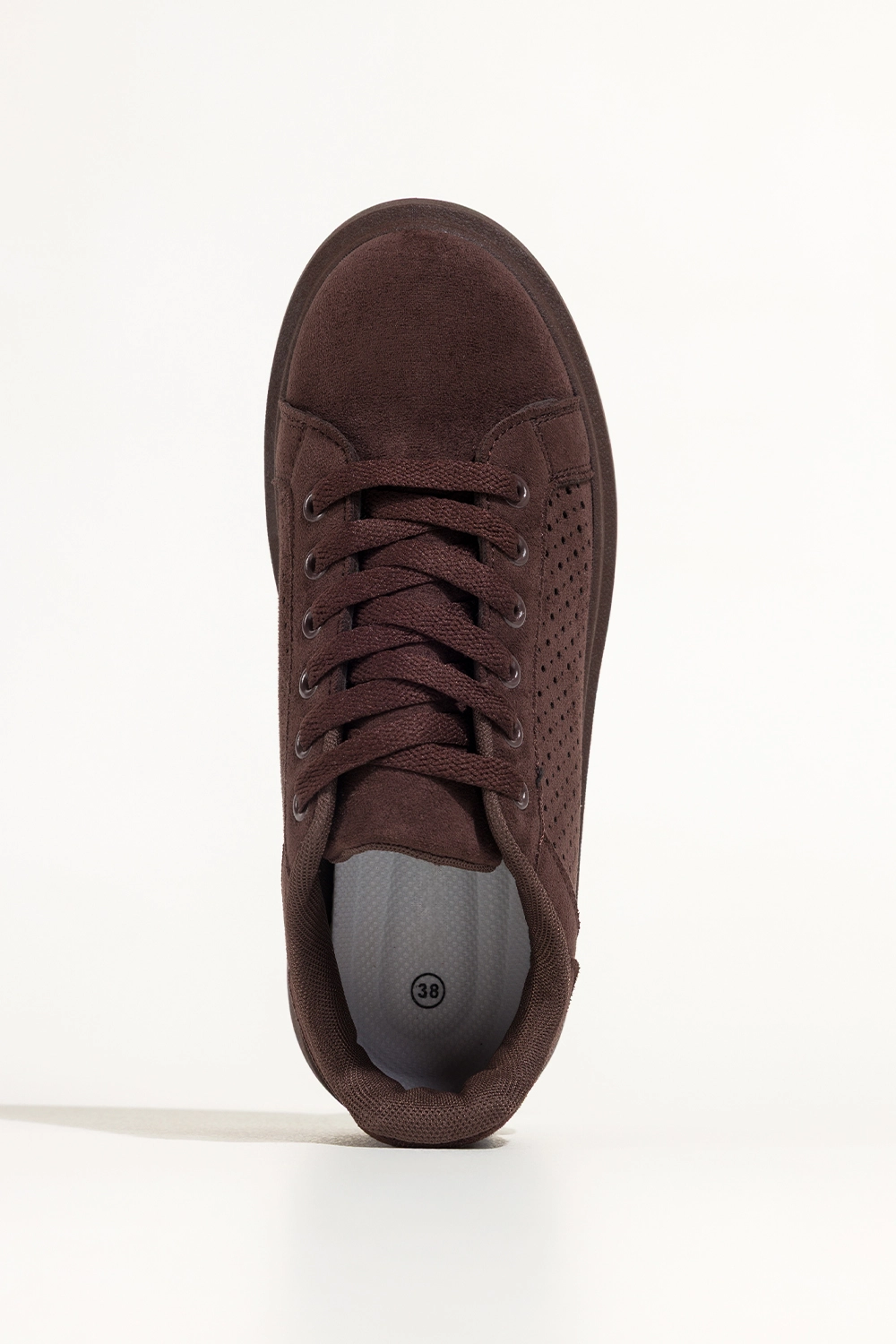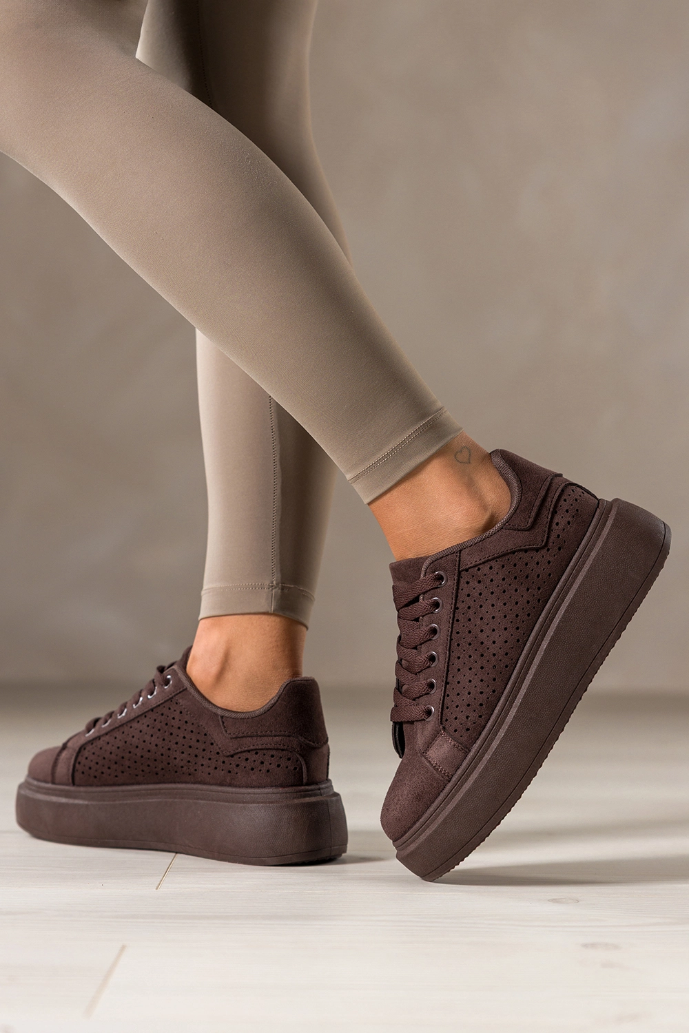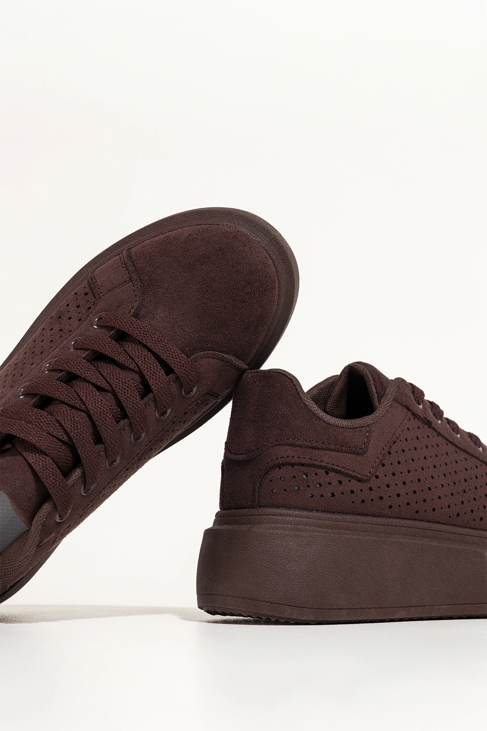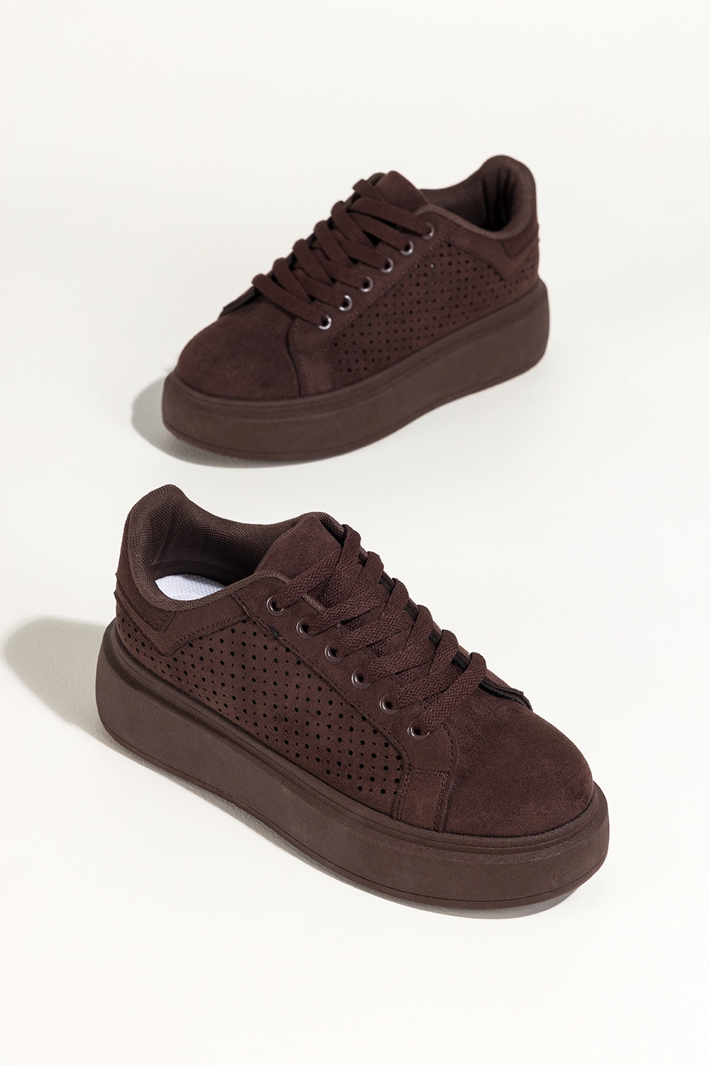 Czekoladowe sneakersy damskie buty sportowe ażurowe na platformie sznurowane Carla YO349K to nowoczesna lekkości w wyrazistym kolorze, który przyciąga spojrzenia subtelną głębią. Ciepły odcień czekolady, ażurowa cholewka i spójna kolorystycznie platforma tworzą harmonijną całość, która podkreśla charakter stylizacji i nadaje jej świeżości. Miękka faktura zamszu ekologicznego dodaje elegancji, a dopracowane detale budują wrażenie jakości już od pierwszego spojrzenia.