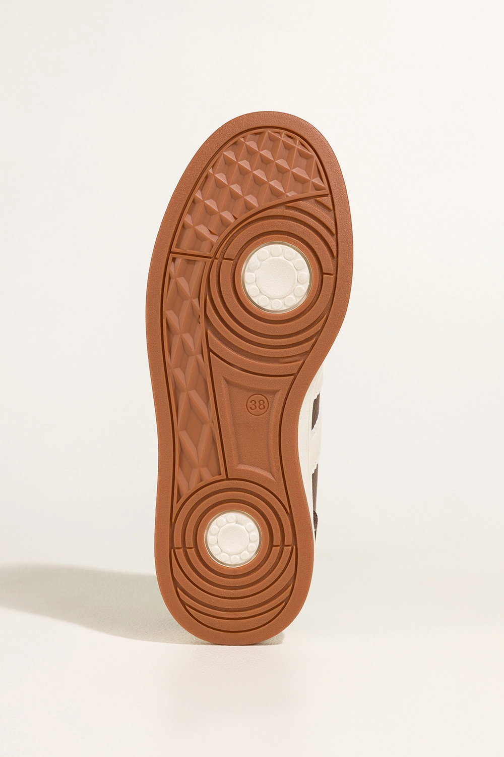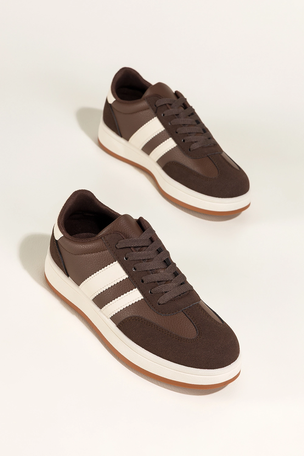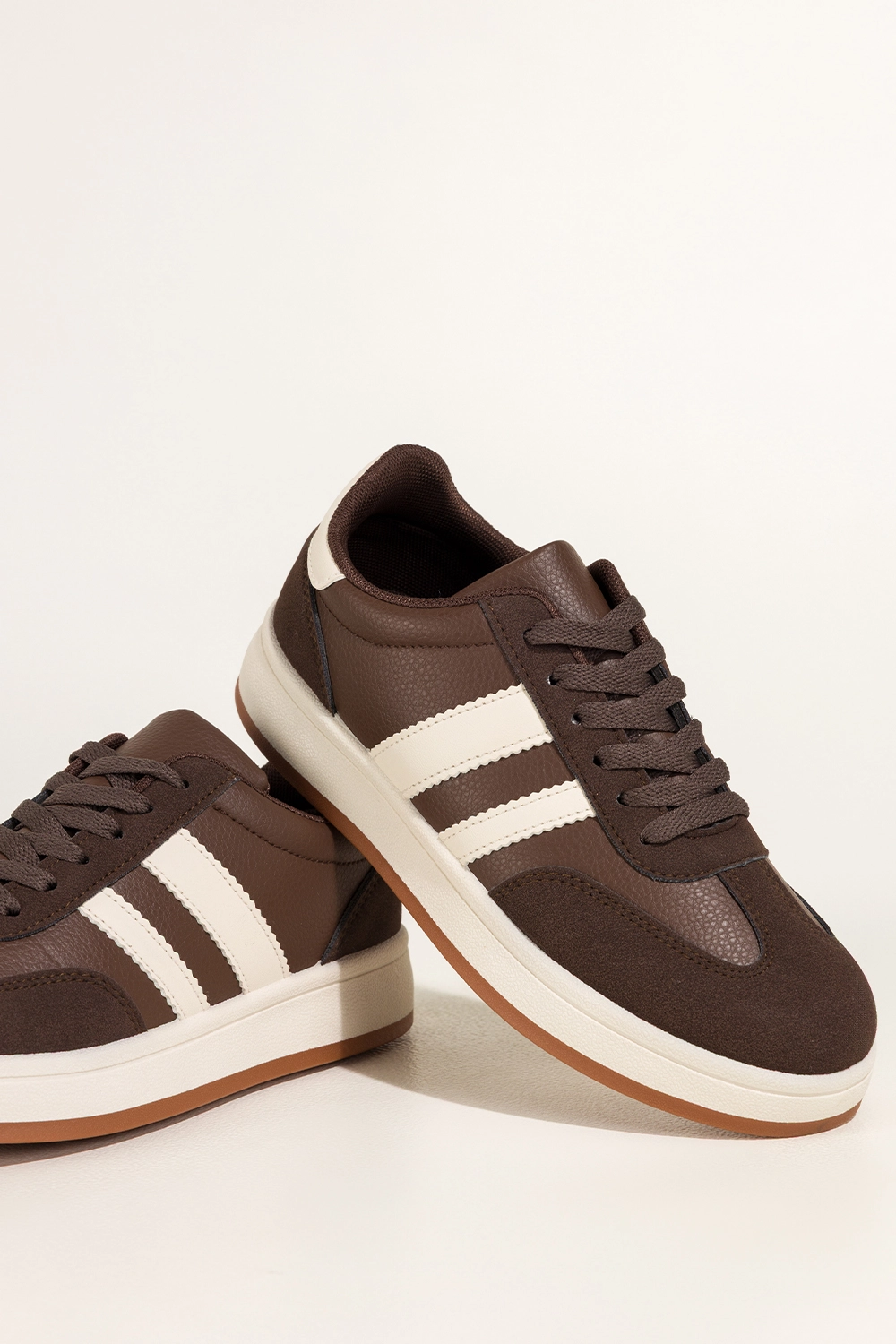 Czekoladowy odcień z kontrastującymi białymi wstawkami i brązowymi sznurówkami sprawia, że sneakersy wyróżniają się na tle klasycznego obuwia sportowego. Biała platforma dodaje im lekkości i nowoczesnego charakteru, świetnie komponując się zarówno z codziennymi jeansami, jak i bardziej eleganckimi stylizacjami. To obuwie, które łączy sportowy luz z miejską elegancją, doskonale sprawdzając się w każdej sytuacji.