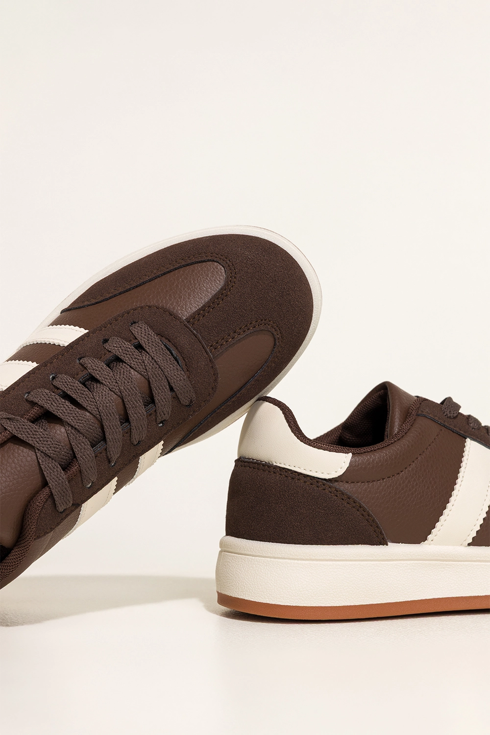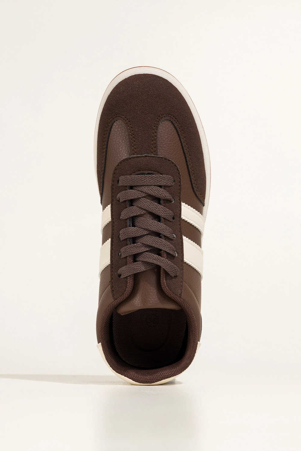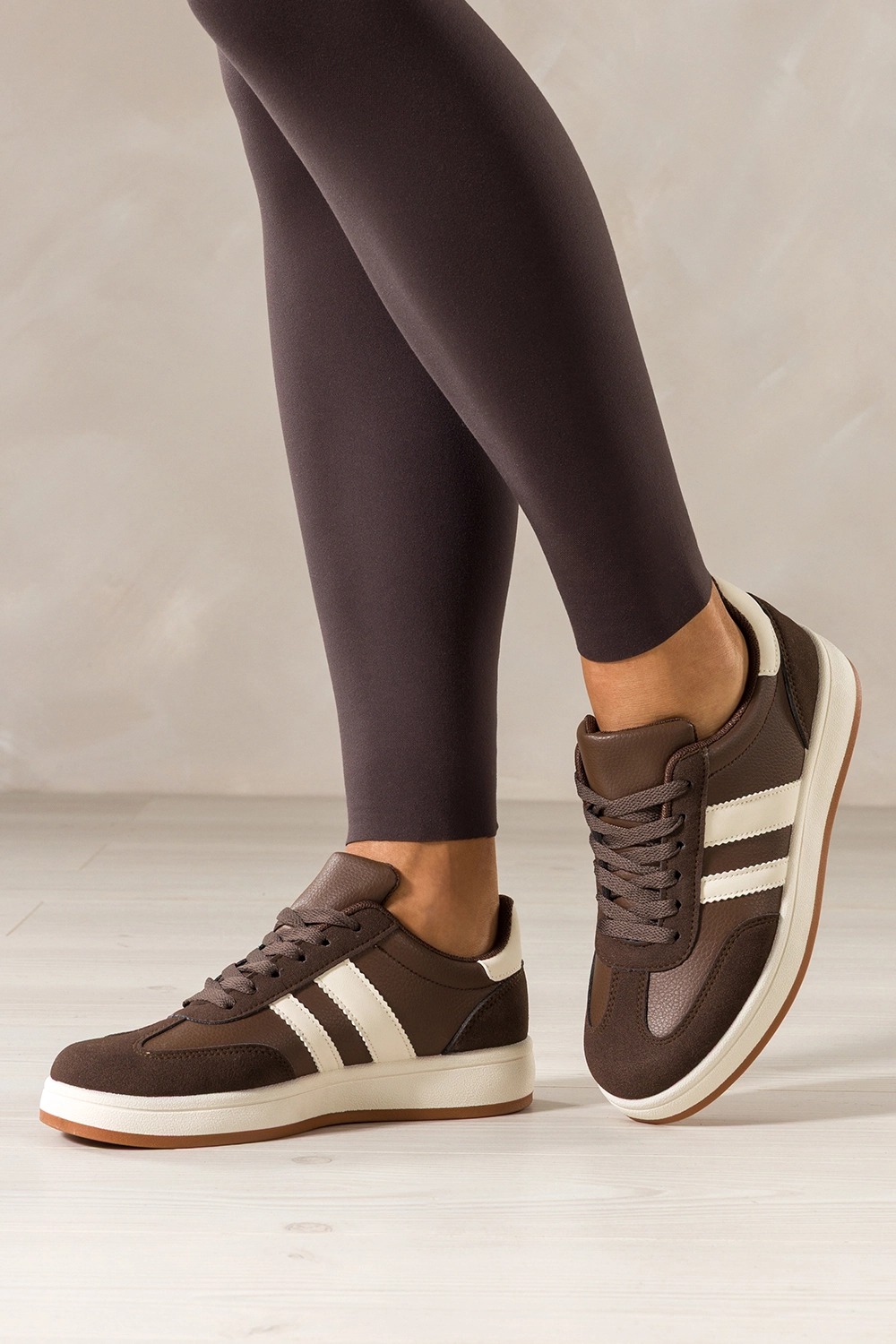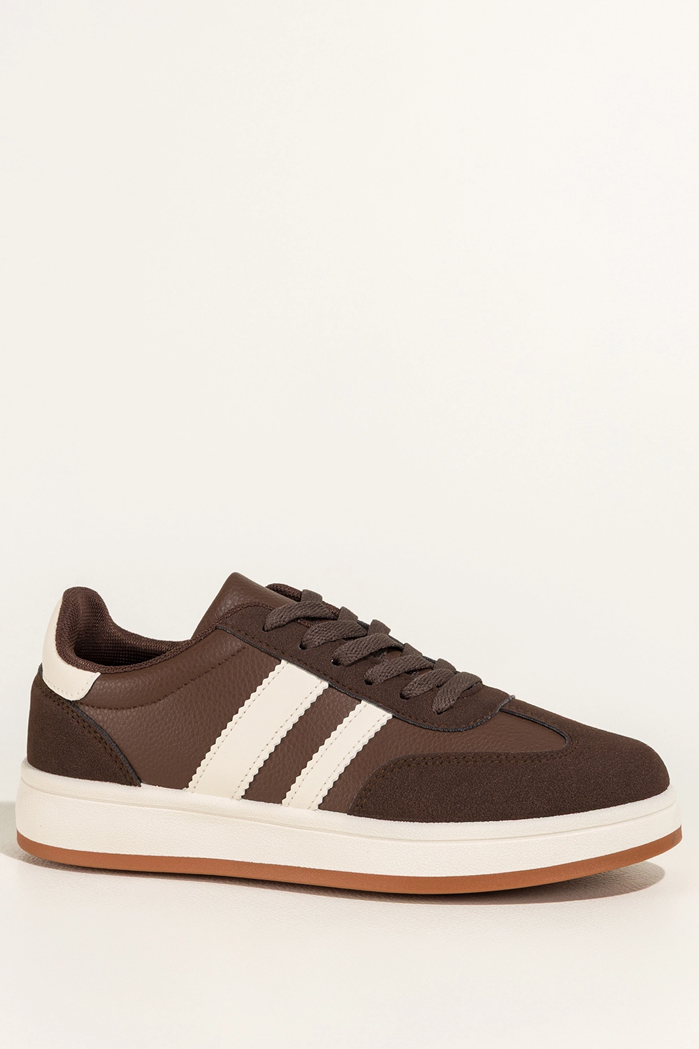 Czekoladowy odcień z kontrastującymi białymi wstawkami i brązowymi sznurówkami sprawia, że sneakersy wyróżniają się na tle klasycznego obuwia sportowego. Biała platforma dodaje im lekkości i nowoczesnego charakteru, świetnie komponując się zarówno z codziennymi jeansami, jak i bardziej eleganckimi stylizacjami. To obuwie, które łączy sportowy luz z miejską elegancją, doskonale sprawdzając się w każdej sytuacji.