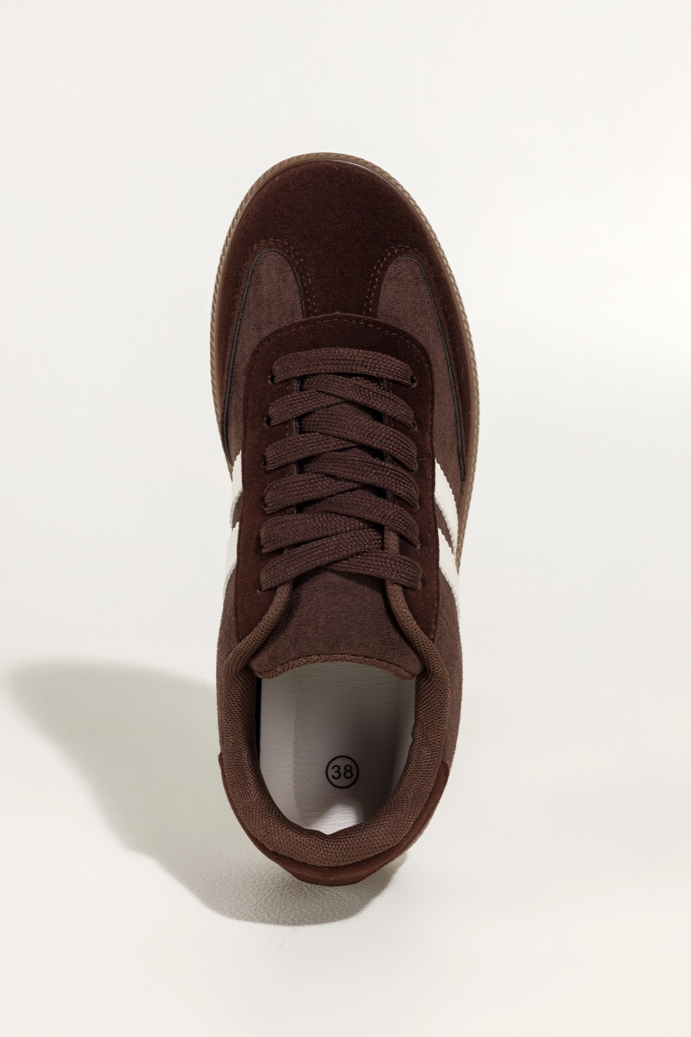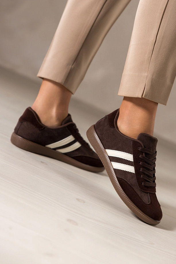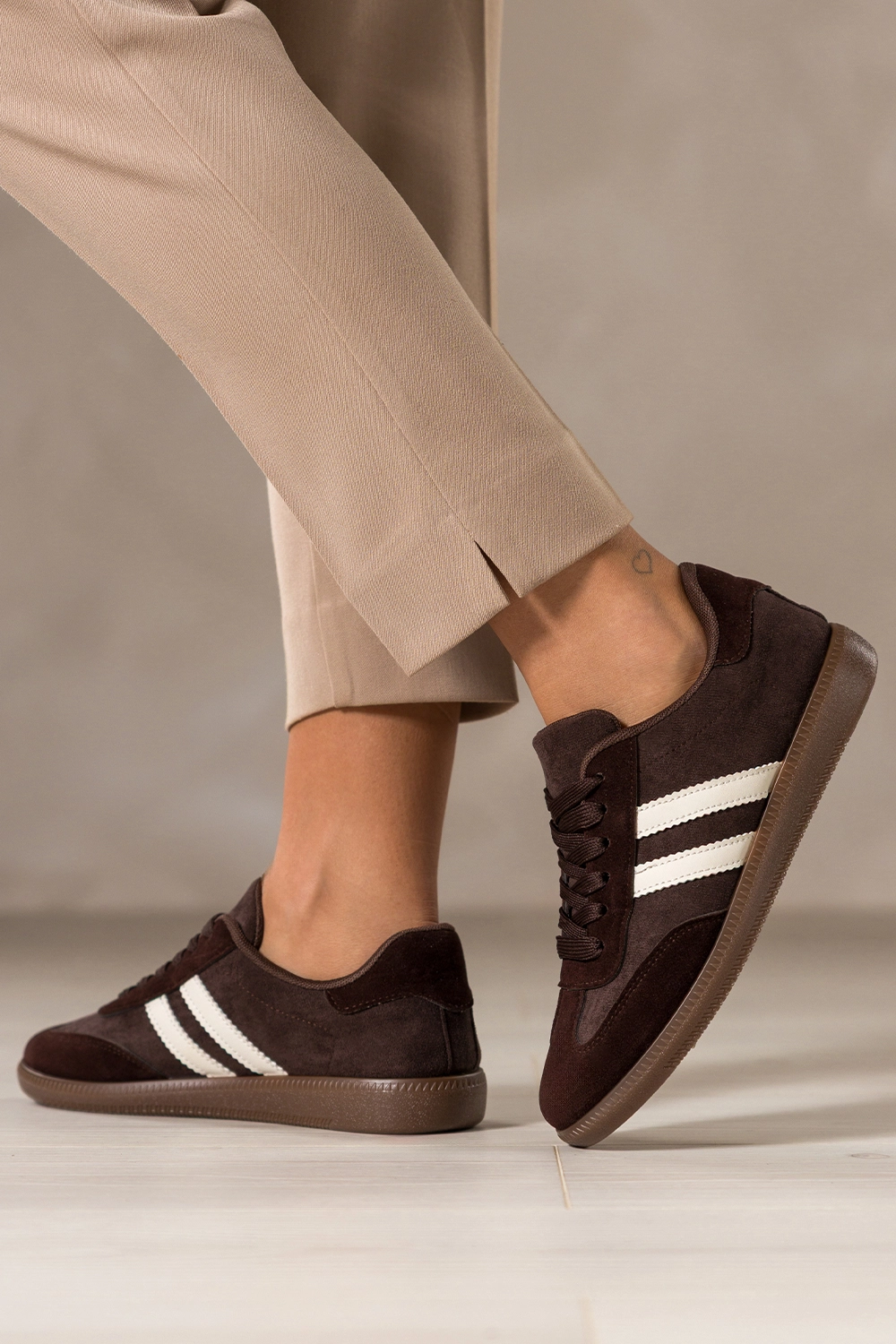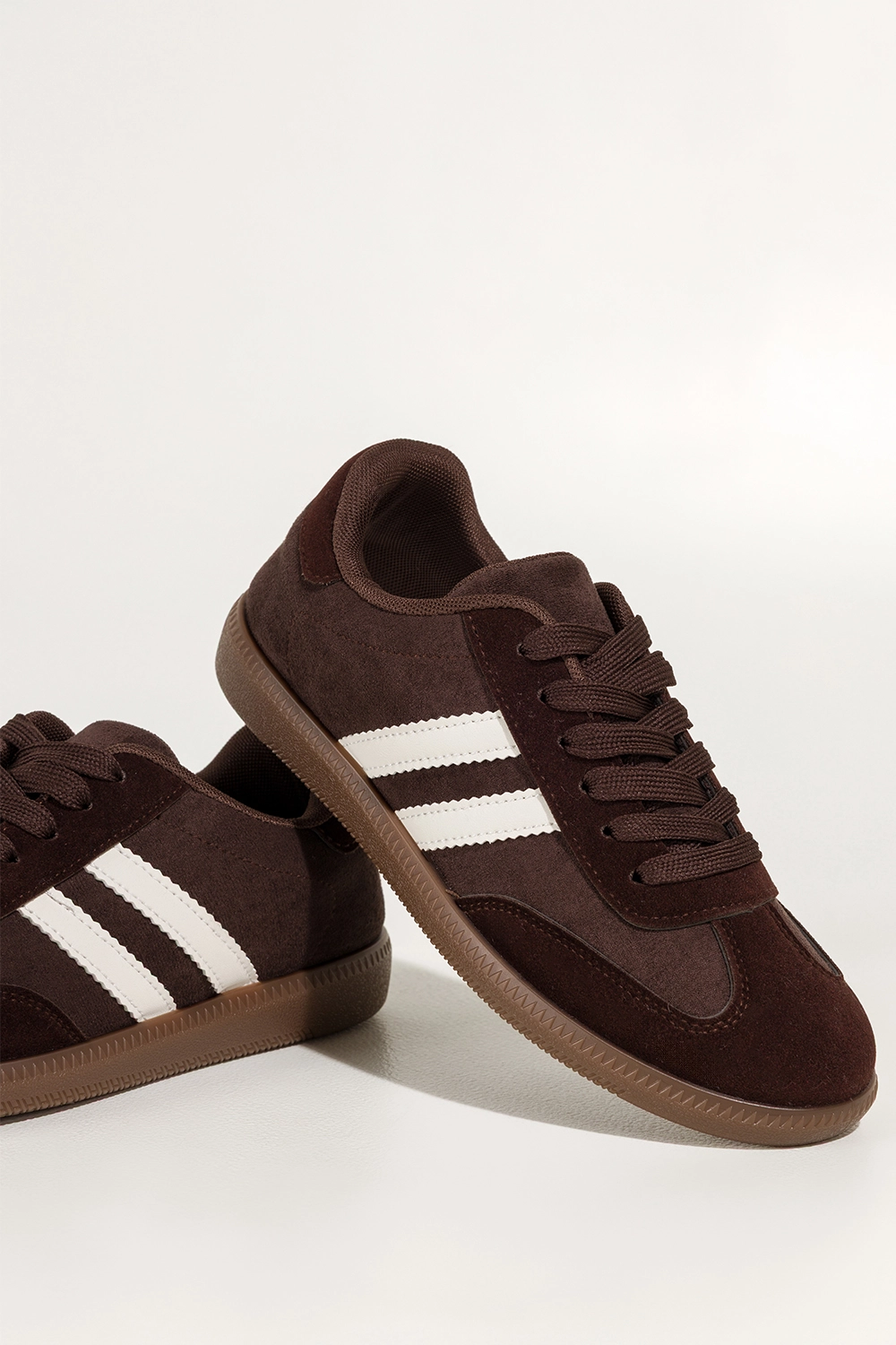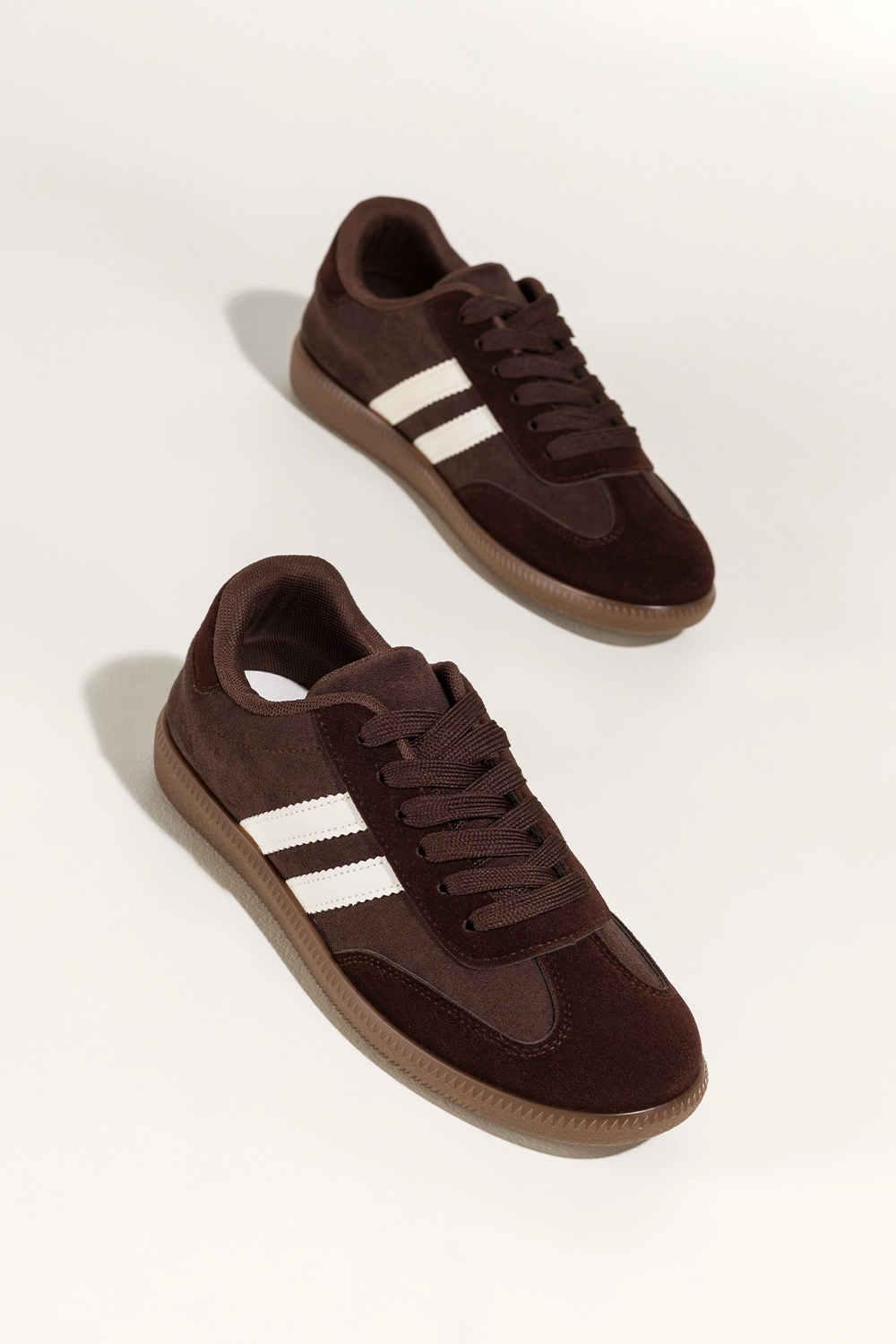 Ich czekoladowy odcień harmonijnie współgra z jasnobeżowymi wstawkami na cholewce, tworząc ponadczasową, a zarazem nowoczesną kompozycję kolorystyczną. Zaokrąglony nosek i dopracowane wykończenia podkreślają modowy charakter obuwia, które doskonale komponuje się zarówno z dżinsami, jak i zwiewnymi sukienkami. To idealny wybór do stylizacji miejskich, casualowych i sportowych.