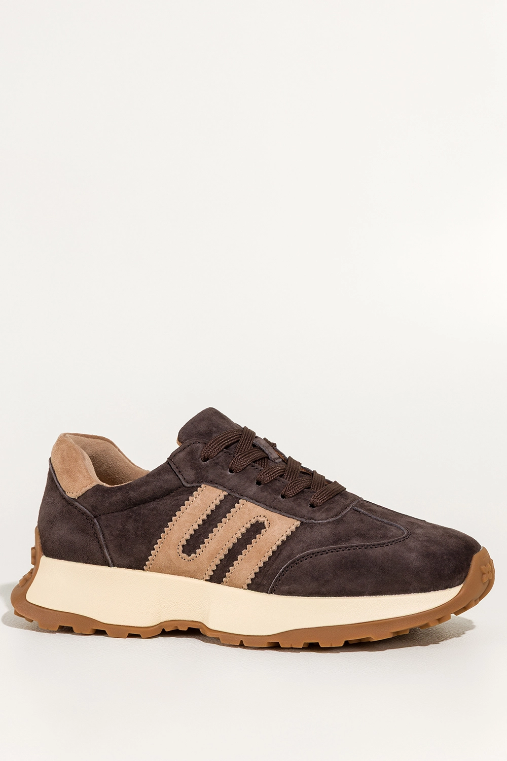Czekoladowe sneakersy skórzane damskie buty sportowe na bieżnikowanej kremowej platformie beżowe wstawki sznurowane Carla model TW-OC8921. Wykonane z wyselekcjonowanej skóry nubukowej, gwarantują trwałość oraz perfekcyjne dopasowanie do kształtu stopy. Miękka, skórzana wkładka zapewnia komfort nawet przy wielogodzinnym użytkowaniu, a solidna, bieżnikowana kremowa platforma amortyzuje każdy krok, dodając stabilności. Sznurowane wykończenie pozwala na idealne dopasowanie, a precyzyjnie wyprofilowany zaokrąglony nosek nie tylko podnosi wygodę, ale również elegancko wydłuża sylwetkę.