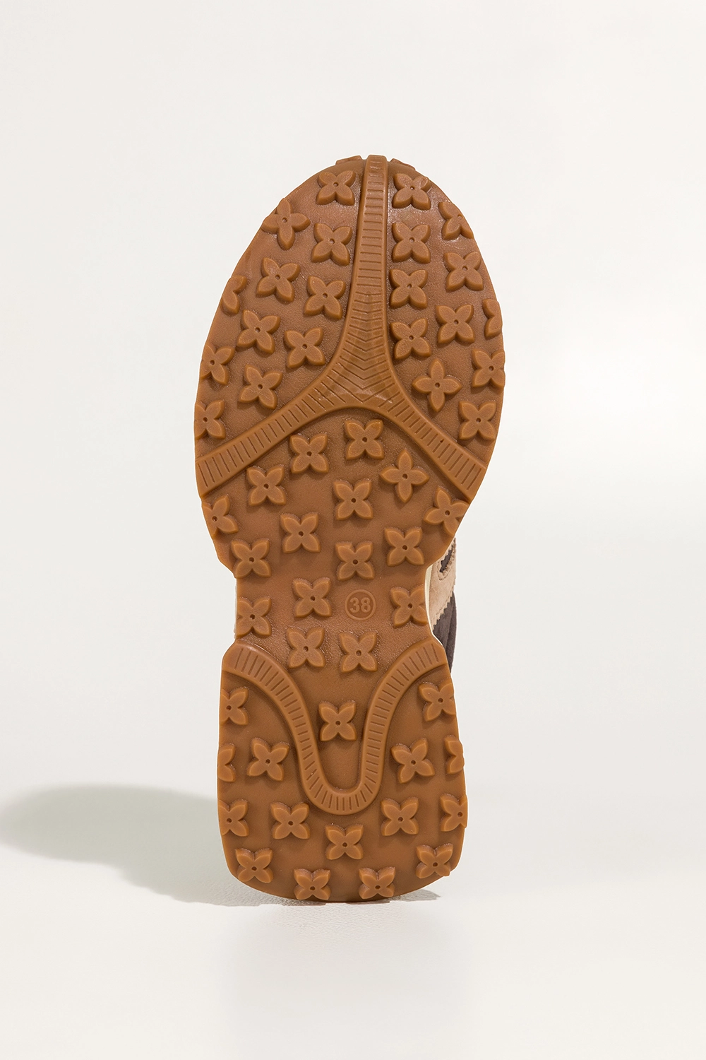 Kremowa platforma zapewnia świetną przyczepność nawet na śliskim podłożu, co czyni je doskonałym wyborem przez większą część roku. Czekoladowe sznurówki dodają subtelnego akcentu, podkreślając unikalność designu. Te damskie sneakersy będą Twoim niezastąpionym towarzyszem każdego dnia, niezależnie od stylizacji czy pory roku.