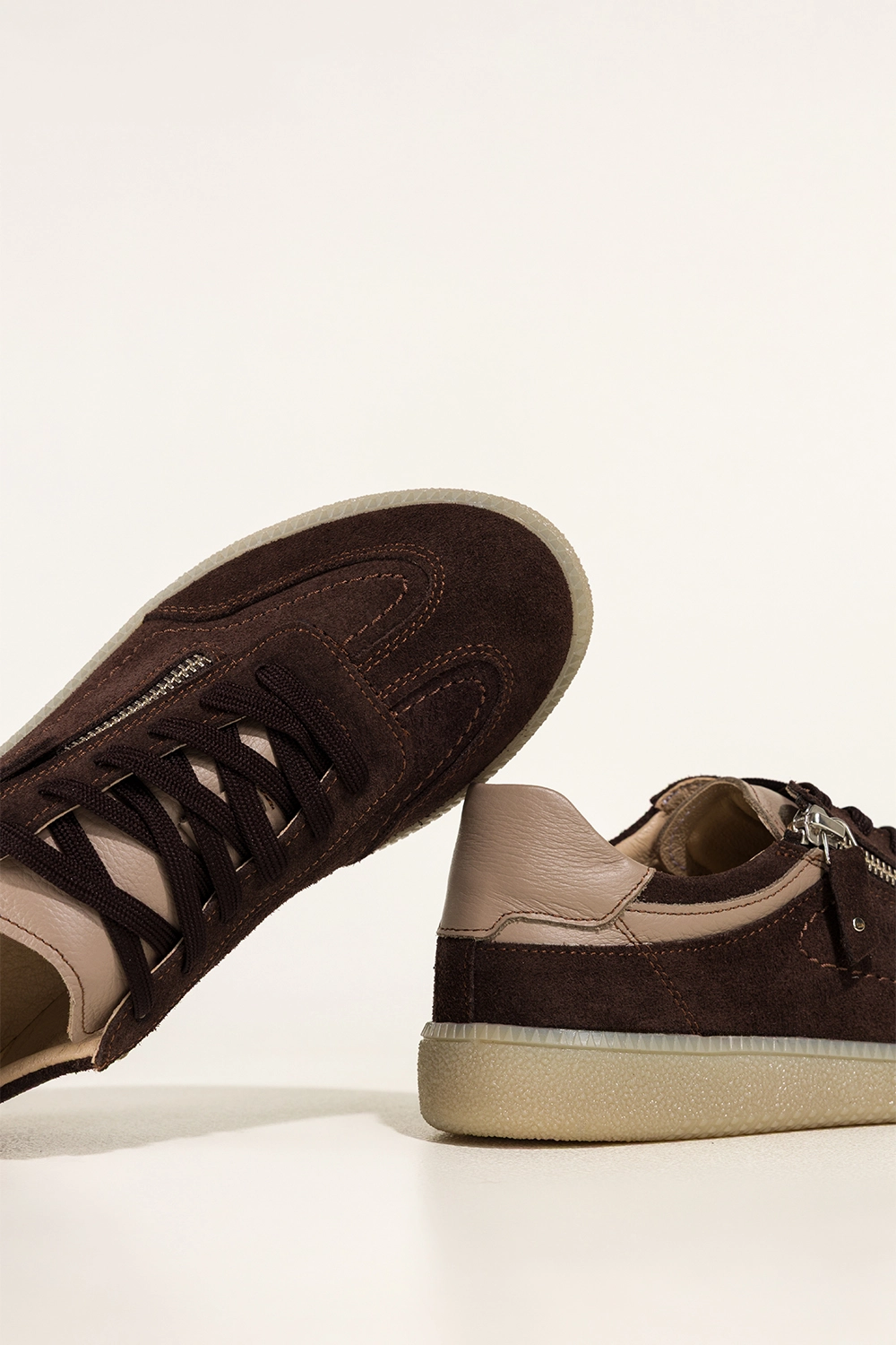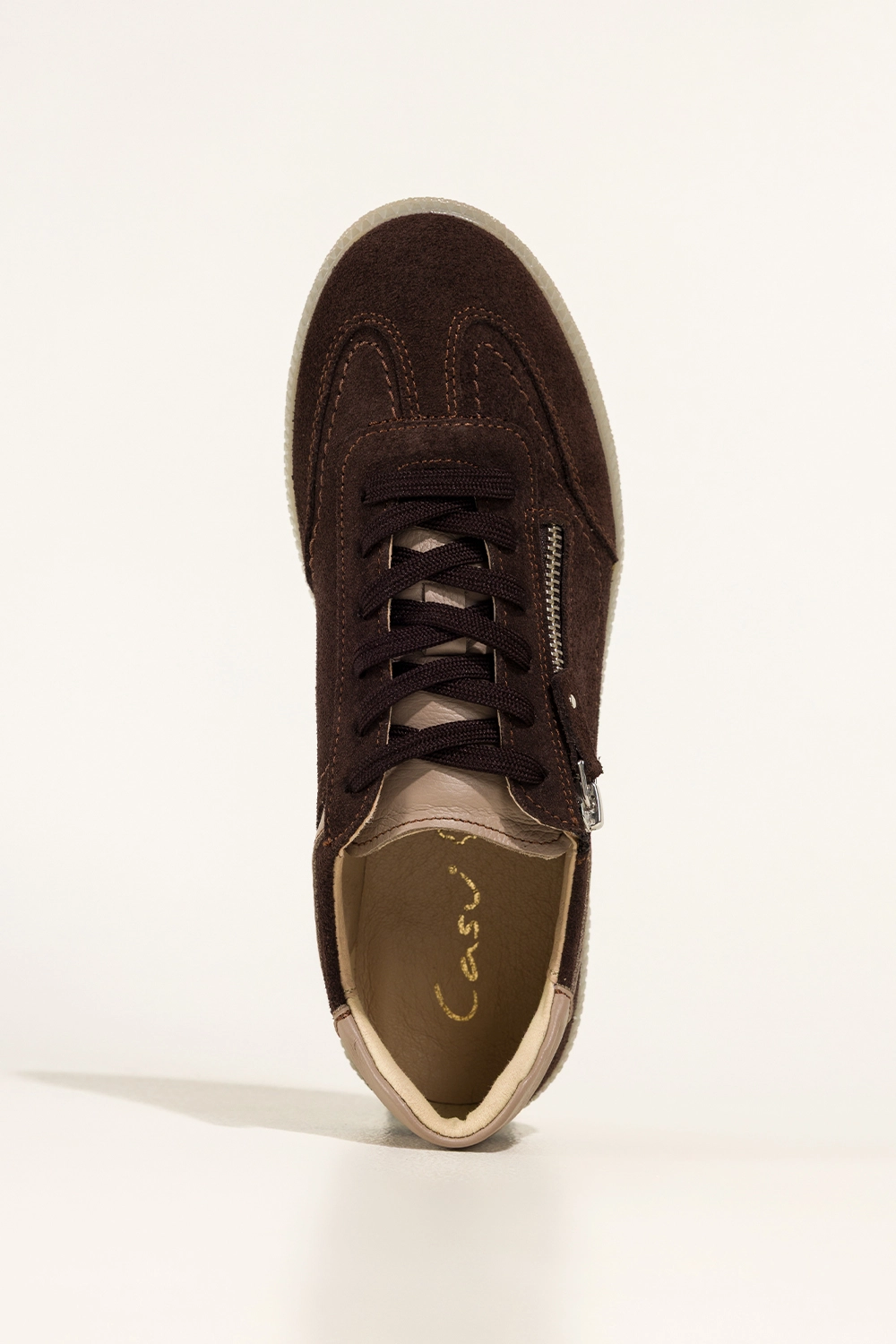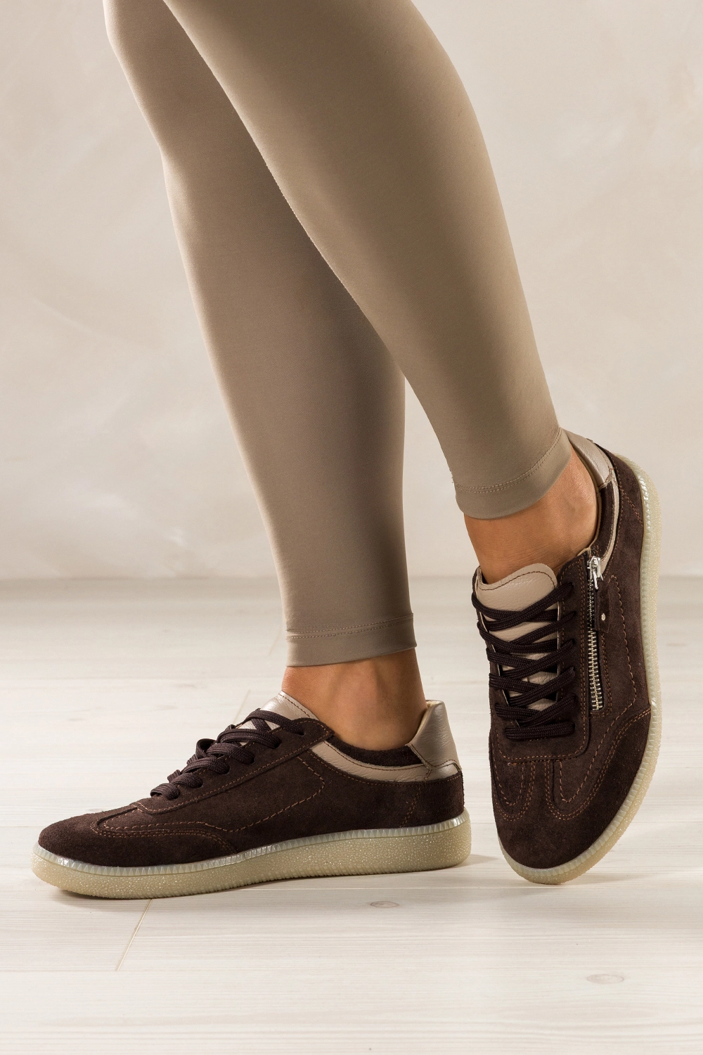Czekoladowe sneakersy skórzane damskie buty sportowe na elastycznej podeszwie beżowe wstawki zamek w cholewce sznurowane PRODUKT POLSKI Casu model M8716. Wykonane z luksusowej, miękkiej skóry zamszowej o głębokim, ciepłym odcieniu brązu, zapewniają komfort na najwyższym poziomie. Naturalna skórzana wkładka oraz elastyczna, jasna podeszwa gwarantują wygodę podczas codziennego noszenia, a starannie dopracowane detale, takie jak zamek w cholewce i beżowe wstawki ze skóry naturalnej, dodają im elegancji i klasy.