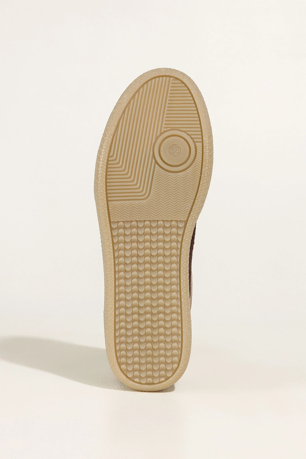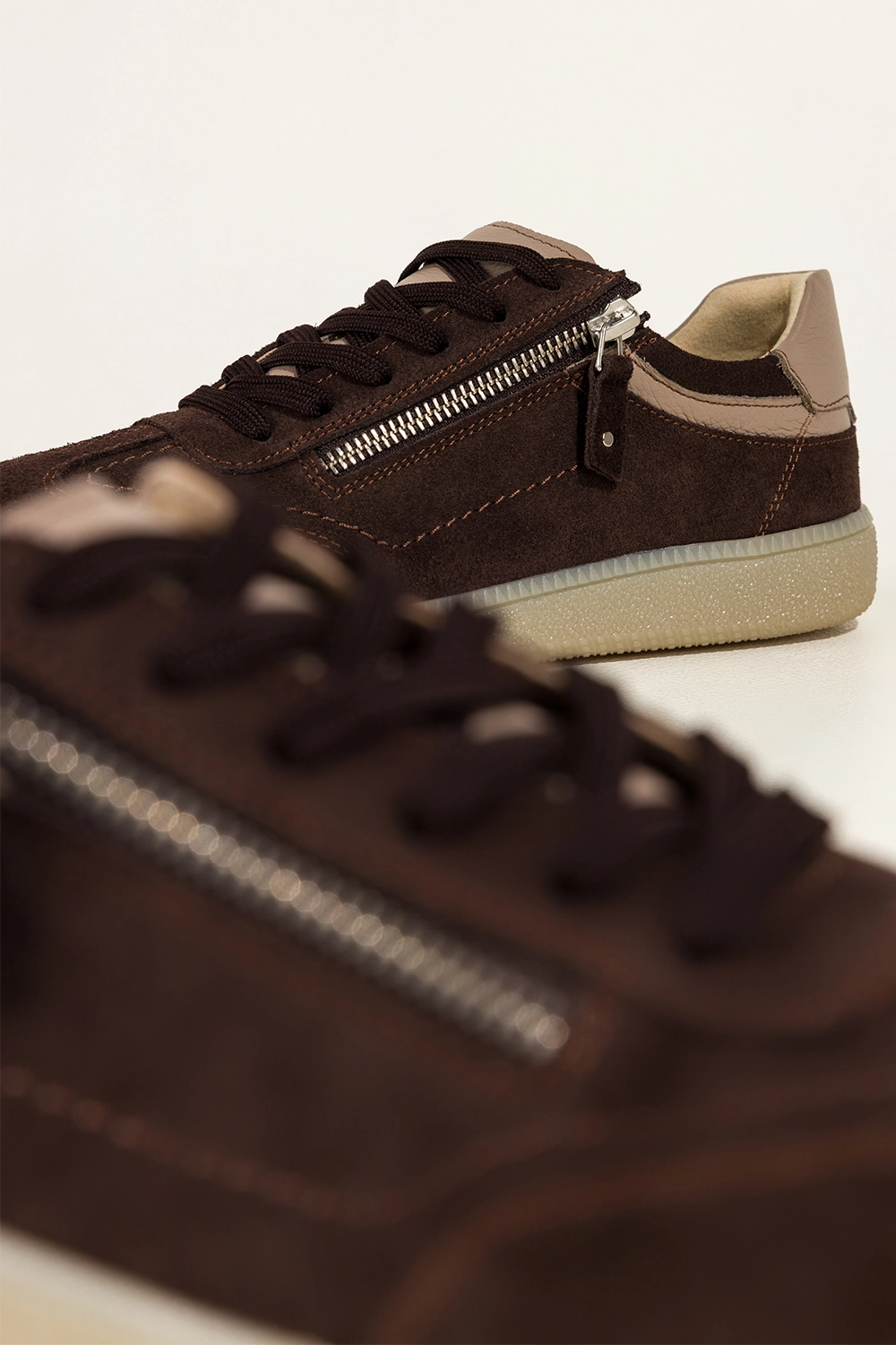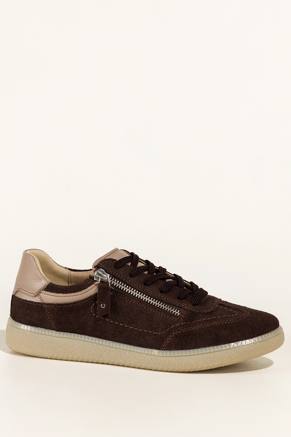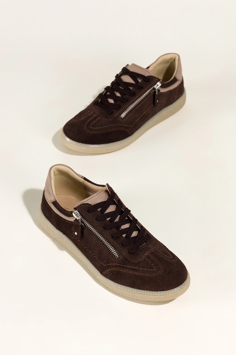 Czekoladowe sneakersy skórzane damskie buty sportowe na elastycznej podeszwie beżowe wstawki zamek w cholewce sznurowane PRODUKT POLSKI Casu model M8716. Wykonane z luksusowej, miękkiej skóry zamszowej o głębokim, ciepłym odcieniu brązu, zapewniają komfort na najwyższym poziomie. Naturalna skórzana wkładka oraz elastyczna, jasna podeszwa gwarantują wygodę podczas codziennego noszenia, a starannie dopracowane detale, takie jak zamek w cholewce i beżowe wstawki ze skóry naturalnej, dodają im elegancji i klasy.