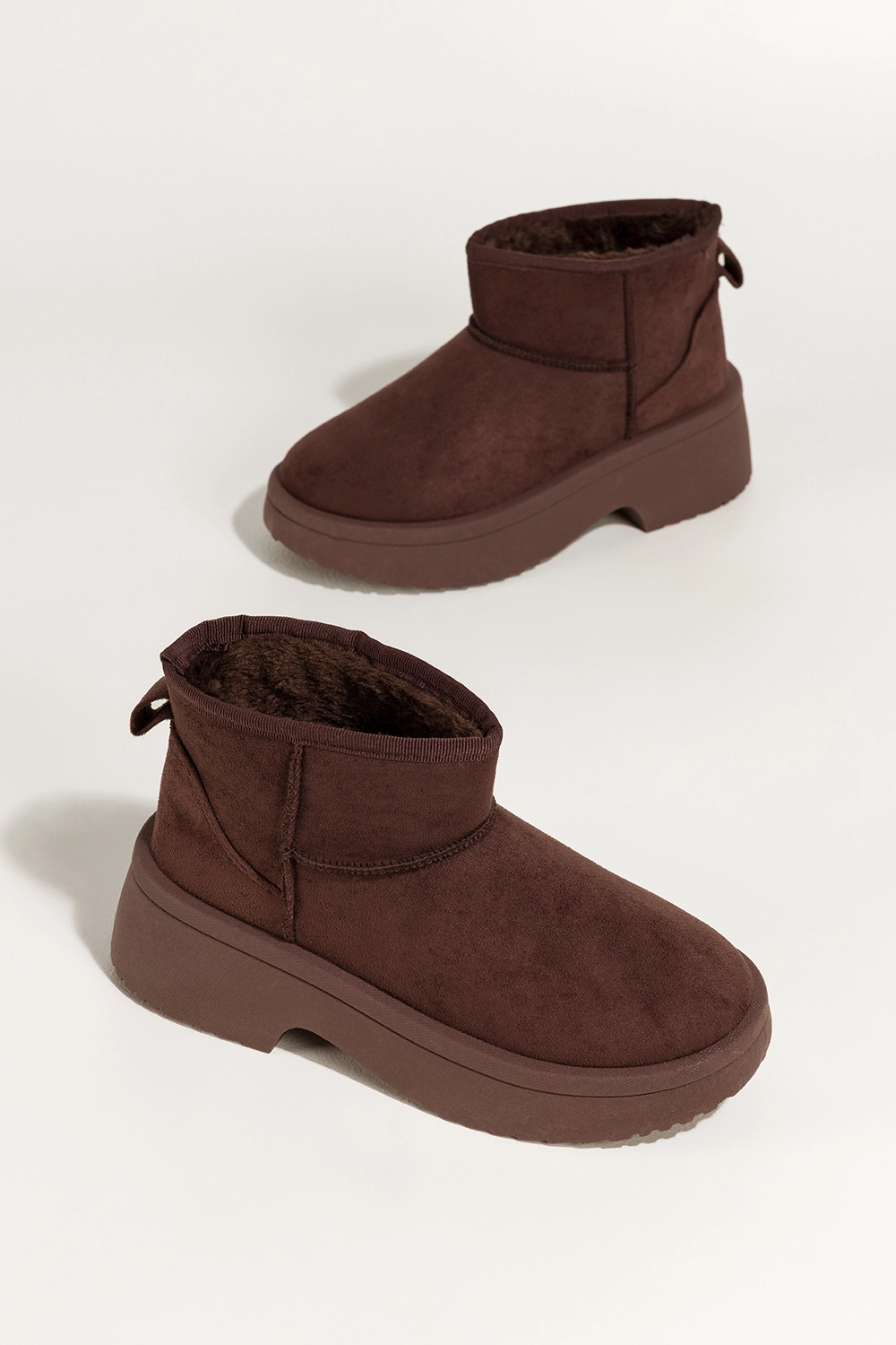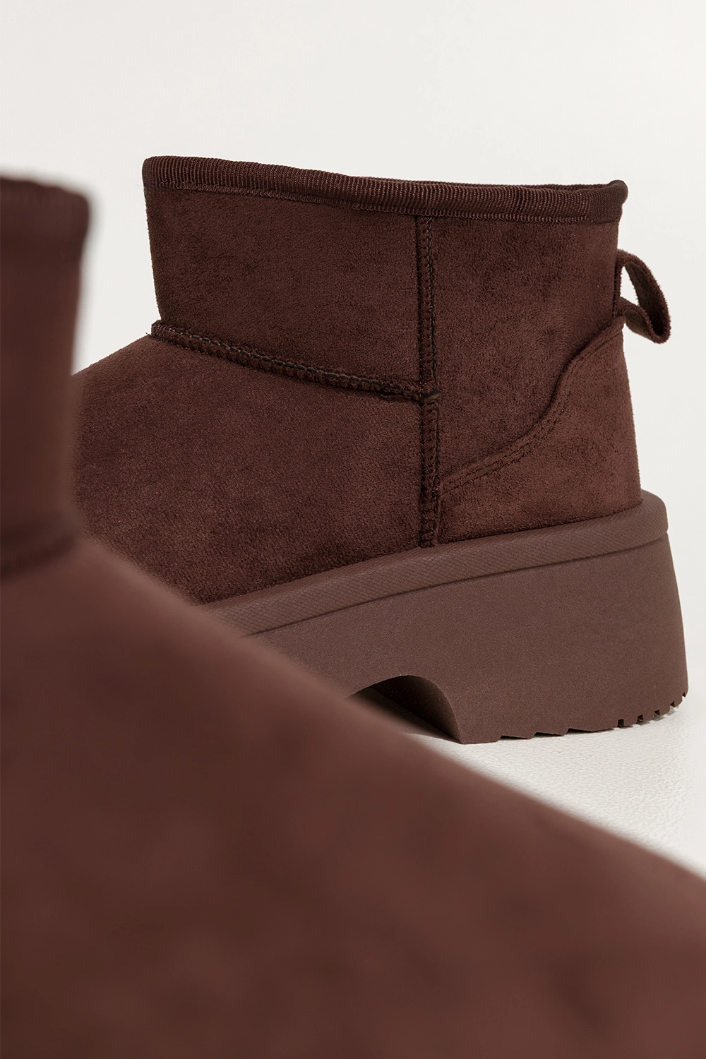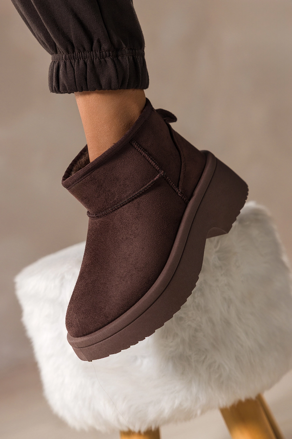 Czekoladowe śniegowce mukluki damskie na bieżnikowanej platformie Casu YP11-86. Wykonane z miękkiej, wysokogatunkowej zamszowej skóry ekologicznej, zapewniają trwałość i estetykę na lata. Wnętrze wyściełane jest gęstym, puszystym futerkiem, które gwarantuje ciepło nawet podczas najchłodniejszych dni. Wsuwany fason i szerokie wykończenie cholewki sprawiają, że buty idealnie dopasowują się do stopy, zapewniając komfort noszenia przez cały dzień.