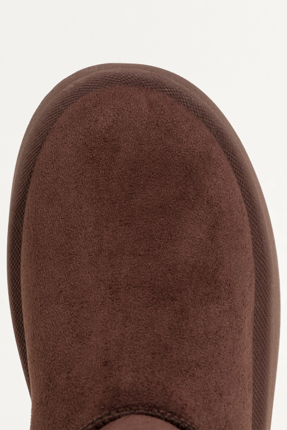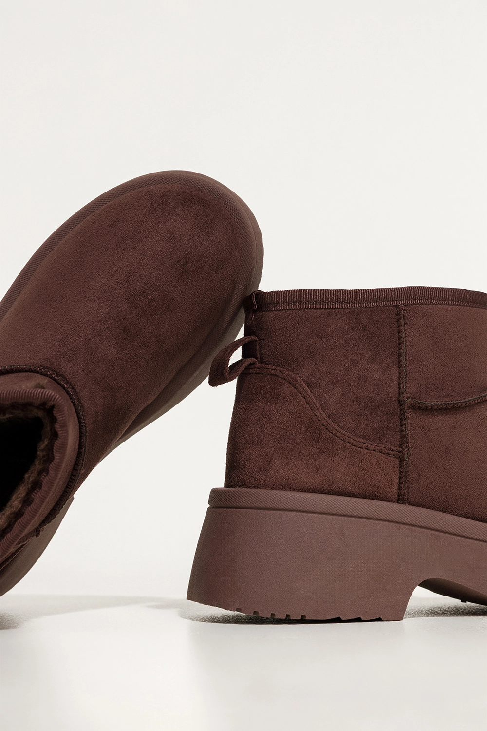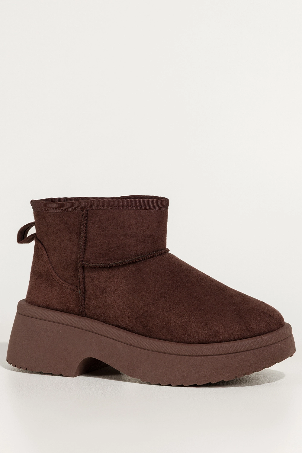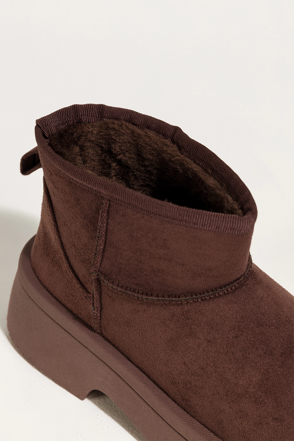 Czekoladowe śniegowce mukluki damskie na bieżnikowanej platformie Casu YP11-86. Wykonane z miękkiej, wysokogatunkowej zamszowej skóry ekologicznej, zapewniają trwałość i estetykę na lata. Wnętrze wyściełane jest gęstym, puszystym futerkiem, które gwarantuje ciepło nawet podczas najchłodniejszych dni. Wsuwany fason i szerokie wykończenie cholewki sprawiają, że buty idealnie dopasowują się do stopy, zapewniając komfort noszenia przez cały dzień.