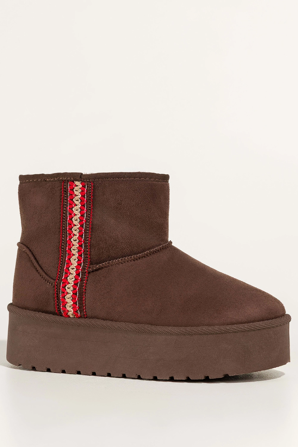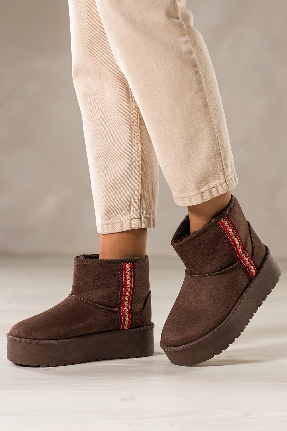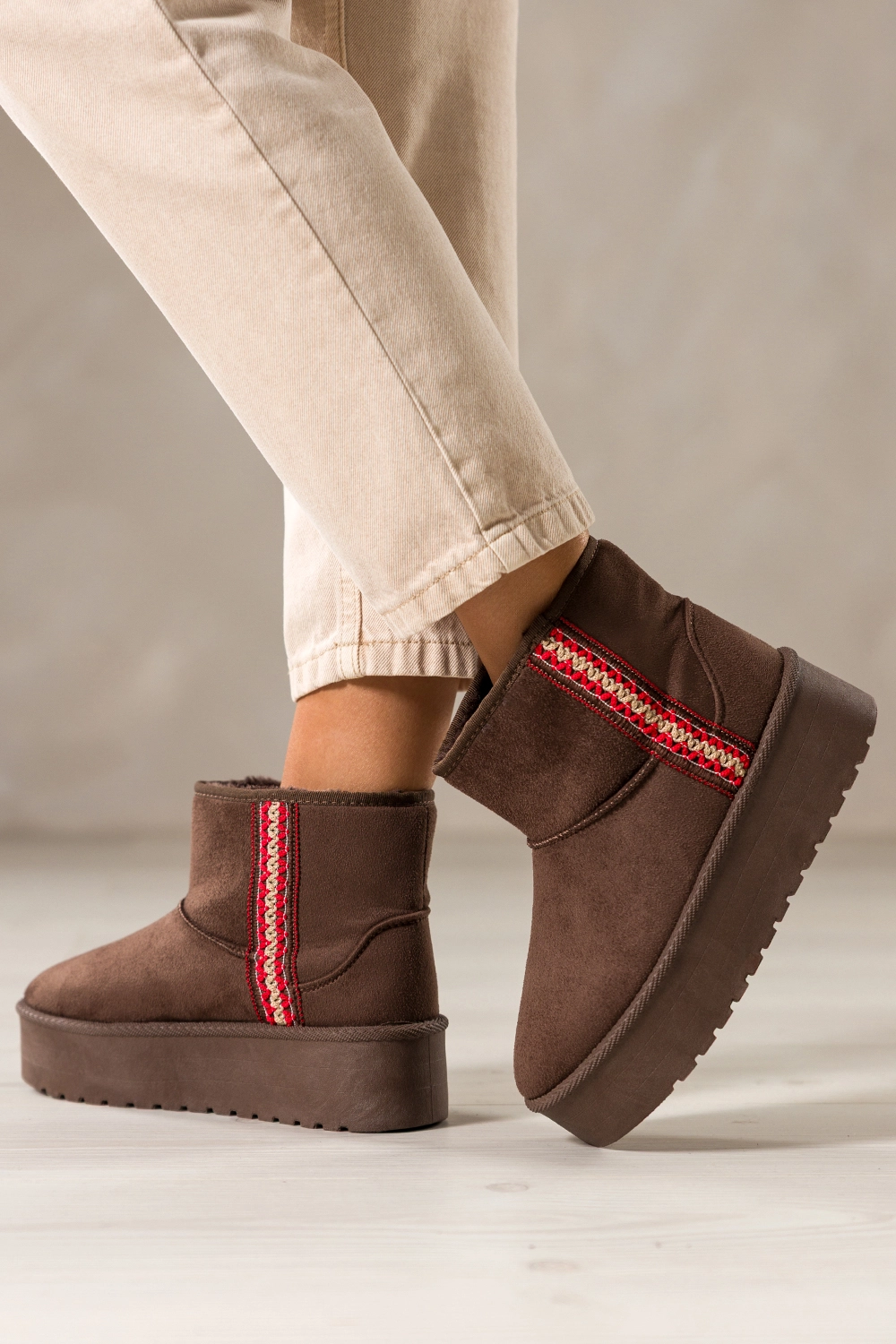Czekoladowe śniegowce mukluki damskie na bieżnikowanej platformie z wzorzystą wstawką Casu XU-19