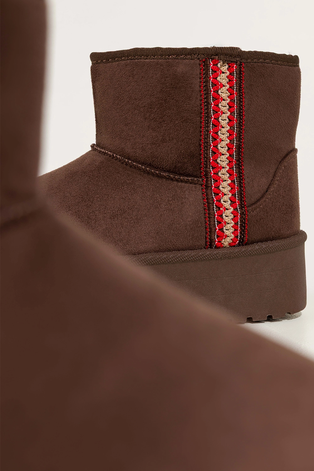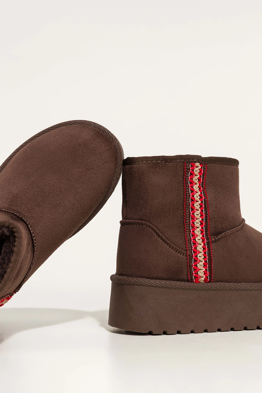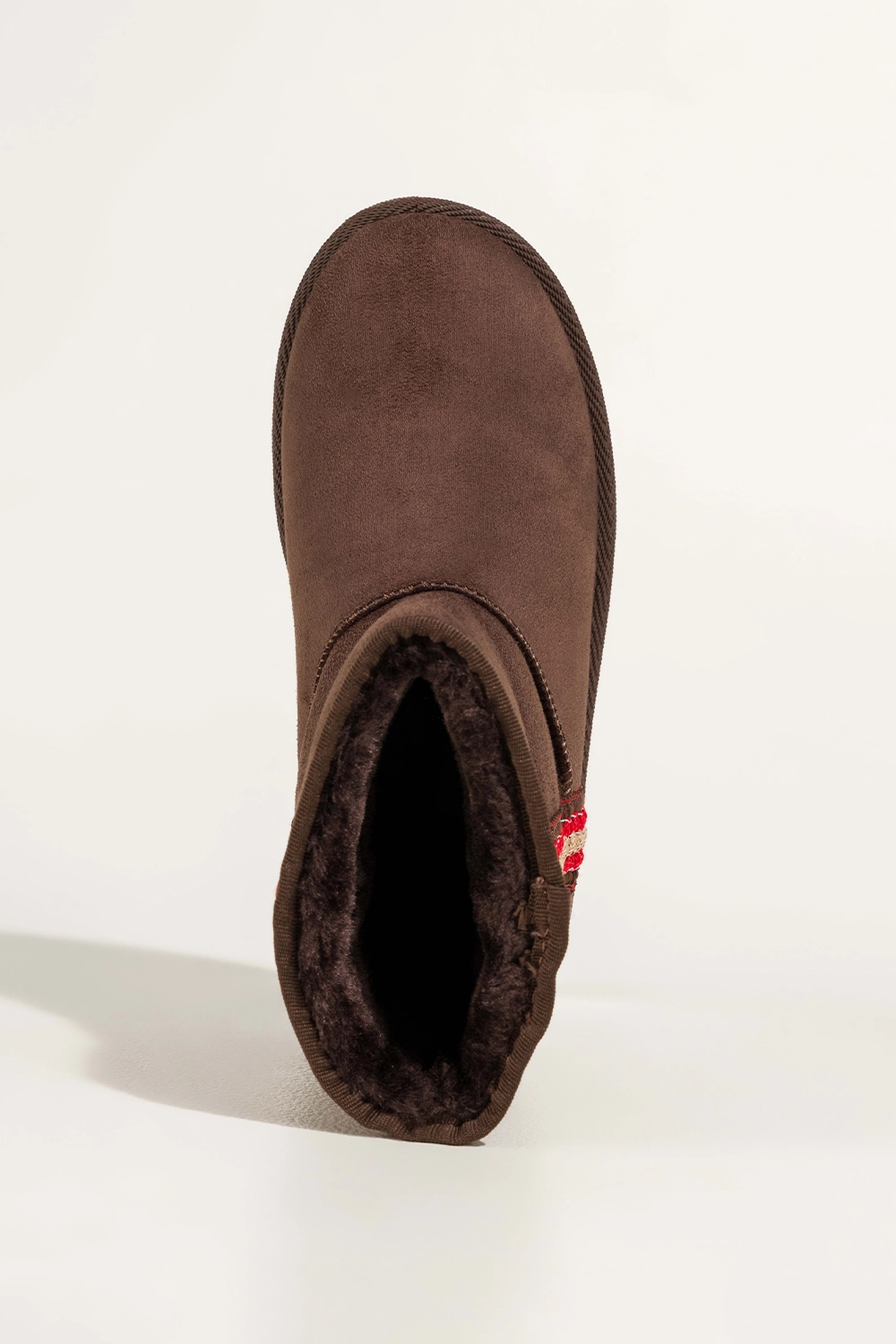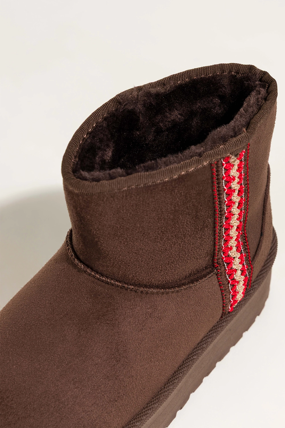 Czekoladowe śniegowce mukluki damskie na bieżnikowanej platformie z wzorzystą wstawką Casu XU-19