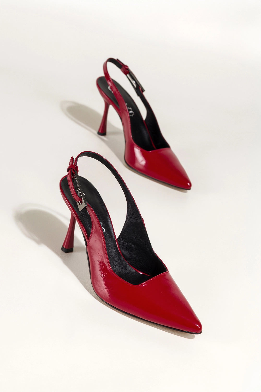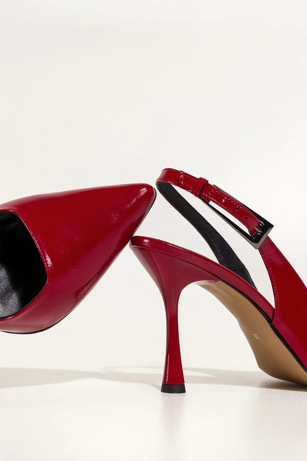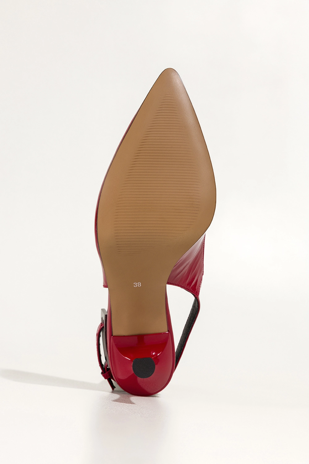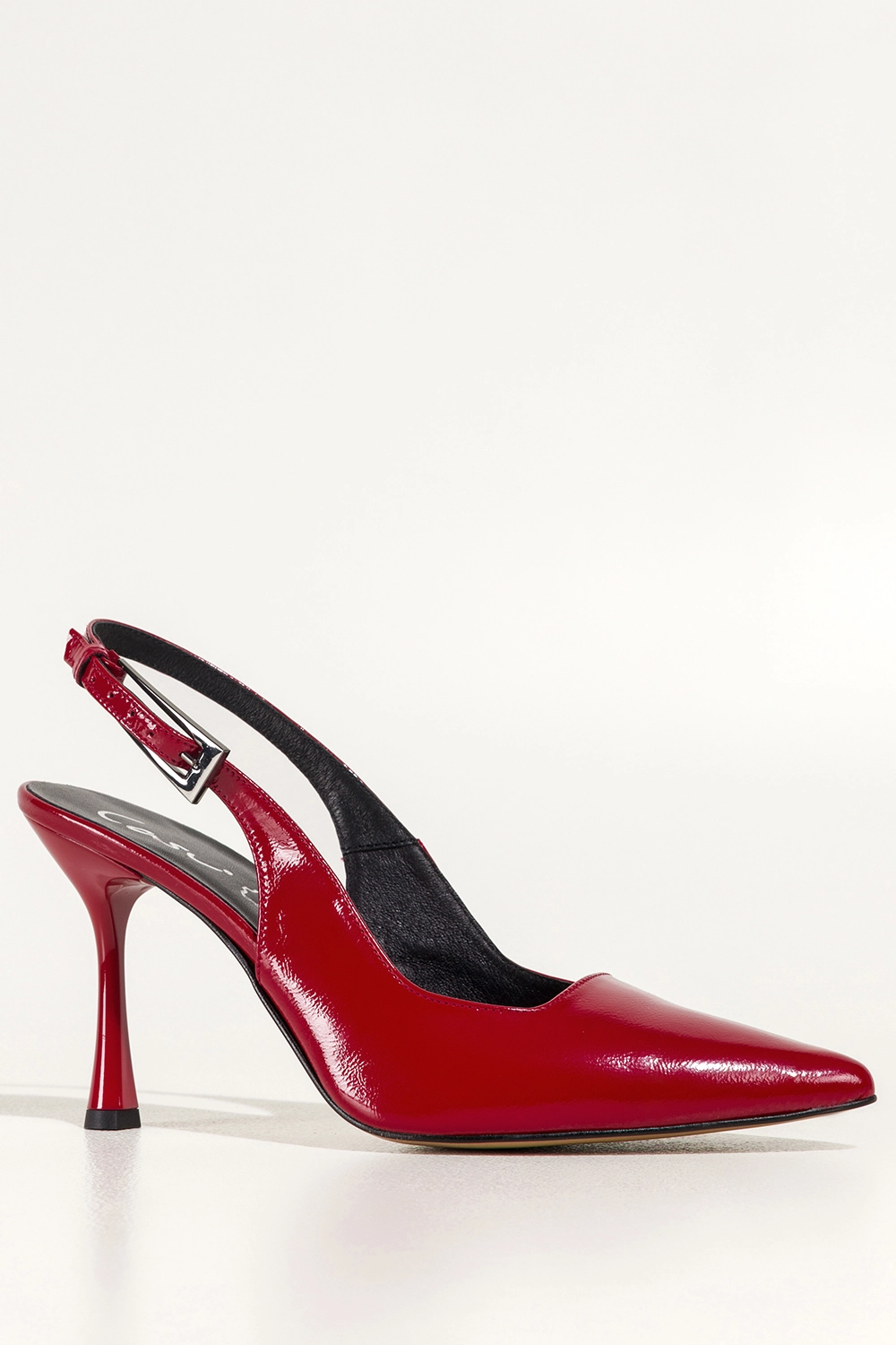Czerwone czółenka skórzane damskie szpilki lakierowane z odkrytą piętą obcas kieliszek PRODUKT POLSKI Casu 7007-381 przyciągają spojrzenia już od pierwszej chwili. Ich intensywnie czerwony kolor emanuje pewnością siebie, a szpiczasty nosek i finezyjna linia cholewki pięknie wysmuklają stopę. Model zachwyca subtelną konstrukcją z odkrytą piętą oraz stylowym paskiem zapinanym na stalową klamrę.